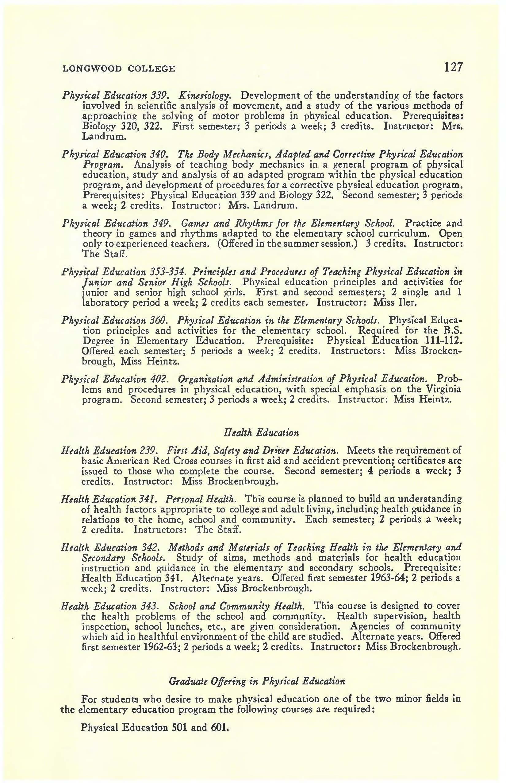 Health Education 341. Alternate years. Offered first semester 1963-64; 2 periods a week; 2 credits. Instructor: Miss Brockenbrough. Health Education 343. School and Community Health. This course is designed to cover the health problems of the school and community. Health supervision, health inspection, school lunches, etc., are given consideration. Agencies of community which aid in healthful environment of the child are studied. Alternate years. Offered first semester 1962-63; 2 periods a week; 2 credits, Instructor: Miss Brockenbrough.