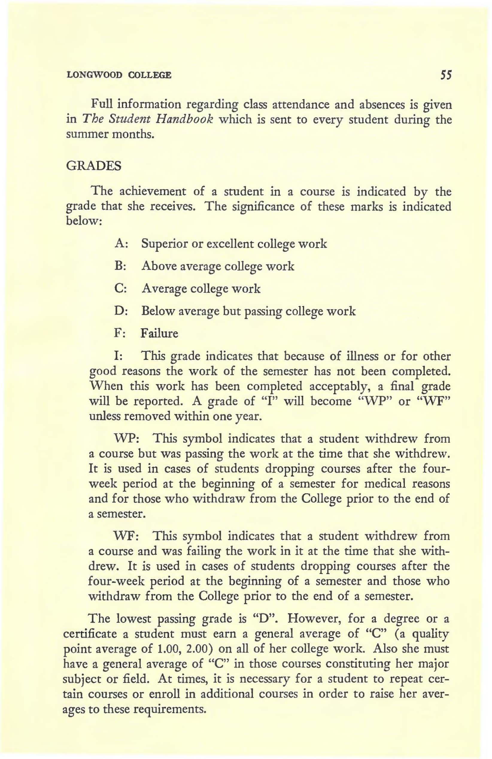The quality of work completed by a student is recognized by the assignment of points to various grades. For some years Longwood College used the "Three Point" system. By a faculty decision of December 7, 1961, a change will be made gradually to the "Four Point" system. The old system remains in effect for all students already in college prior to the change; the new system goes into effect for all students who entered in September, 1962, and thereafter.