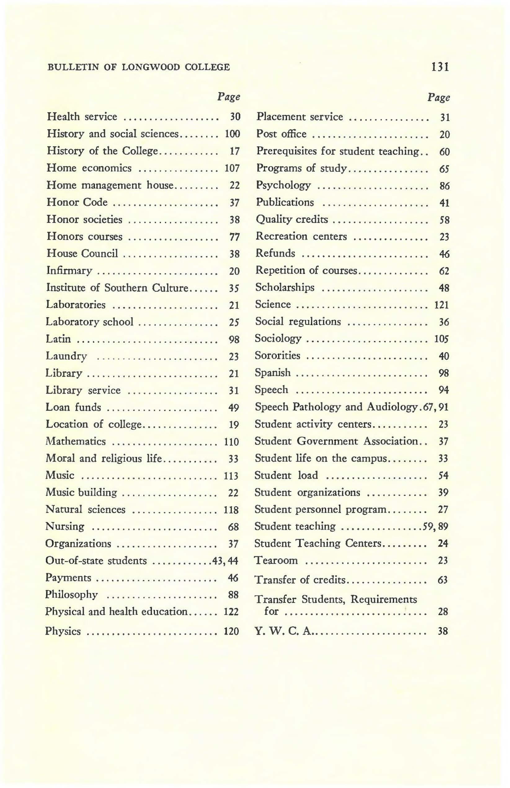 Repetition of courses. 62 Scholarships . . . . . . . . . . . . . . . . . . . . . 48 Science . . . . . . . . . . . . . . . . . . . . . . . . . . 121 Social regulations 36 Sociology . . . . . . .. . . . . . .. . . . . . . . . . 105 Laundry 23 Sororities 40