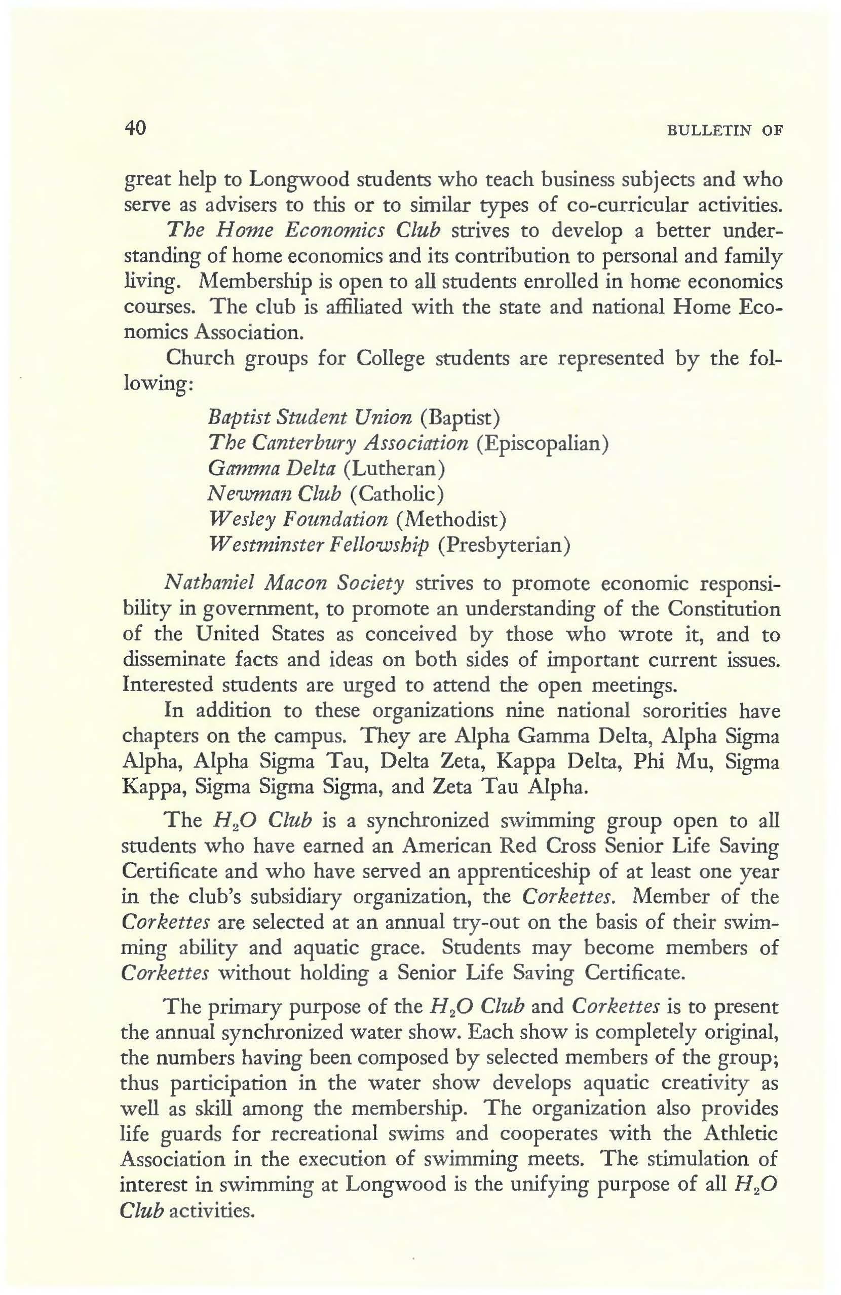 Longwood has many organizations intended to bring together students having common interests. A unique organization is the Granddaughters Club, composed of students whose mothers or grandmothers attended the College. Other student clubs include: