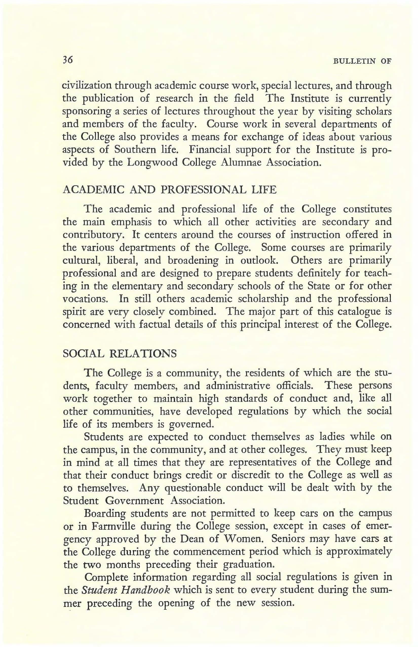 civilization through academic course work, special lectures, and through the publication of research in the field The Institute is currently sponsoring a series of lectures throughout the year by visiting scholars and members of the faculty. Course work in several departments of the College also provides a means for exchange of ideas about various aspects of Southern life. Financial support for the Institute is provided by the Longwood College Alumnae Association.