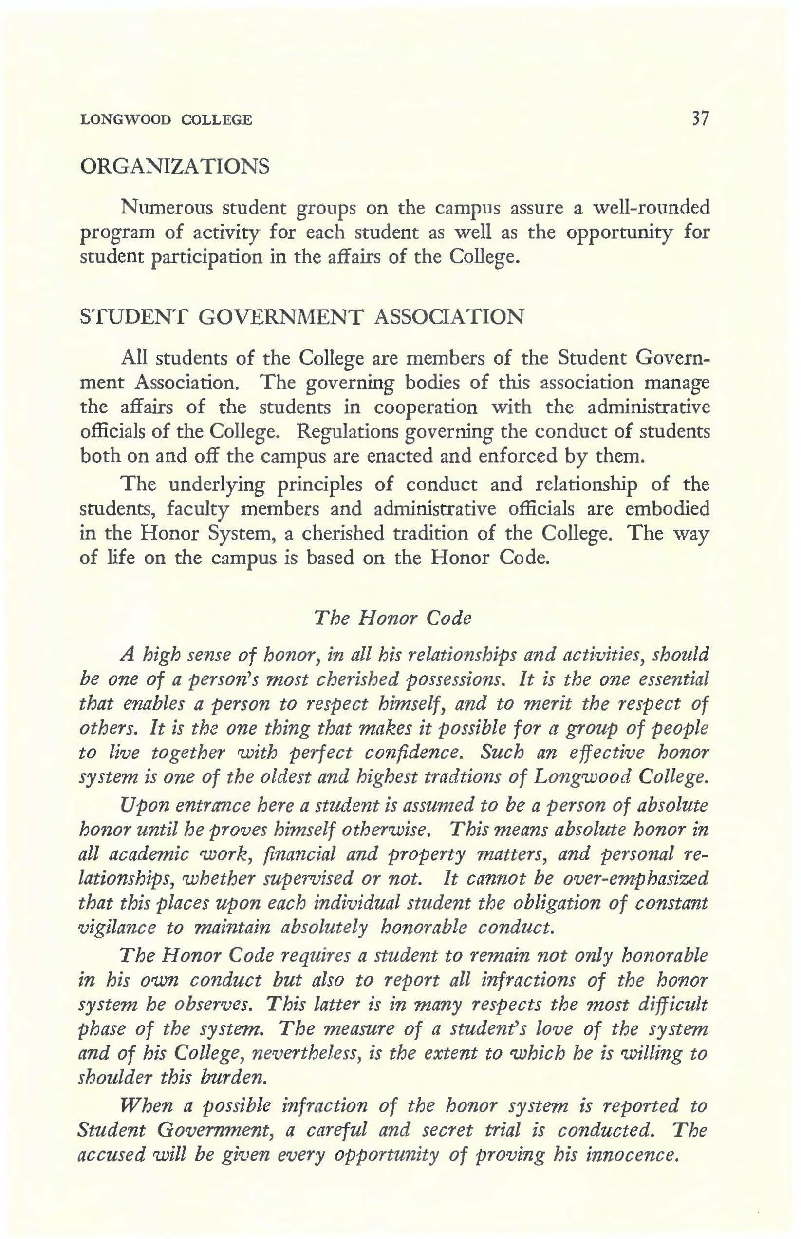 A high sense of honor, in all his relationships and activities, should be one of a person's most cherished possessions. It is the one essential that enables a person to respect himself, and to merit the respect of others. It is the one thing that makes it possible for a group of people to live together with perfect confidence. Such an effective honor system is one of the oldest and highest tradtions of Longwood College.