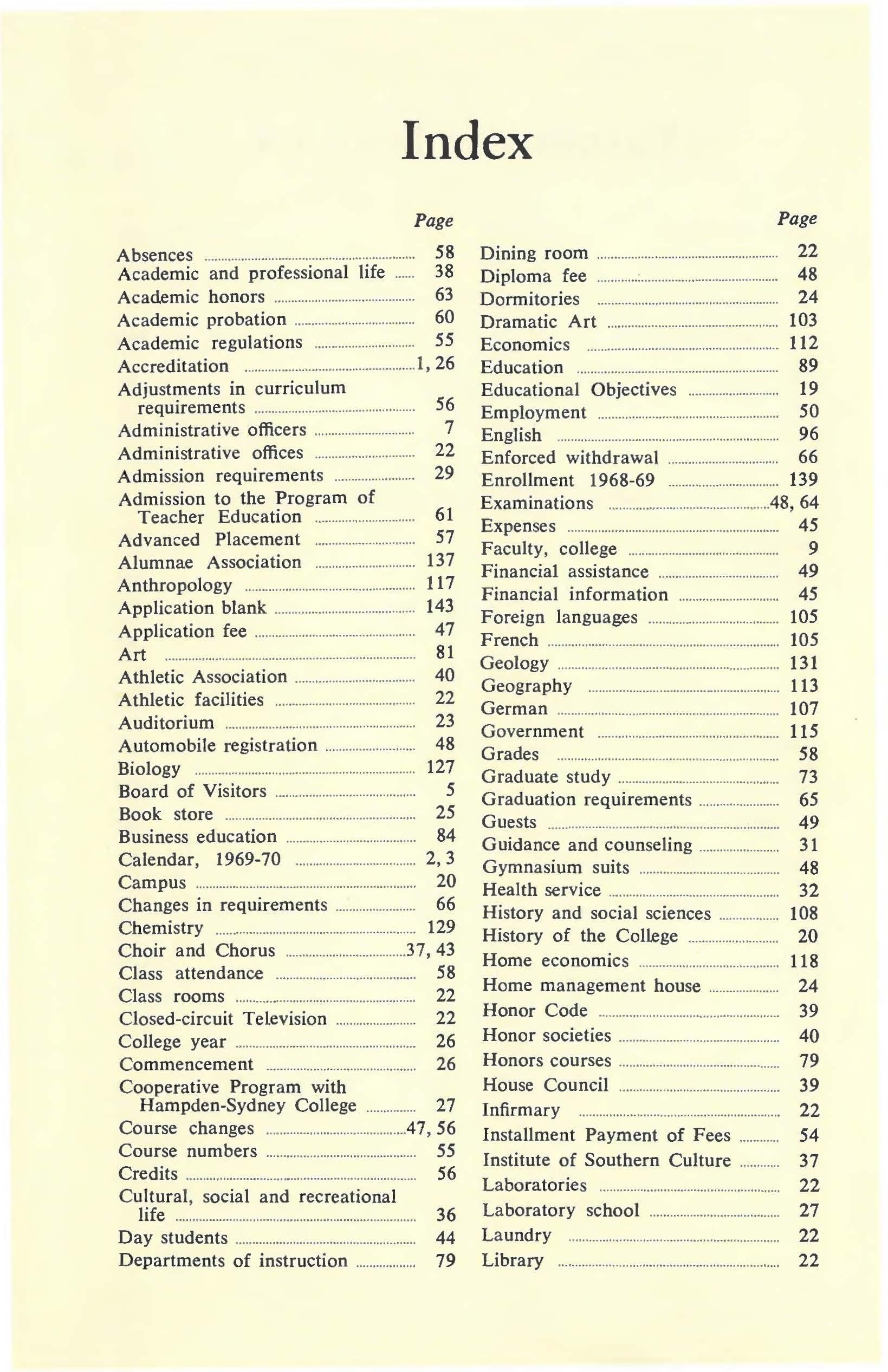 Adjustments in curriculum requirements 56 Administrative officers .............................. 7 Administrative offices 22 Admission requirements 29 Admission to the Program of Teacher Education 61 Advanced Placement .............................. 57 Alumnae Association 137 Anthropology ..................... ............................ 117 Application blank .......................................... 143 Application fee ................................................ 47 Art 81 Athletic A ssociation 40 Athletic facilities ................. ........................ 22 Auditorium 23 Automobile registration ........................... 48 Biology .................................................................. 127 Board of Visitors 5 Book store ... ... ................................................... 25 Business education ........... ............................ 84 Calendar, 1969-70 2, 3 Campus .................................................................. 20 Changes in requirements 66 Chemistry ...................................................... .... 129 Choir and Chorus .37, 43 Class attendance 58 Class rooms 22 Closed-circuit Television ........... 22 College year 26 Commencement ................................ 26 Cooperative Program with Hampden-Sydney College 27 Course changes ..47 , 56 Course numbers ............................................. 55 Credits ......... .................. .. ..................... ................... 56 Cultural , social and recreational life ...... ... ........ ............... .......... ... ...... ........ ... .......... 36 Day students Departments of instruction 44 79