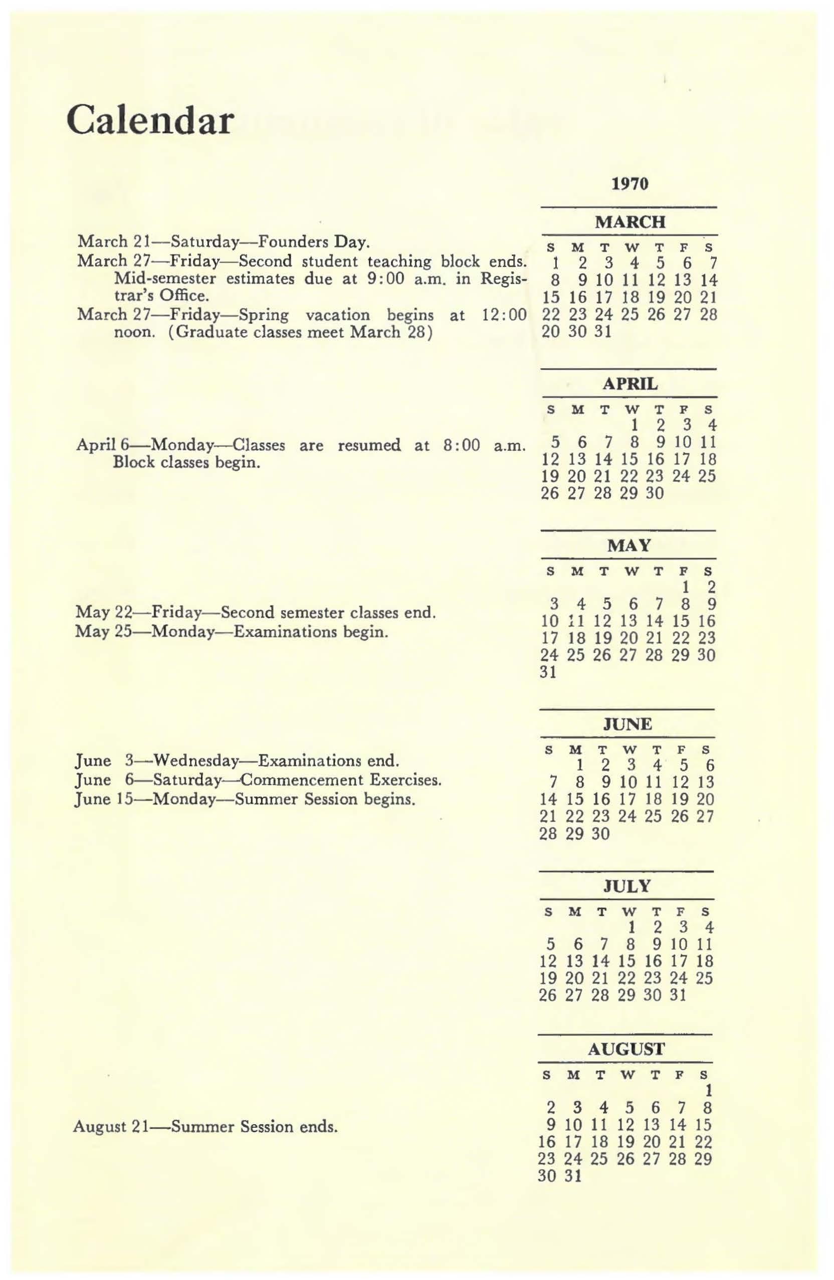 June 3-Wednesday-Examinations end. June 6-Saturday-Commencement Exercises. June 15-Monday-Summer Session begins.
