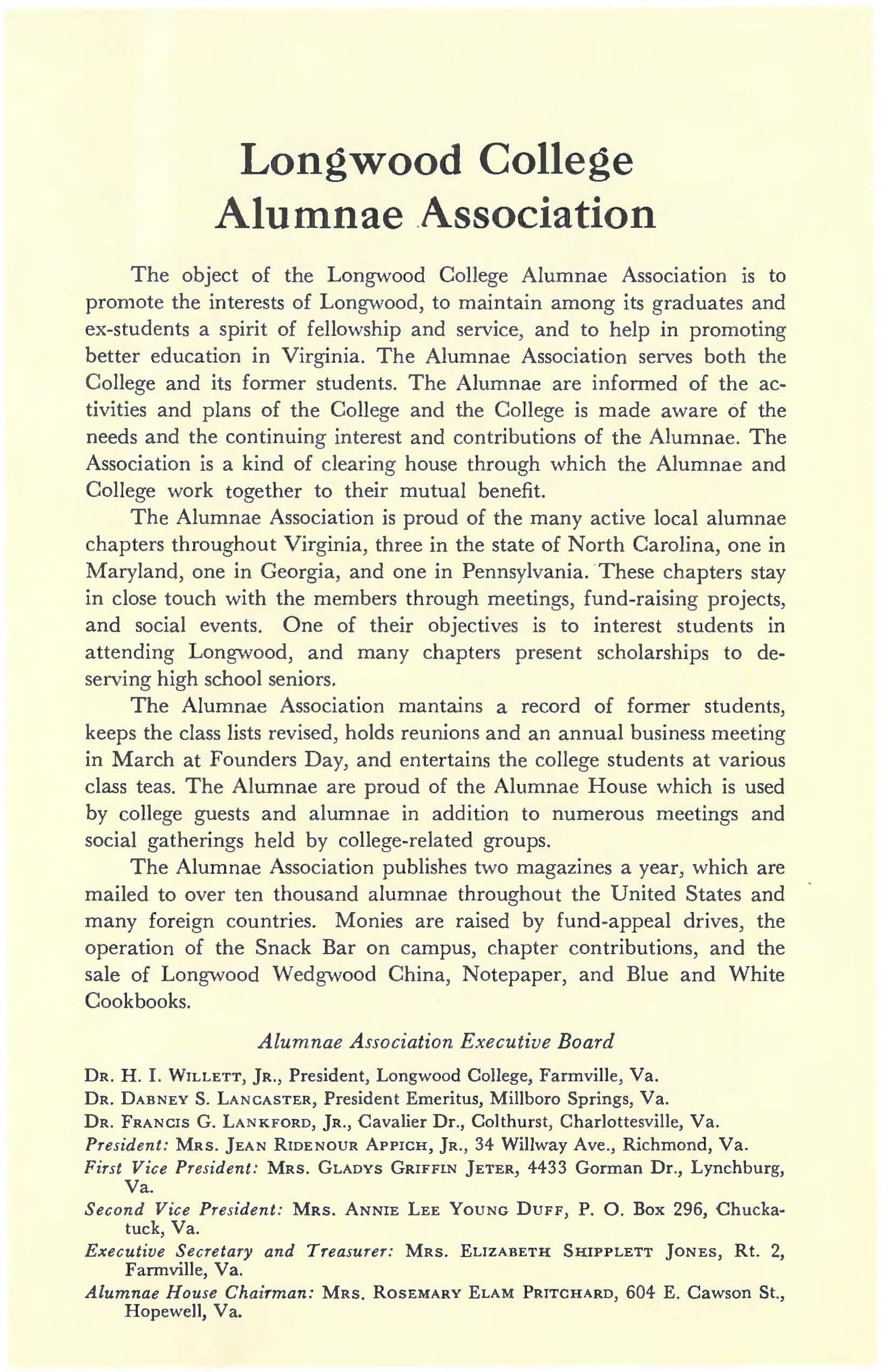 The object of the Longwood College Alumnae Association is to promote the interests of Longwood, to maintain among its graduates and ex-students a spirit of fellowship and service, and to help in promoting better education in Virginia. The Alumnae Association serves both the College and its former students. The Alumnae are informed of the activities and plans of the College and the College is made aware of the needs and the continuing interest and contributions of the Alumnae. The Association is a kind of clearing house through which the Alumnae and College work together to their mutual benefit.