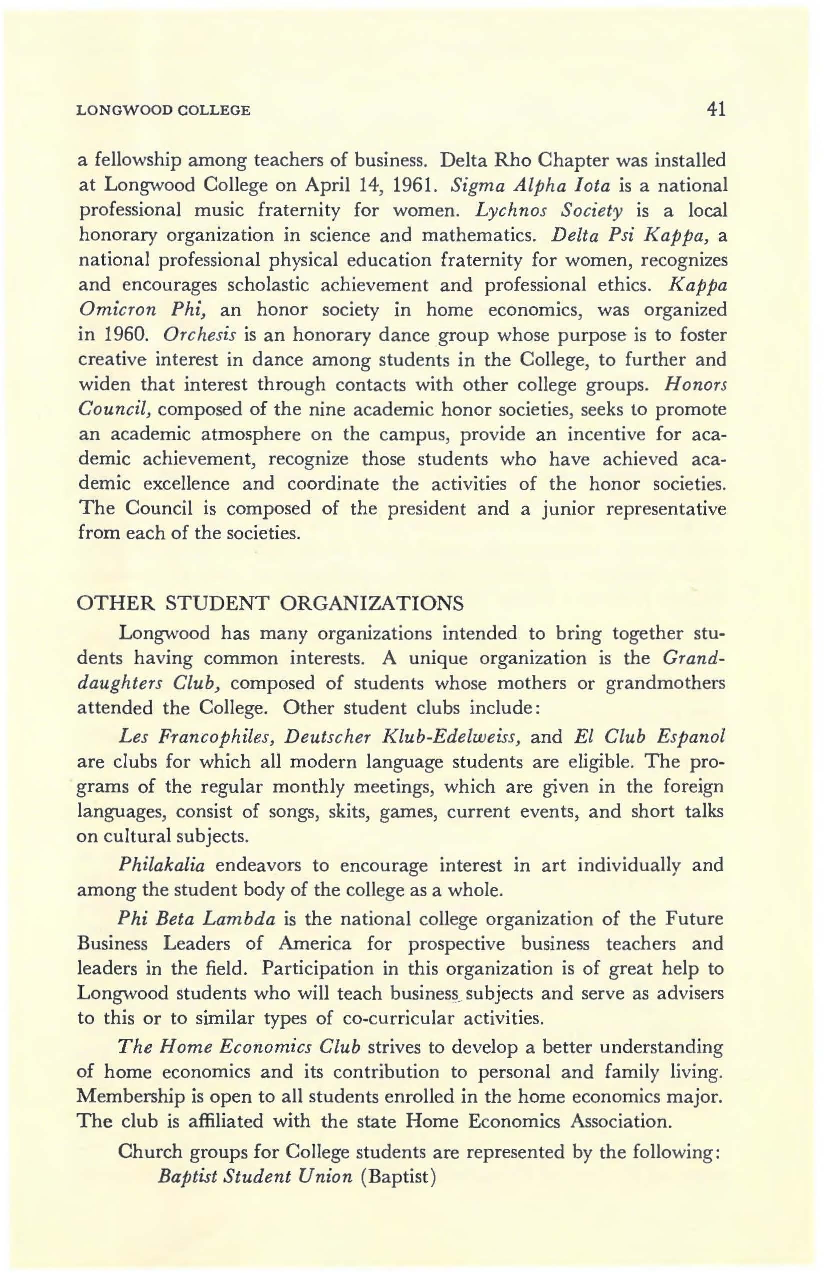 a fellowship among teachers of business. Delta Rho Chapter was installed at Longwood College on April 14, 1961. Sigma Alpha Iota is a national professional music fraternity for women. Lychnos Society is a local honorary organization in science and mathematics. Delta Psi Kappa, a national professional physical education fraternity for women, recognizes and encourages scholastic achievement and professional ethics. Kappa Omicron Phi, an honor society in home economics, was organized in 1960. Orchesis is an honorary dance group whose purpose is to foster creative interest in dance among students in the College, to further and widen that interest through contacts with other college groups. Honors Council, composed of the nine academic honor societies, seeks to promote an academic atmosphere on the campus, provide an incentive for academic achievement, recognize those students who have achieved academic excellence and coordinate the activities of the honor societies. The Council is composed of the president and a junior representative from each of the societies.
