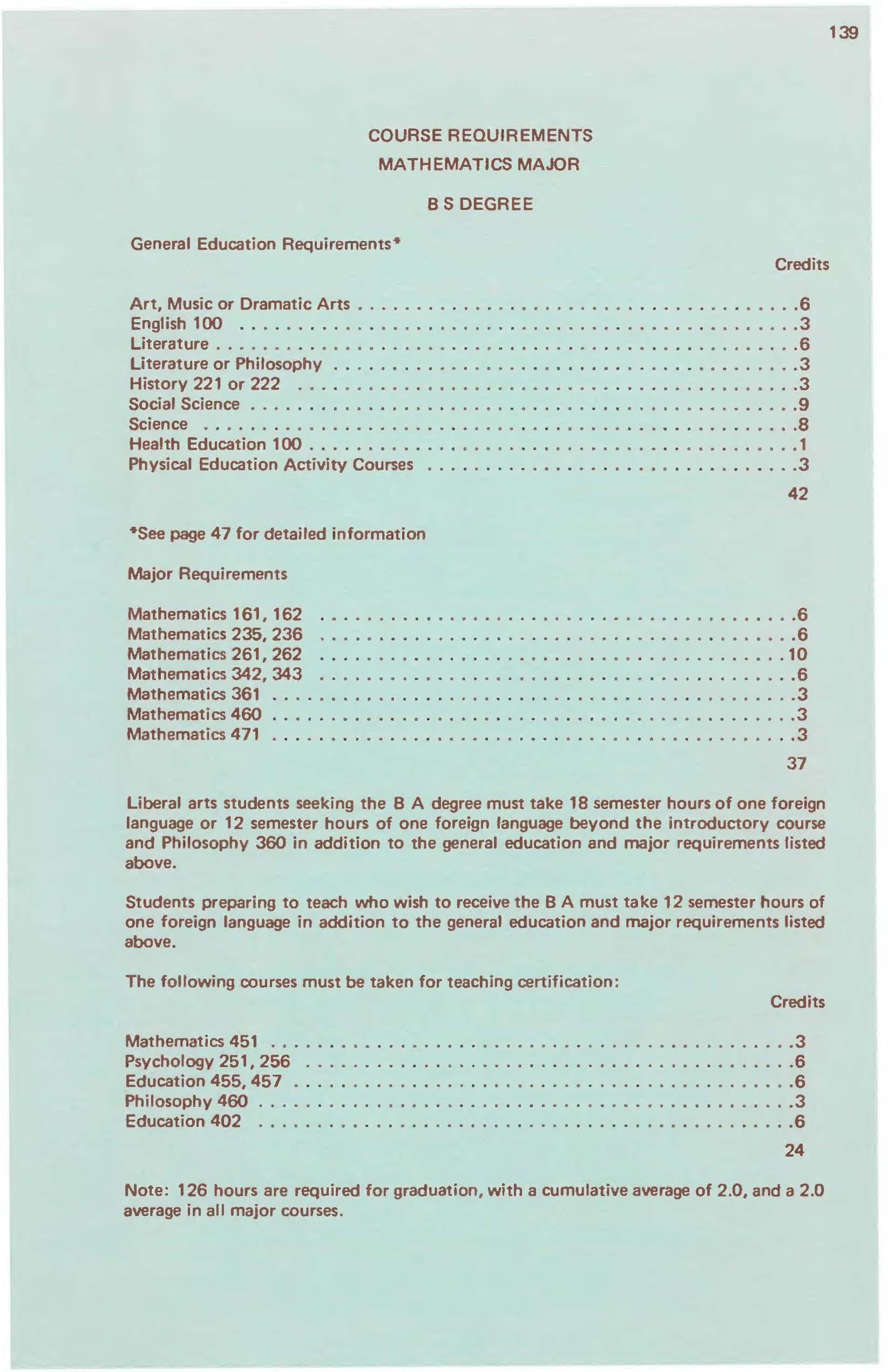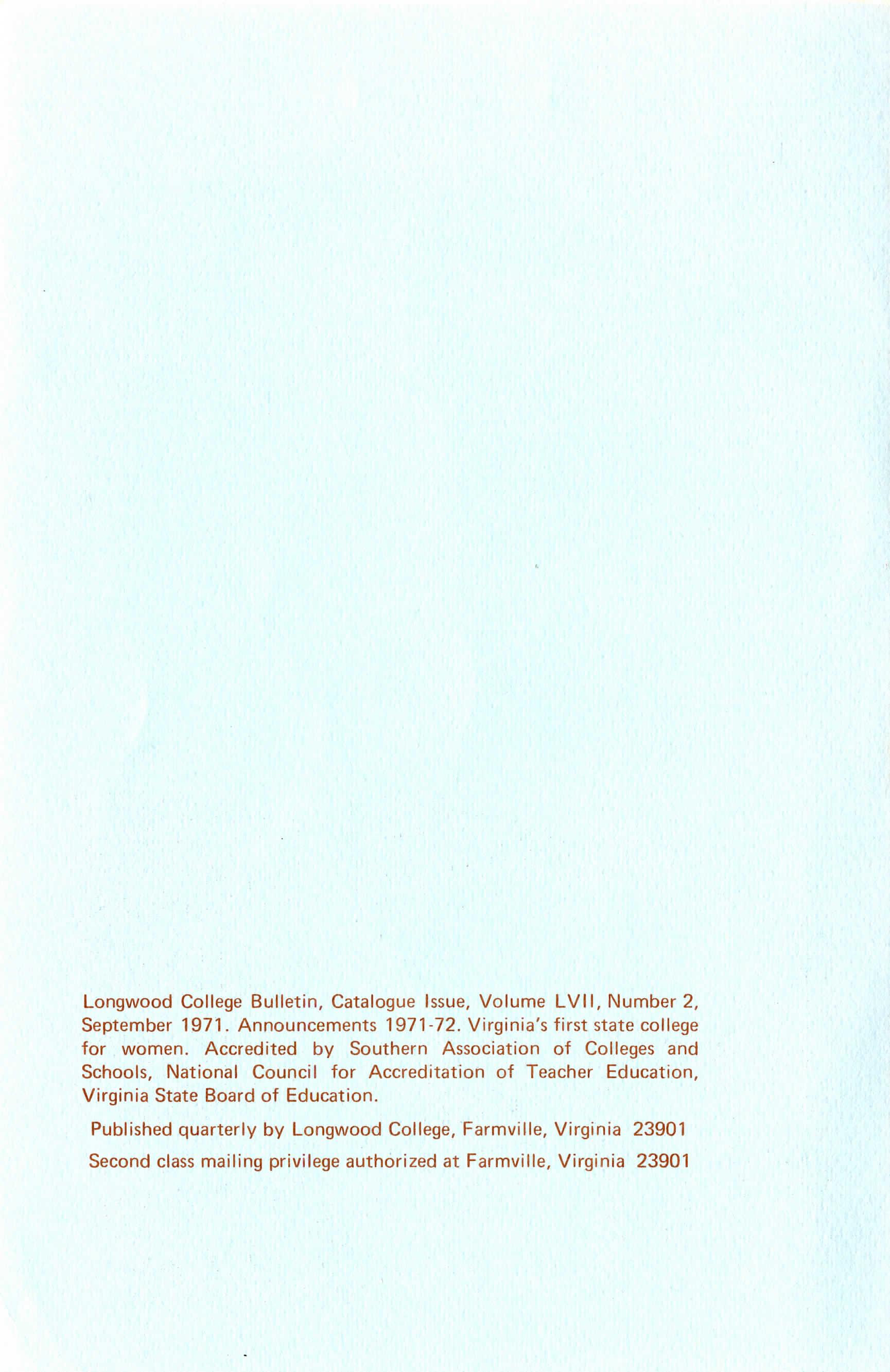 The primary educational objective of Longwood College is to provide a baccalaureate curriculum distinguished by academic excellence. Particular attention is given to teacher preparation; pursuant to the goal of academic excellence, every effort is made to combine a strong liberal arts approach with this professional emphasis. The College also offers liberal arts degrees without teacher certification, as well as social welfare, office administration, and pre-professional medical curricula . Details of various departmental offerings may be found in the catalogue section on Departments of Instruction. Four undergraduate degrees are offered: Bachelor of Arts, Bachelor of Science, Bachelor of Science in Business Education and Bachelor of Music Education . In addition, Longwood College provides a graduate program leading to the Master's degree for persons who wish additional preparation for teaching in the elementary and secondary schools, or for supervisory or counseling work. Degrees are presently available with concentrations in education, English and history. The College will continue to study the need for additional Master's degree programs, in.eluding such disciplines as the natural sciences and physical education. Longwood College is pledged to a policy of non-discrimination because of race or religion. The policy of nondiscrimination applies to all phases of college life including admissions.