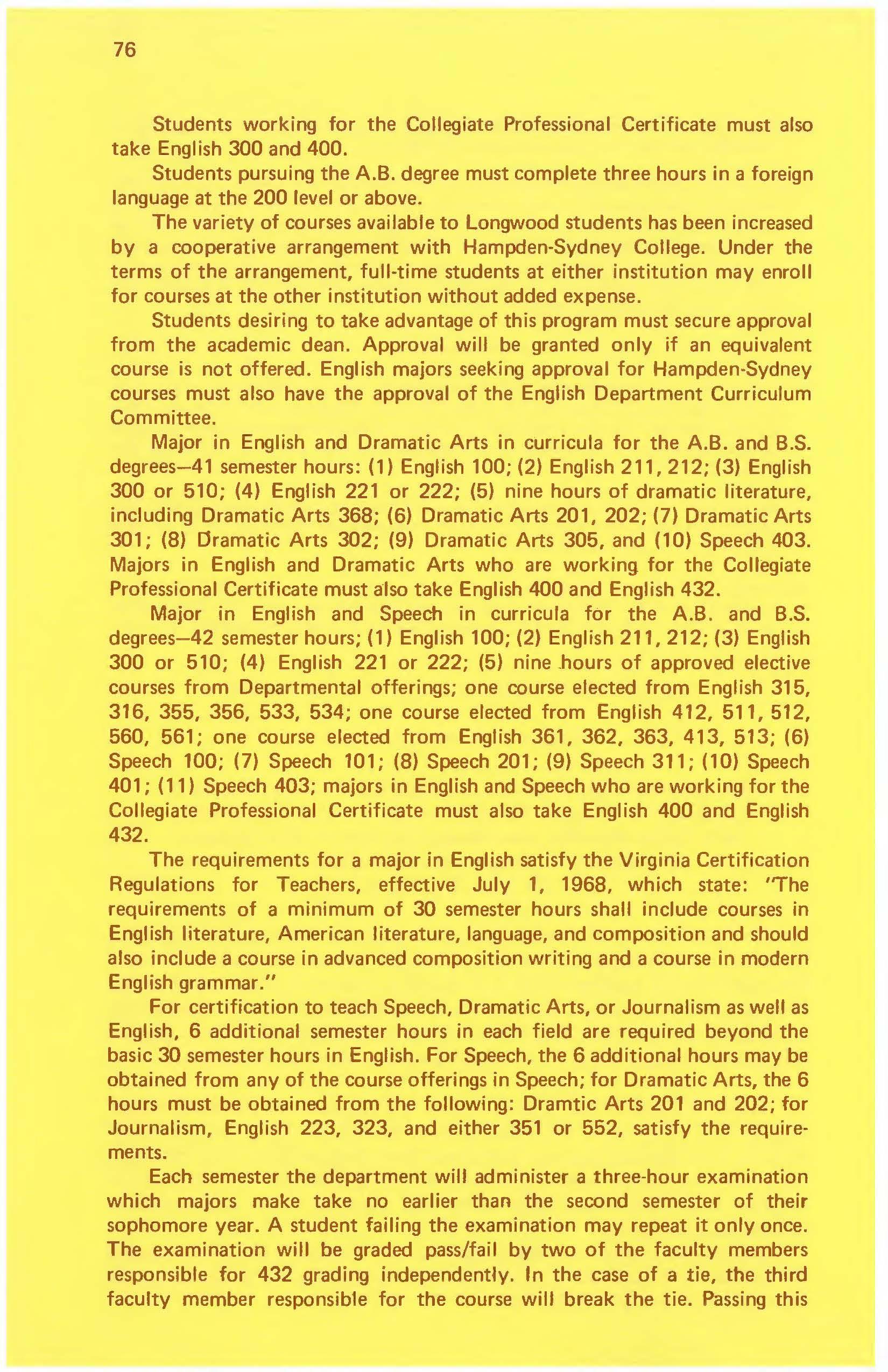 Major in English and Dramatic Arts-41 semester hours: English 100, 211, 212, 221 or 222, 300 or 510; Dramatic Arts 201, 202, 301, 302, 305; Speech 403; and nine hours of dramatic literature, including Dramatic Arts 368. The major in English and Dramatic Arts who is working for the Collegiate Professional Certificate must also take English 400 and 432.