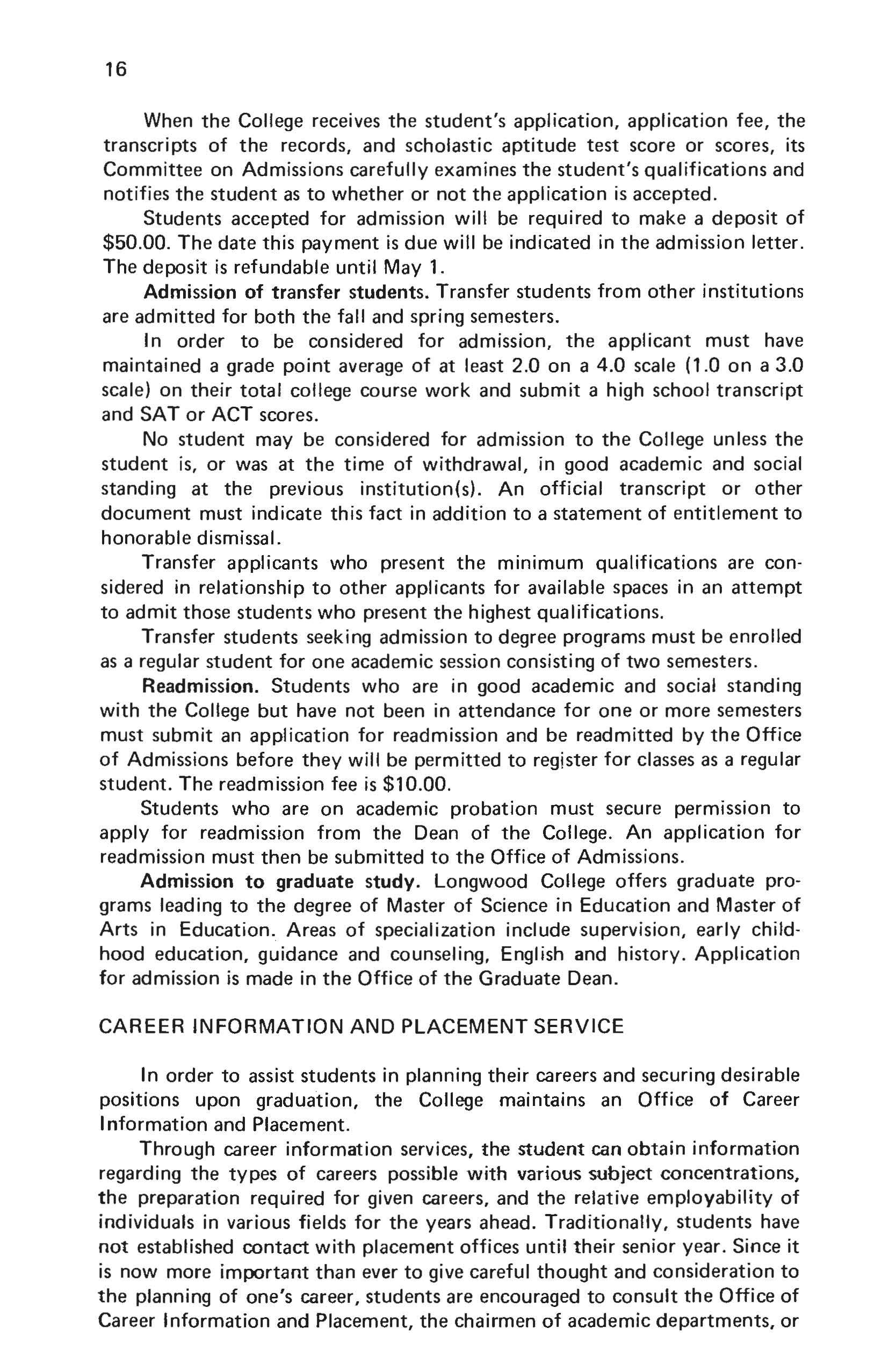 Four undergraduate degrees are offered: Bachelor of Arts, Bachelor of Science, Bachelor of Science in Business Education and Bachelor of Music Education. In addition, Longwood College provides a graduate program leading to the Master's degree for persons who wish additional preparation for teaching in the elementary and secondary schools, or for supervisory or counseling work. Degrees are presently available with concentrations in education, English and history. Longwood College is pledged to a policy of non-discrimination because of race or religion. The policy of nondiscrimination applies to all phases of college life including admissions.
