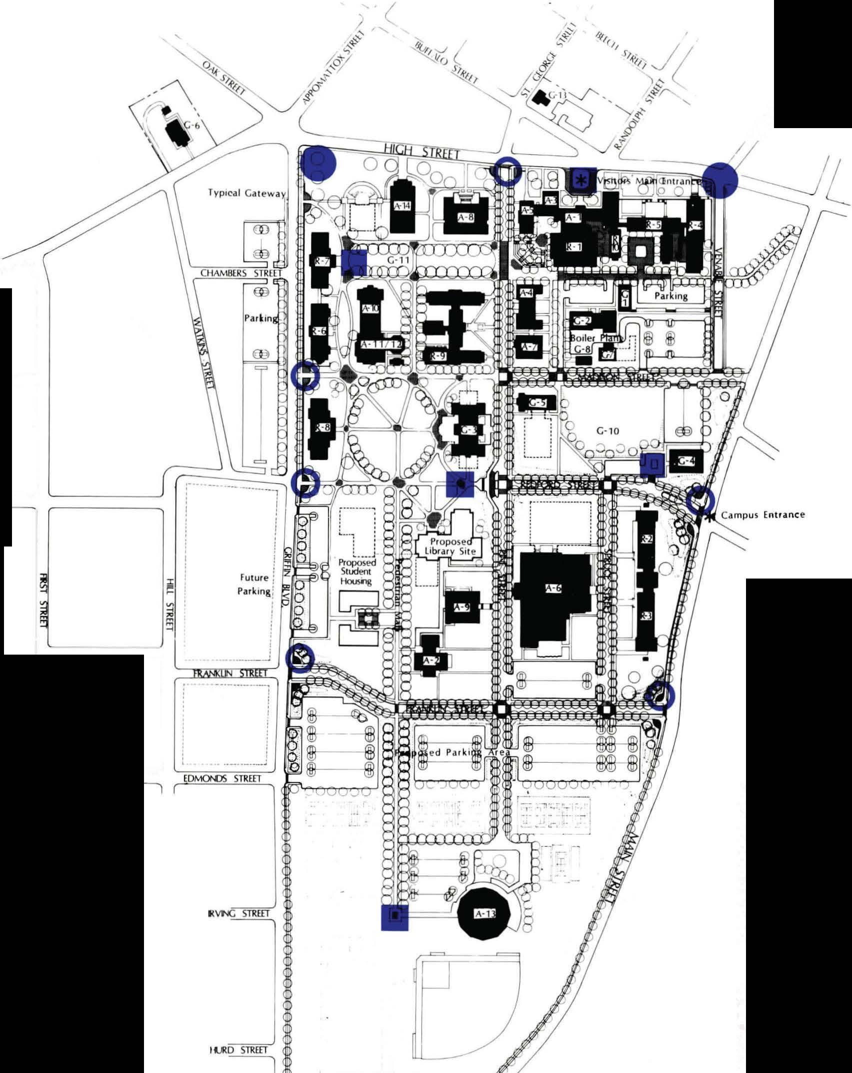 Athoroughanalysisofthesiteprovides information that leads to the logical placementofnewbuildingsandfacilities. Thisinformationwillhelpdeterminethe locationofthenewlibraryandstudent housingsites-siteswhichwillbechosenaftercarefulconsiderationoftheir relationtotheexistingcampusaswellas anexpandedcampus.