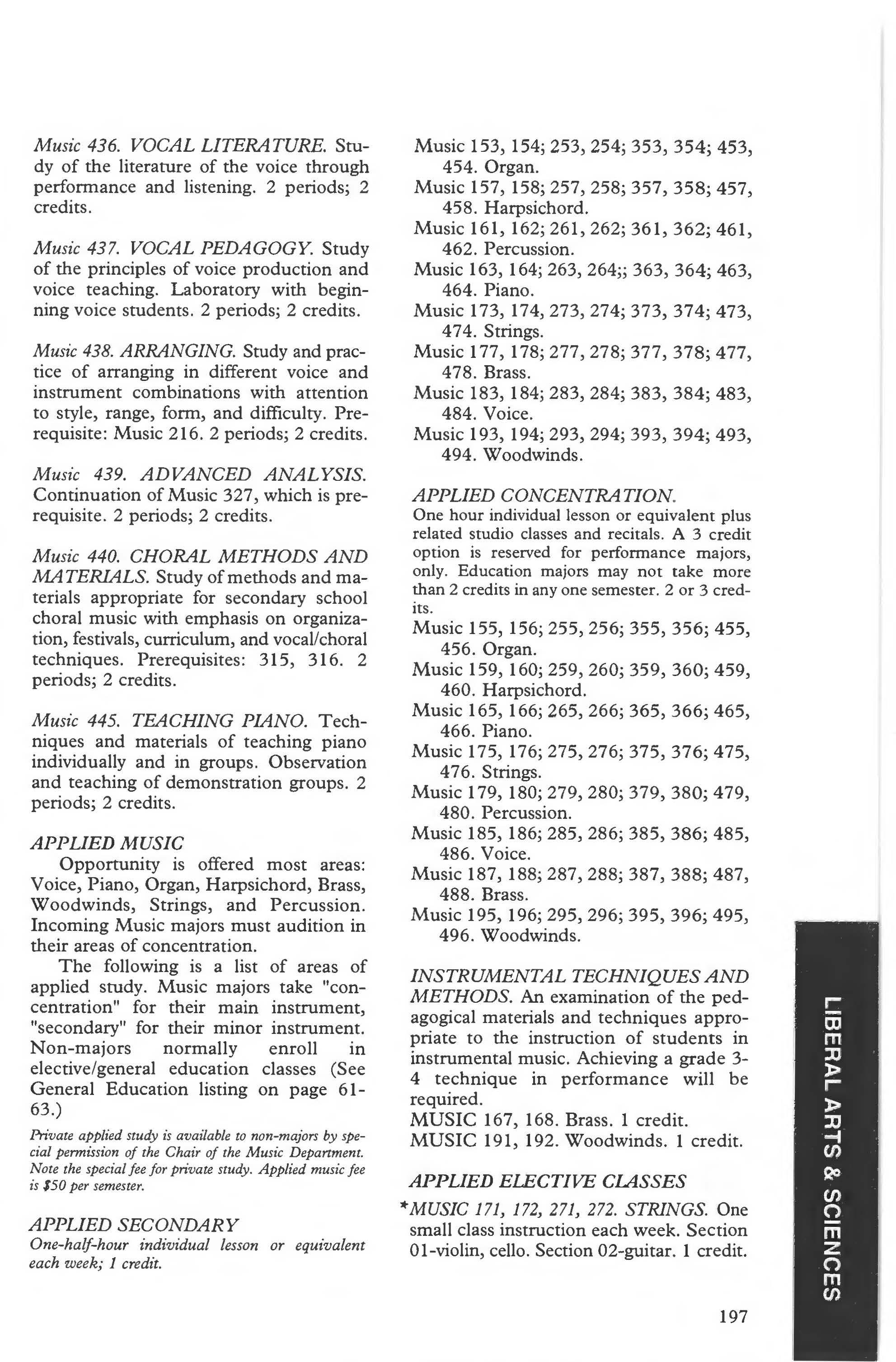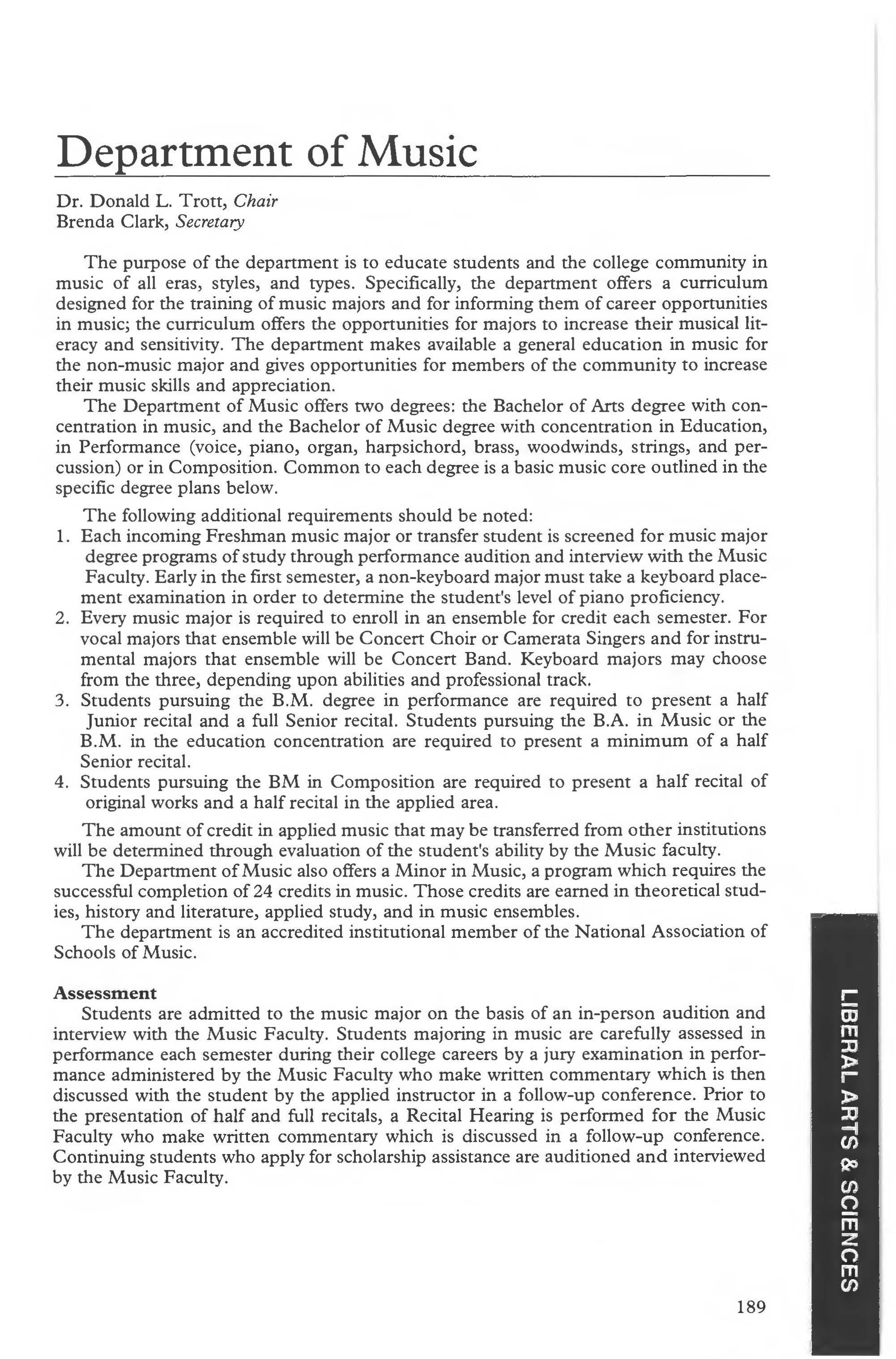 Music, Bachelor of Music Concentration in Composition .. 193 Music, Bachelor of Music Concentration in Education 190-191 Music, B.A. in Visual and Performing Arts Concentration in Music 190 Music, Bachelor of Music Concentration in Performance 192-193 Music Courses ... .. .... . .. 194-198 Music, Department of 189 Music Minor . . .. ........ .. . 194 Natural Sciences, Dept. of .... .. . 200 Non-traditional Students 13 Orientation . . . .. . .. . . ....... . .30 Part-Time Students . . . .......... 20 Pass/Fail Courses .. . . ... ... ..... 43 Payment of Fees Plan . ........... 18 Philosophy Courses .. ....... 155-157 Philosophy Program ...... . . .... 155