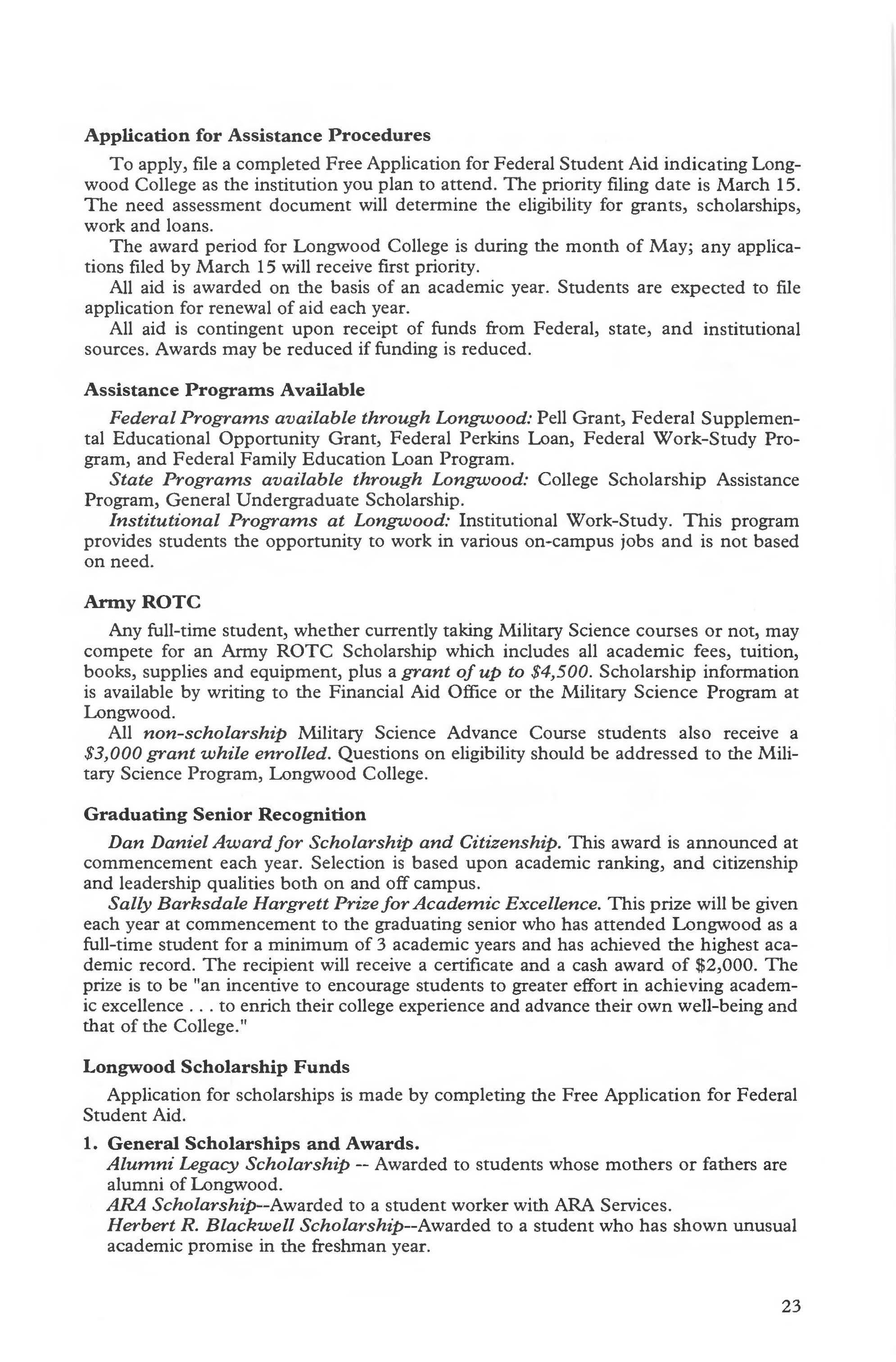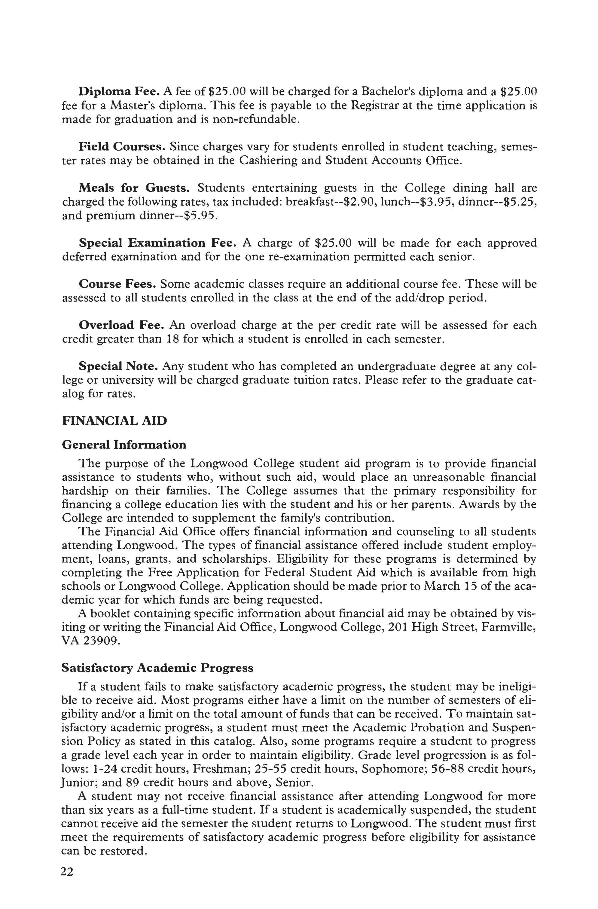 Faculty, Longwood 255-263 Fees & Expenses for Students 17 Late Payment Fee 21 Finance Courses 84-85 Financial Aid 22-27 Assistance Programs, Federal and State 23 ROTC 23 Outside Programs ............ 27 Scholarships 23-27 Financial Aid Application Procedures .... ..... ...... .. 23 French 158 French Courses . . . . . ....... 160-161 Freshmen, Admission Requirements .11 Freshman Year Requirement ...... 57 General Education ........... 61-63 General Education Requirements ... 57 General Studies Degree ...... . .. 134 General Studies Program ...... .. 134 Geography Courses ......... 214-215 Geography Program ........ . ... 214 German .......... ......... .. 158 German Courses ... ....... . 161-163 Grade Appeals ........... ... 44-45 Grade Estimates 44 Grade Level Progression 22 Grades 42-43 Quality Point/Quality Hours 44 Grades, Parental Access 48 Graduate Program 53 Graduation Honors 22, 59 Graduation Requirements 57 Guests, Food Prices 22 Halifax/South Boston Continuing Education Center 65 Hargrett Prize .. ....... ยท........ 23 Health Courses ............ 118-119 Health, Physical Education, & Recreation, Dept. of ...... ... . 110 Health and Physical Education Program . . ..... 110-111