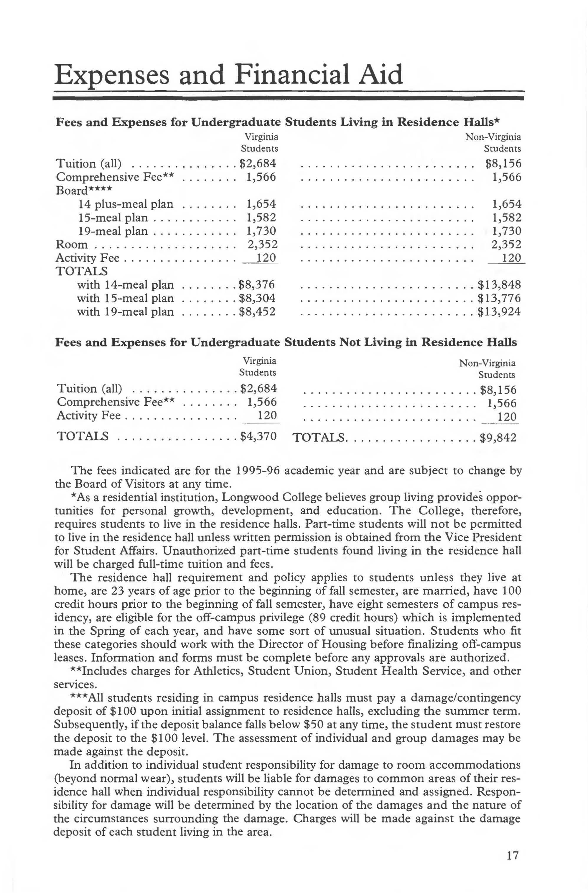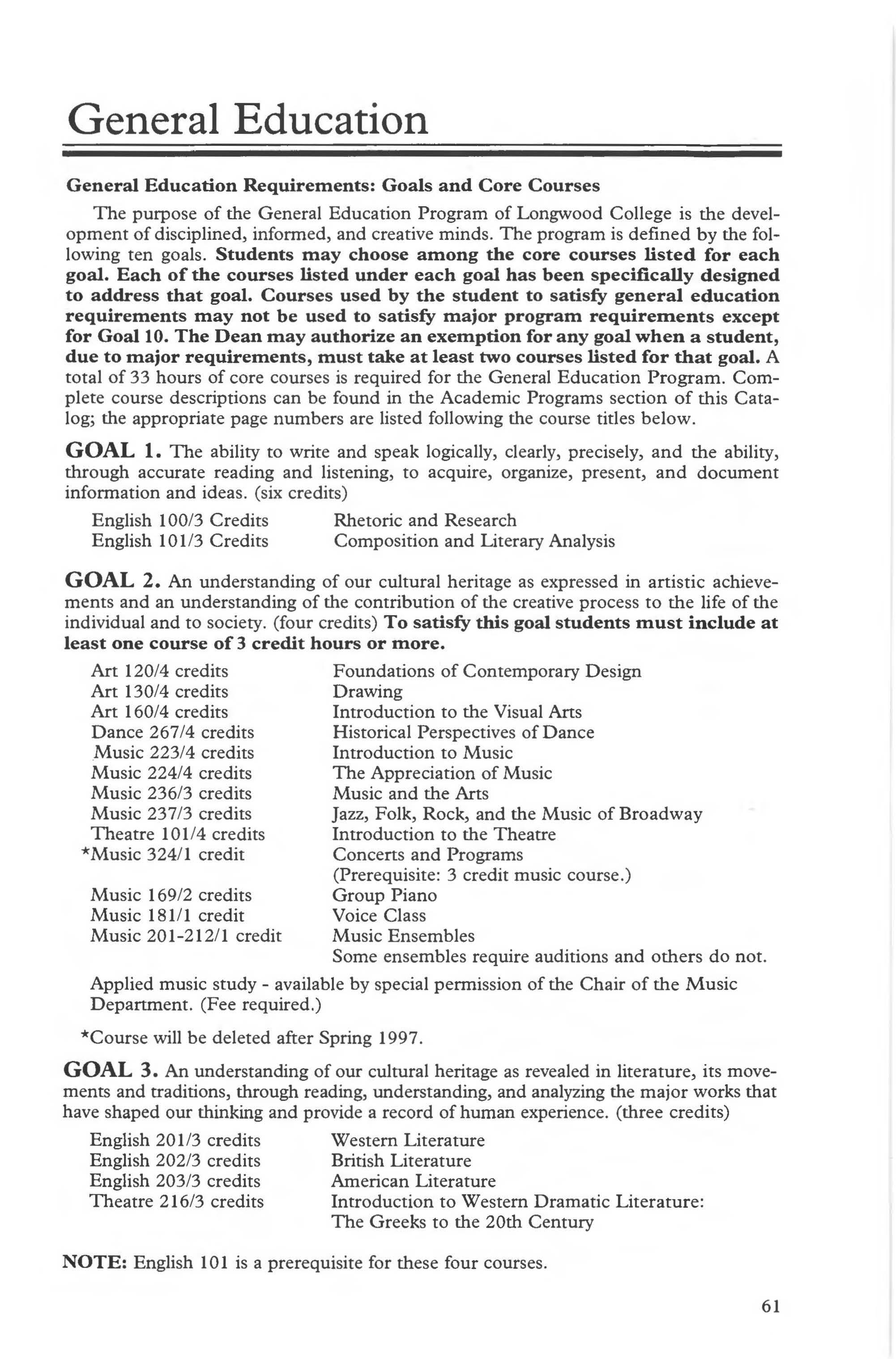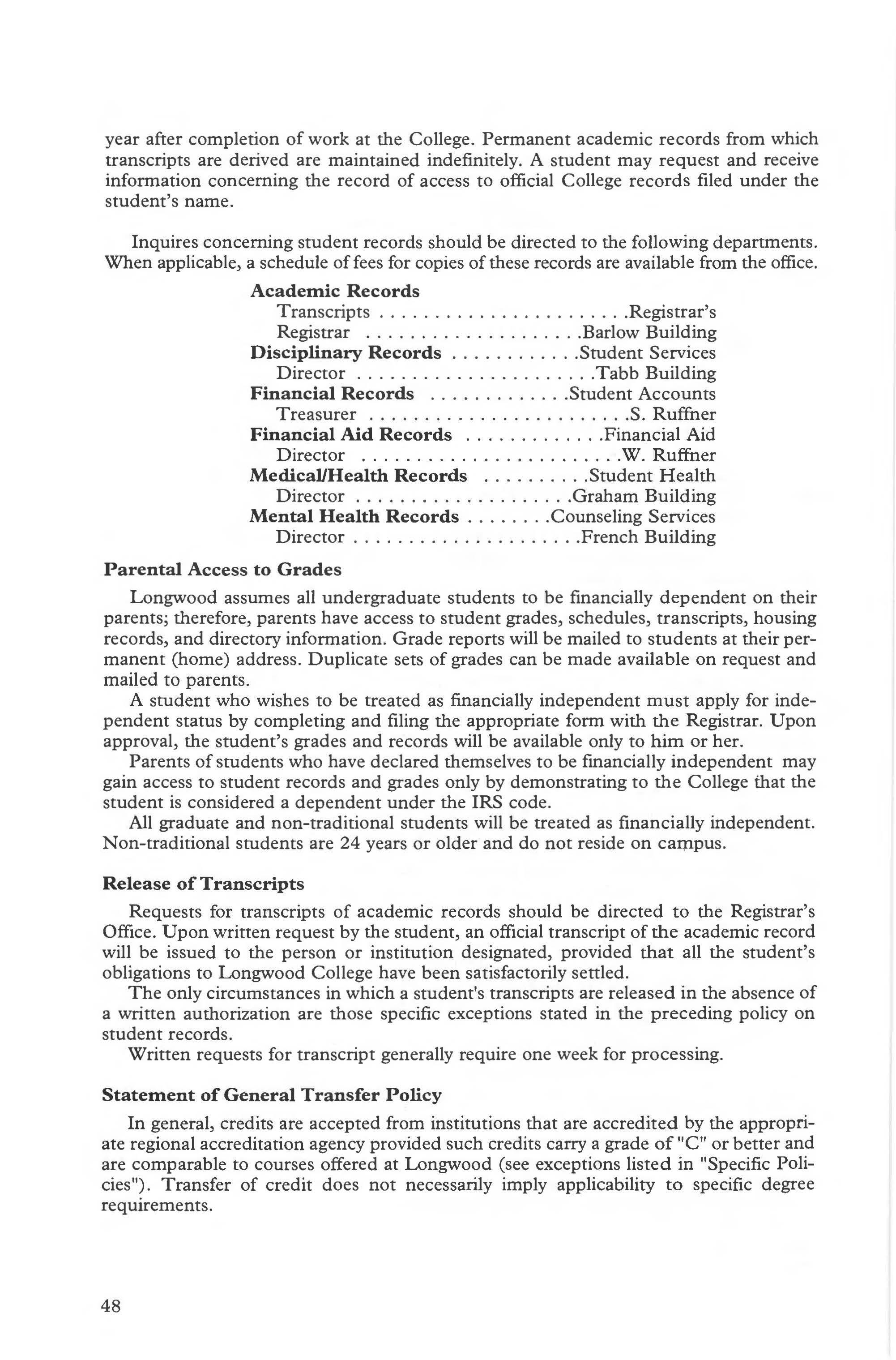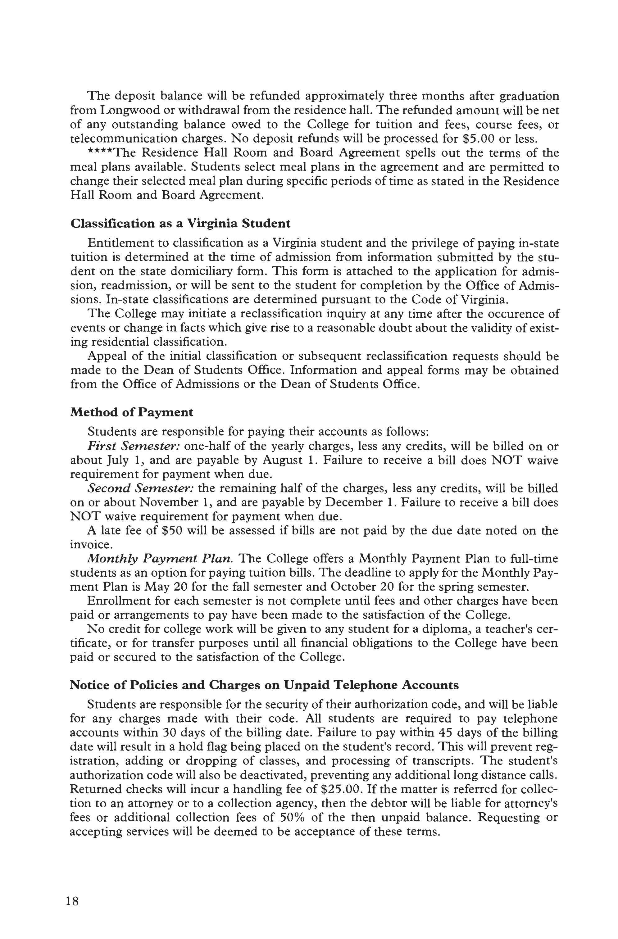 This catalog describes academic course numbers, descriptions, and standards for student progress and retention at the time of publication. However, the provisions of this publication are not to be regarded as an irrevocable contract between the student and Longwood College. There are established procedures for making changes which protect the institution's right to make changes deemed appropriate. A change of curriculum or graduation requirement is not made retroactive unless the alteration is to the student's advantage and can be accommodated within the span of years normally required for graduation .