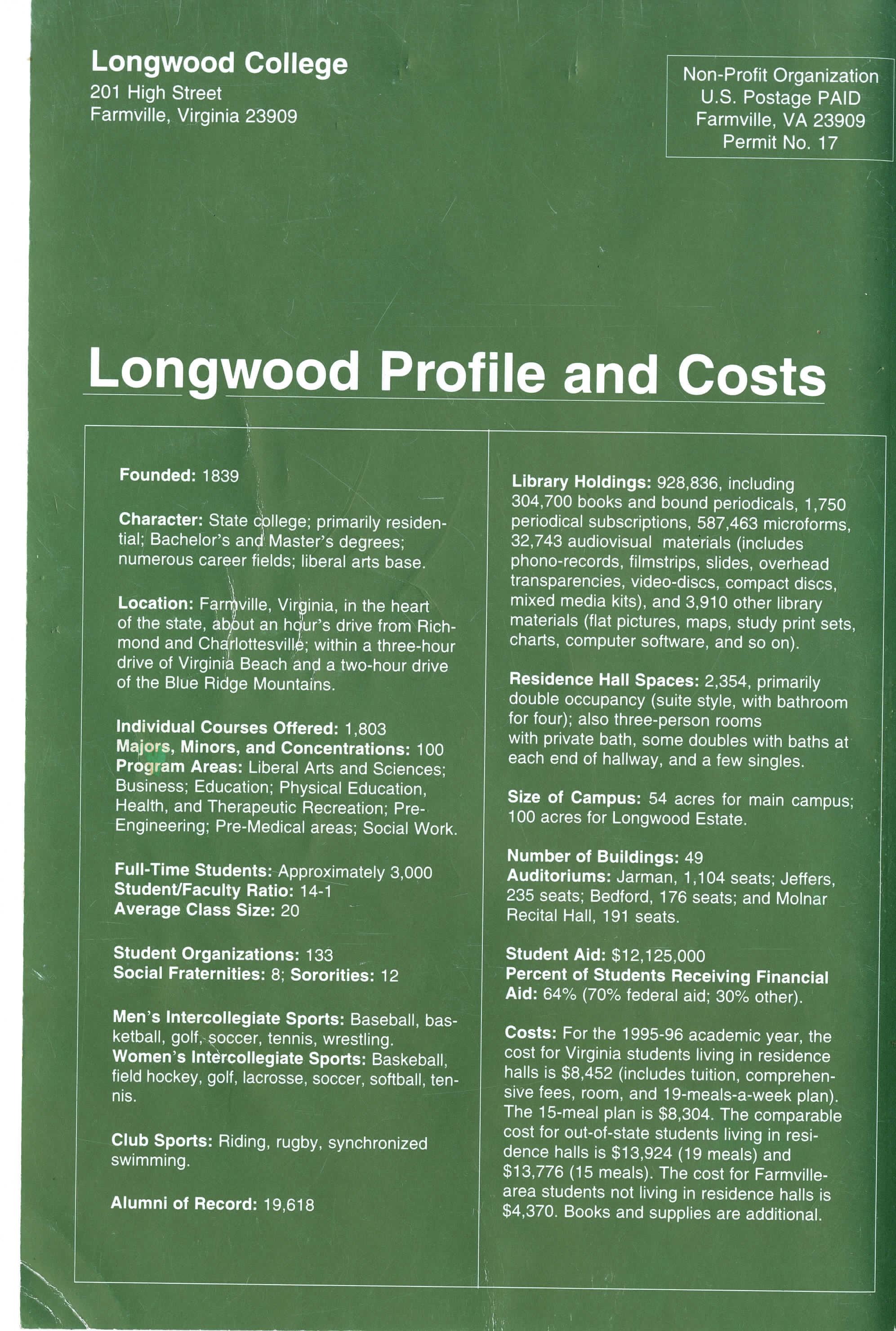Longwood College, founded in 1839, is a medium-size, state-assisted, coeducational, largely residential, comprehensive college offering programs leading to the bachelor's and master's degrees. Longwood offers courses both on the main campus and at educational sites in other locations. As a state-assisted institution of higher education, Longwood College is committed to the principles of equal opportunity and affirmative action.