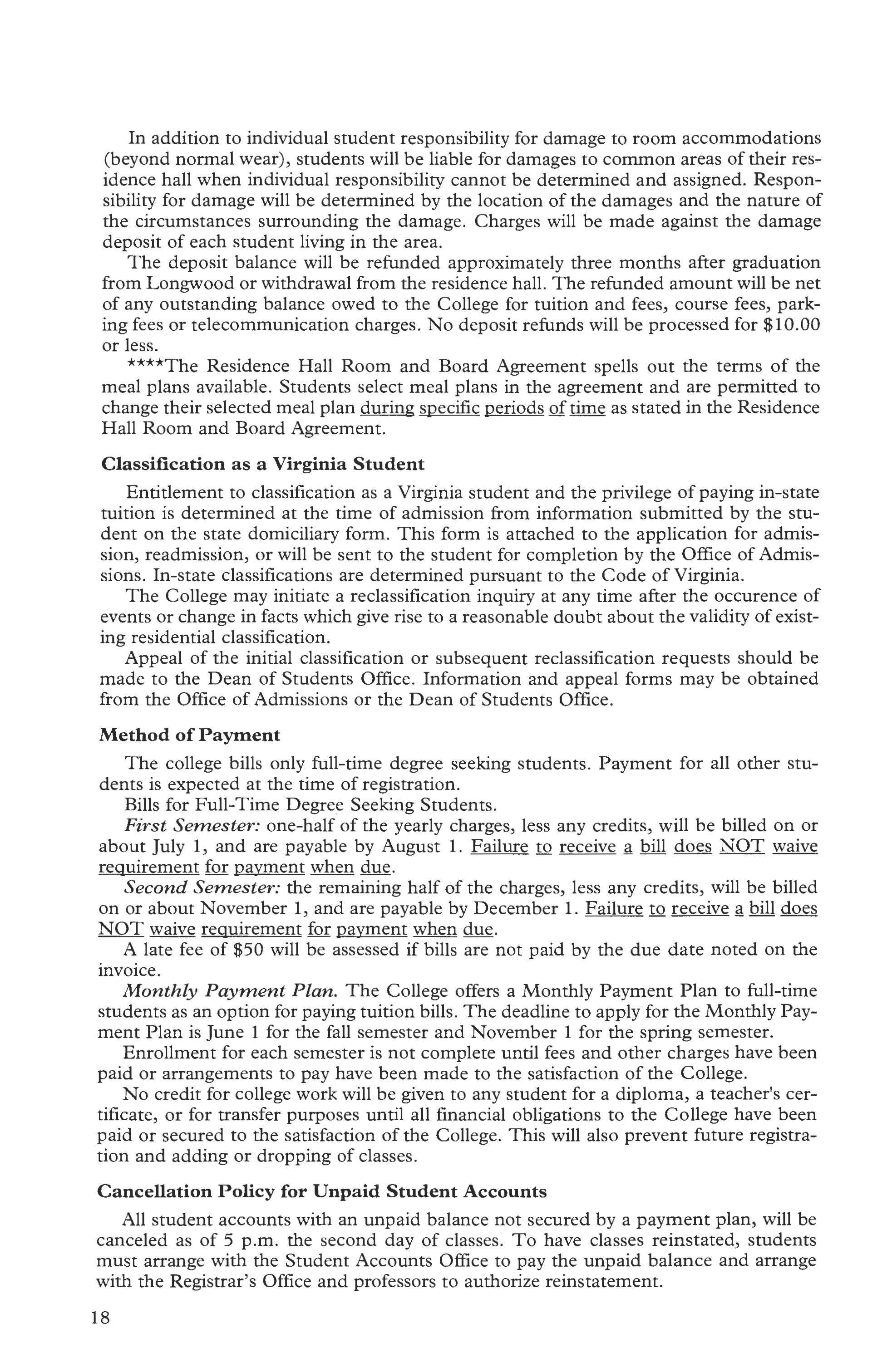 English Program . . . . . . . . . .. 14 7-149 Environmental Studies Courses .... 205 Environmental/Studies Minor ..... 200 Examination Fee, Special ......... 23 Examinations . . . . . . . . . . . . ..... .42 Re-examination Policy .46 Exercise and Health Science 109 Expenses & Financial Aid 17 Faculty, Longwood 249-257 Fees & Expenses for Students 17 Late Payment Fee ............ 21 Policy on Minimum Refunds ...... 22 Policy on Unpaid Tuition and Fees . . 19 Policy on Unpaid Telephone Accounts .......... 19