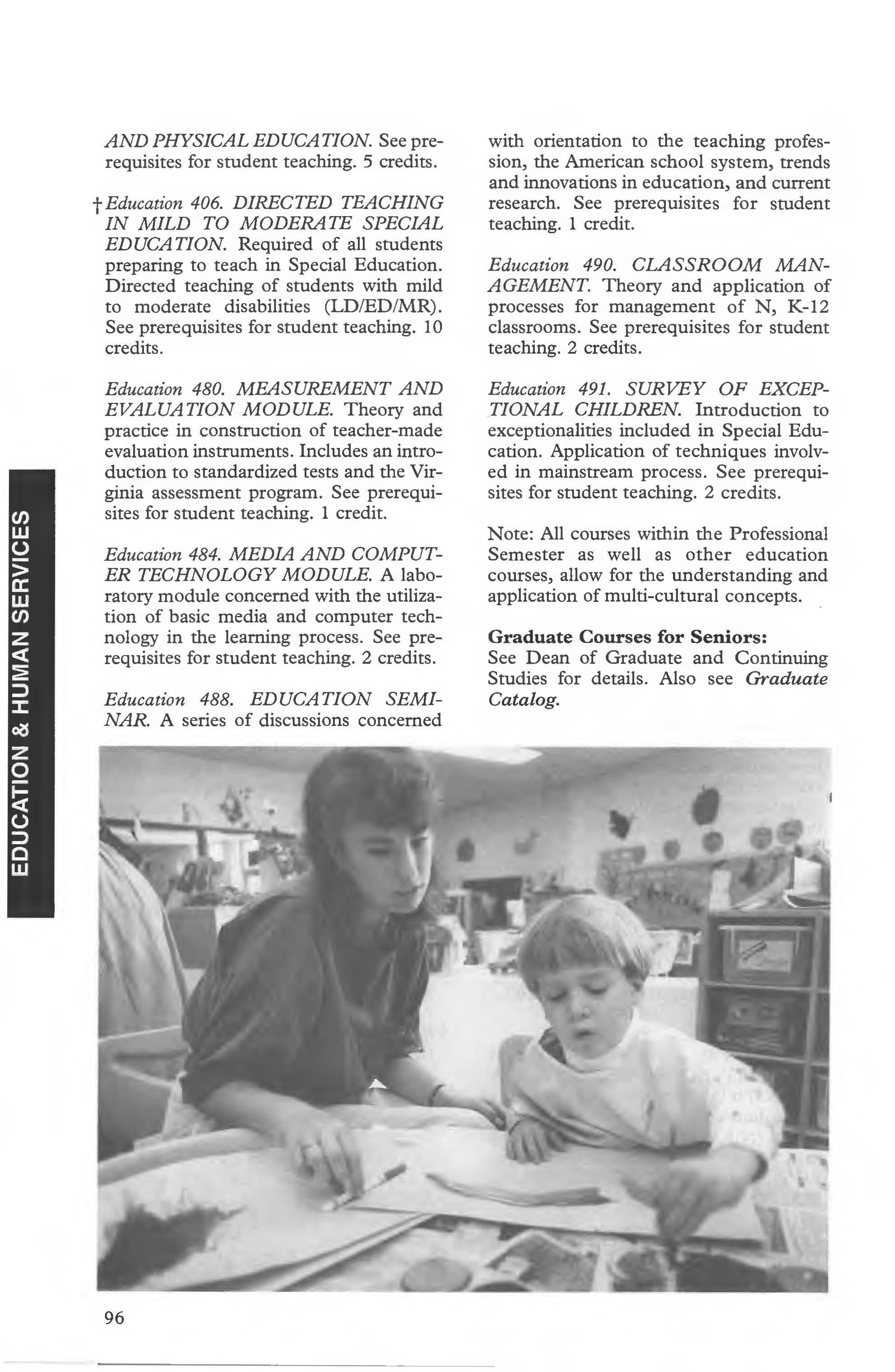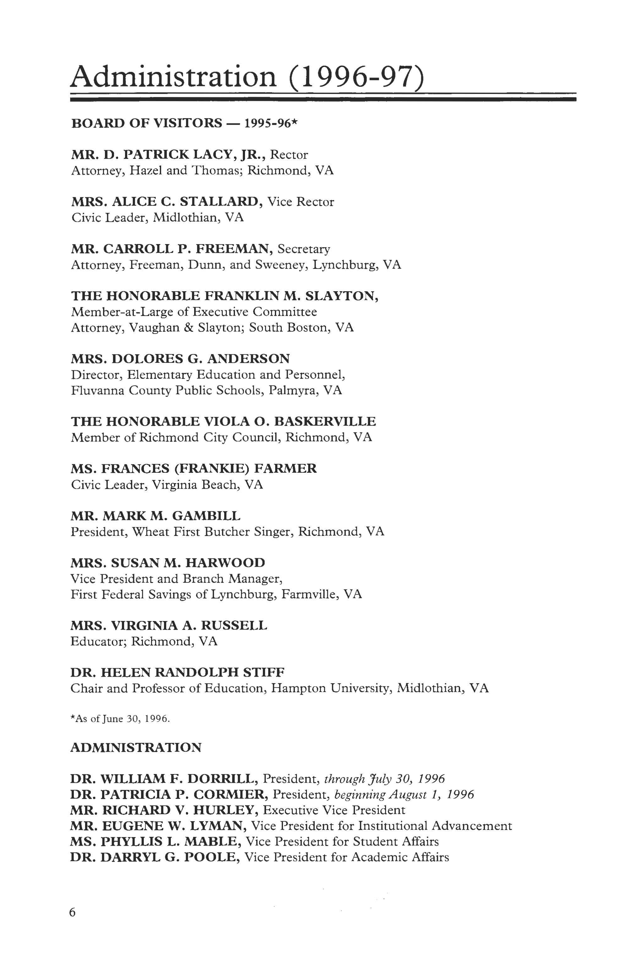 Longwood College Undergraduate Bulletin, August, 1996. Announcements 1996-97. In effect until August 1, 1997. Longwood College is accredited by Commission on Colleges of the Southern Association of Colleges and Schools to award bachelor's and master's degrees, National Council for Accreditation of Teacher Education, Virginia State Board of Education, National Association of Schools of Music; undergraduate Social Work Program accredited by the Council on Social Work Education; undergraduate Therapeutic Recreation Program accredited by the National Recreation and Park Association in cooperation with the American Association for Leisure and Recreation.