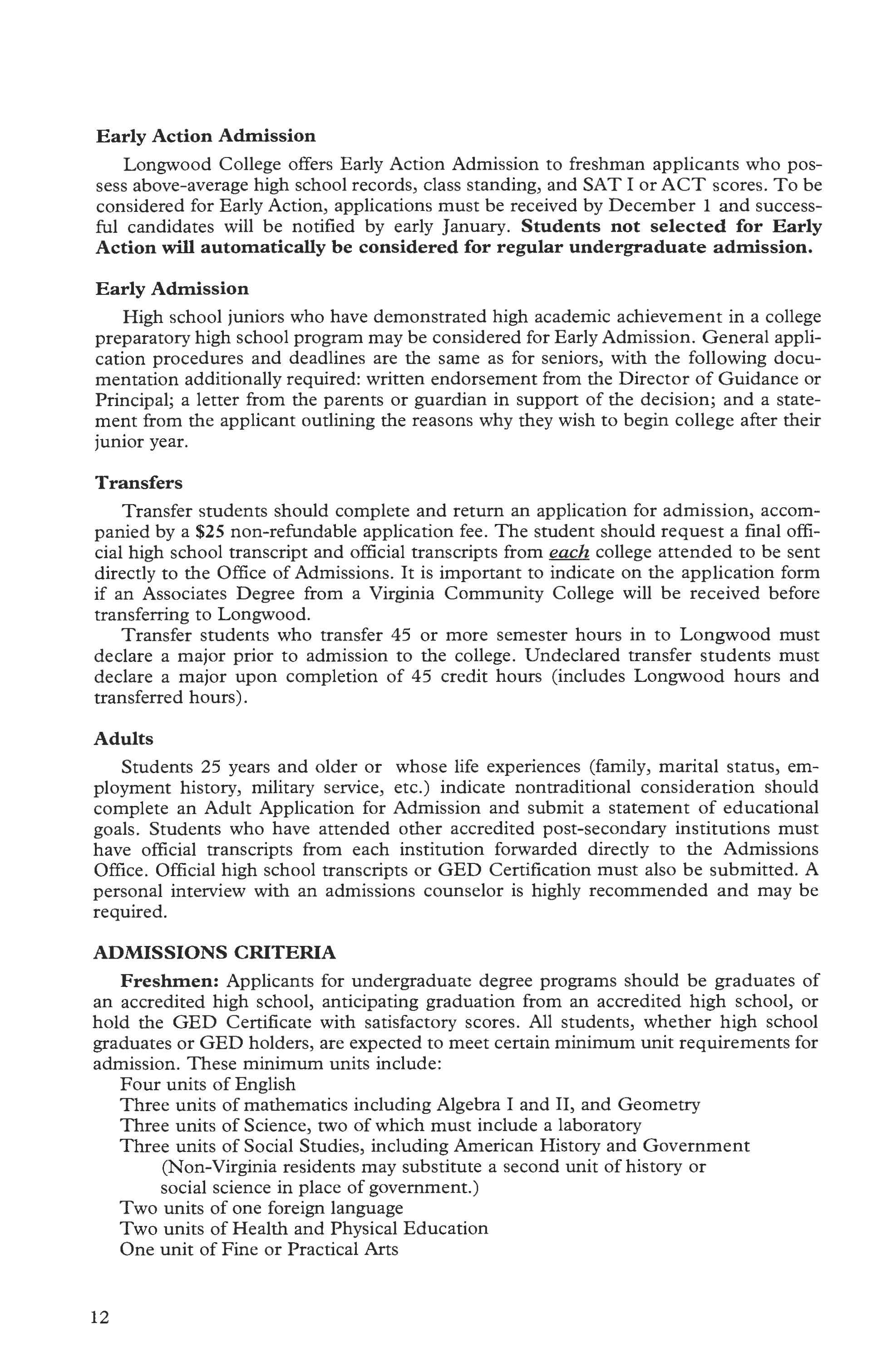 This catalog describes academic course numbers, descriptions, and standards for student progress and retention at the time of publication. However, the provisions of this publication are not to be regarded as an irrevocable contract between the student and Longwood College. There are established procedures for making changes which protect the institution's right to make changes deemed appropriate. A change of curriculum or graduation requirement is not made retroactive unless the alteration is to the student's advantage and can be accommodated within the span of years normally required for graduation.