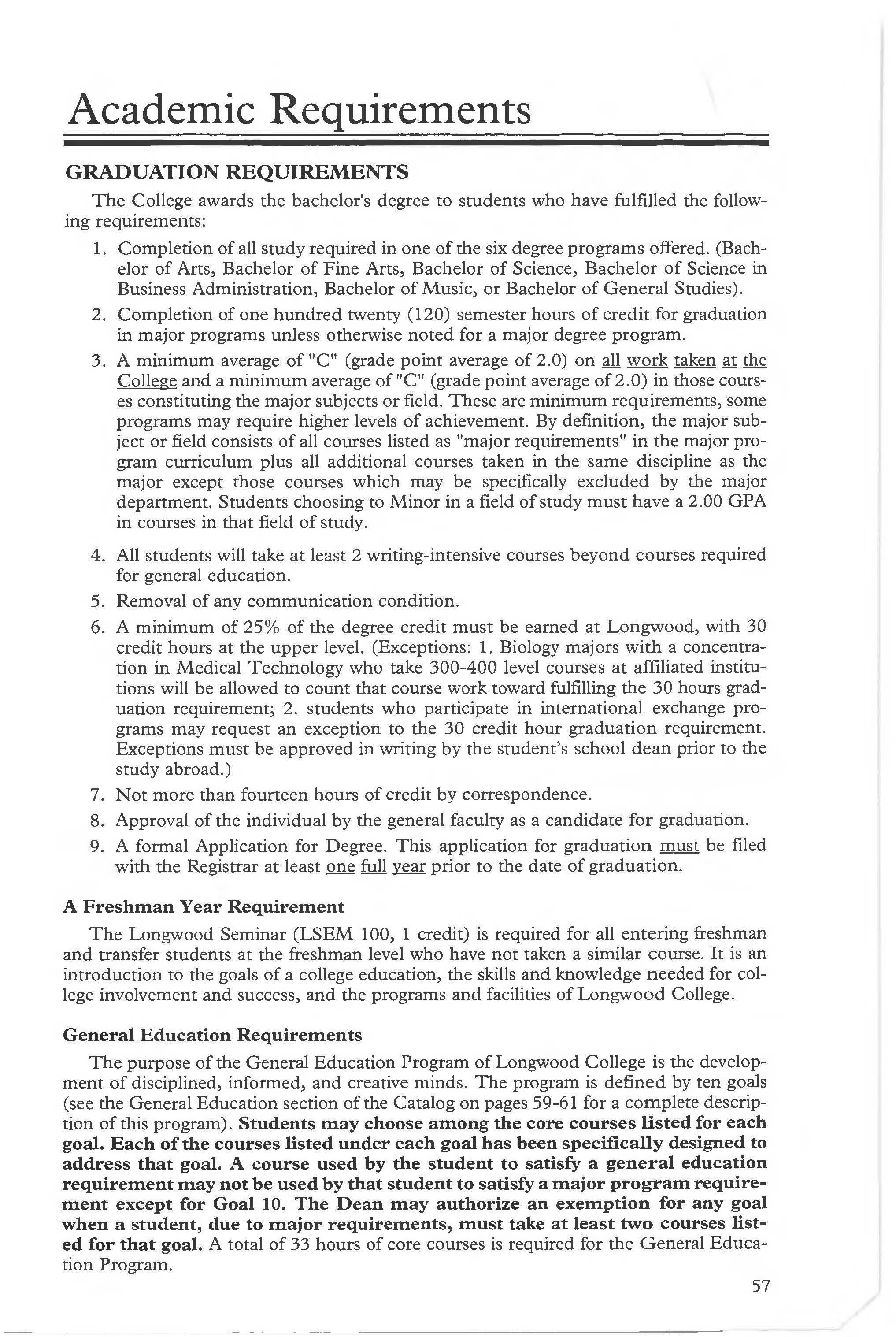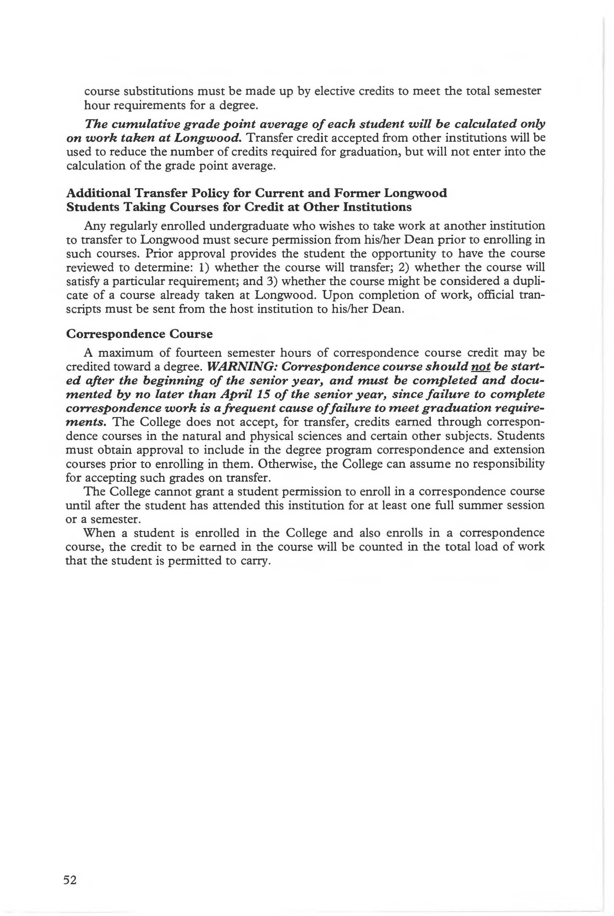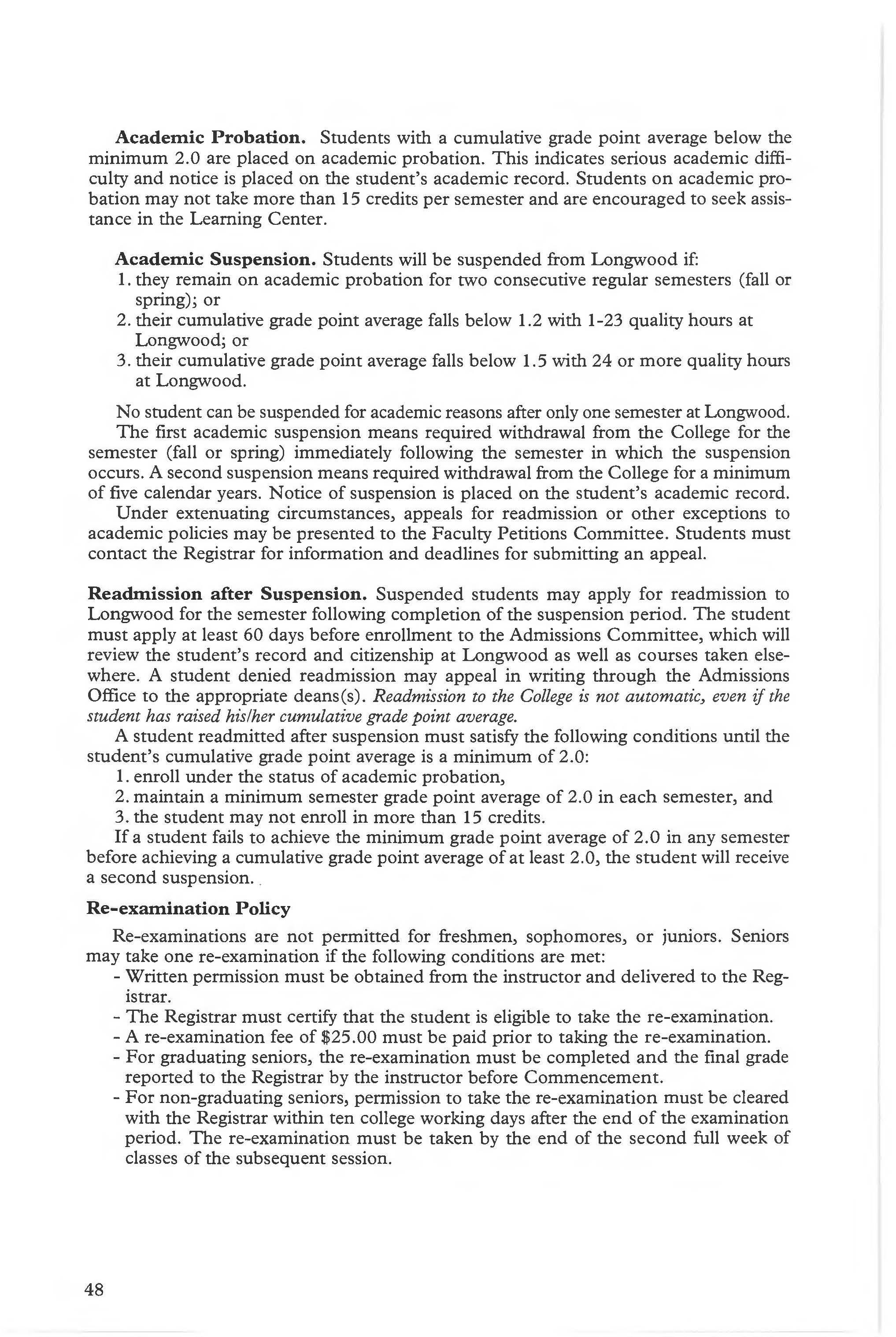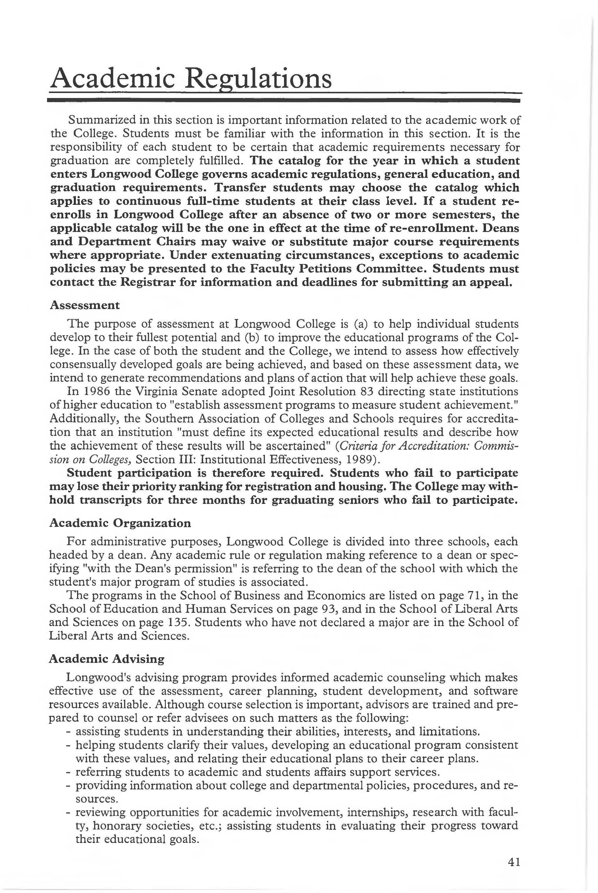 This catalog describes academic course numbers, descriptions, and standards for student progress and retention at the time of publication. However, the provisions of this publication are not to be regarded as an irrevocable contract between the student and Longwood College . There are established procedures for making changes which protect the institution's right to make changes deemed appropriate. A change of curriculum or graduation requirement is not made retroactive unless the alteration is to the student's advantage and can be accommodated within the span of years normally required for graduation .