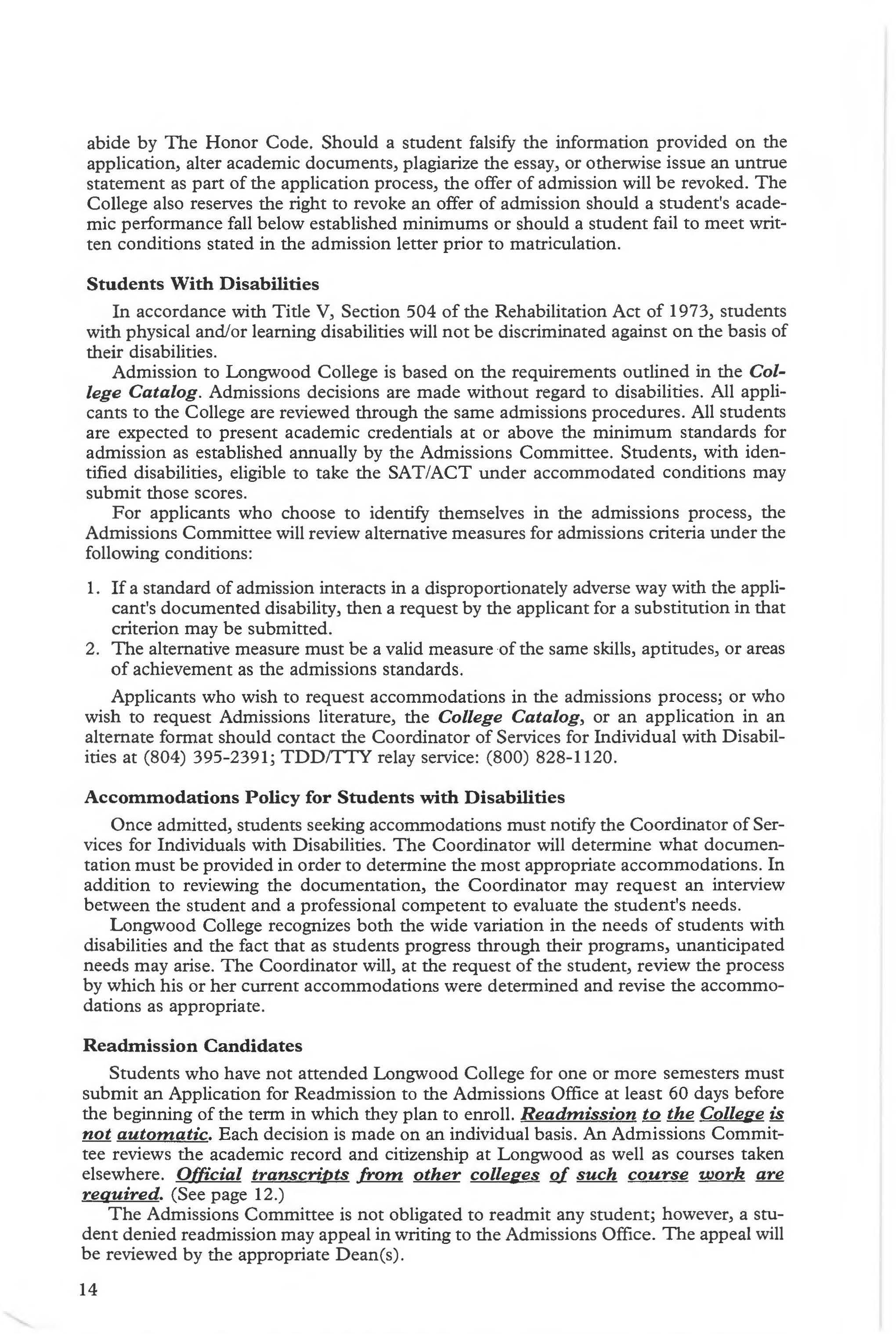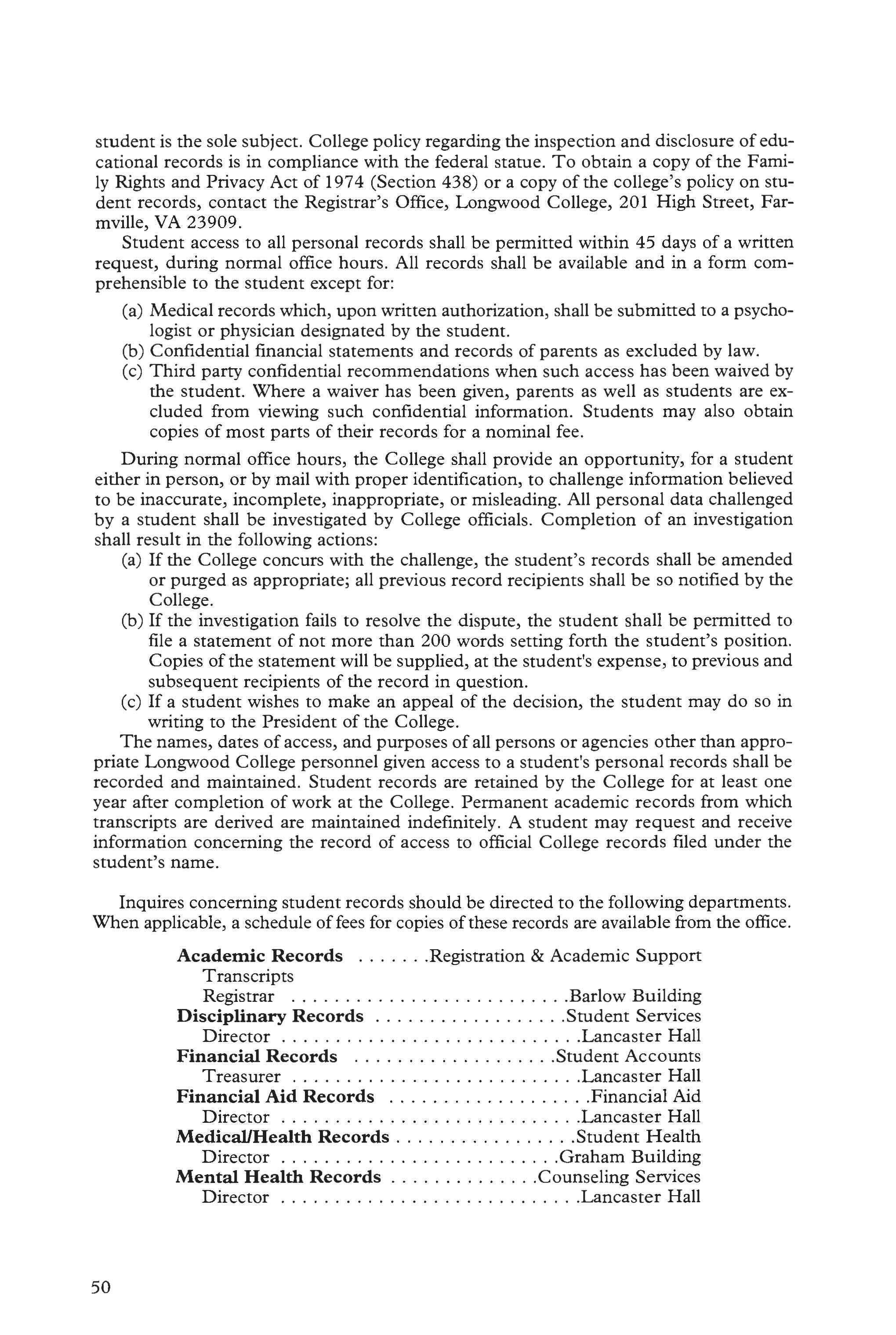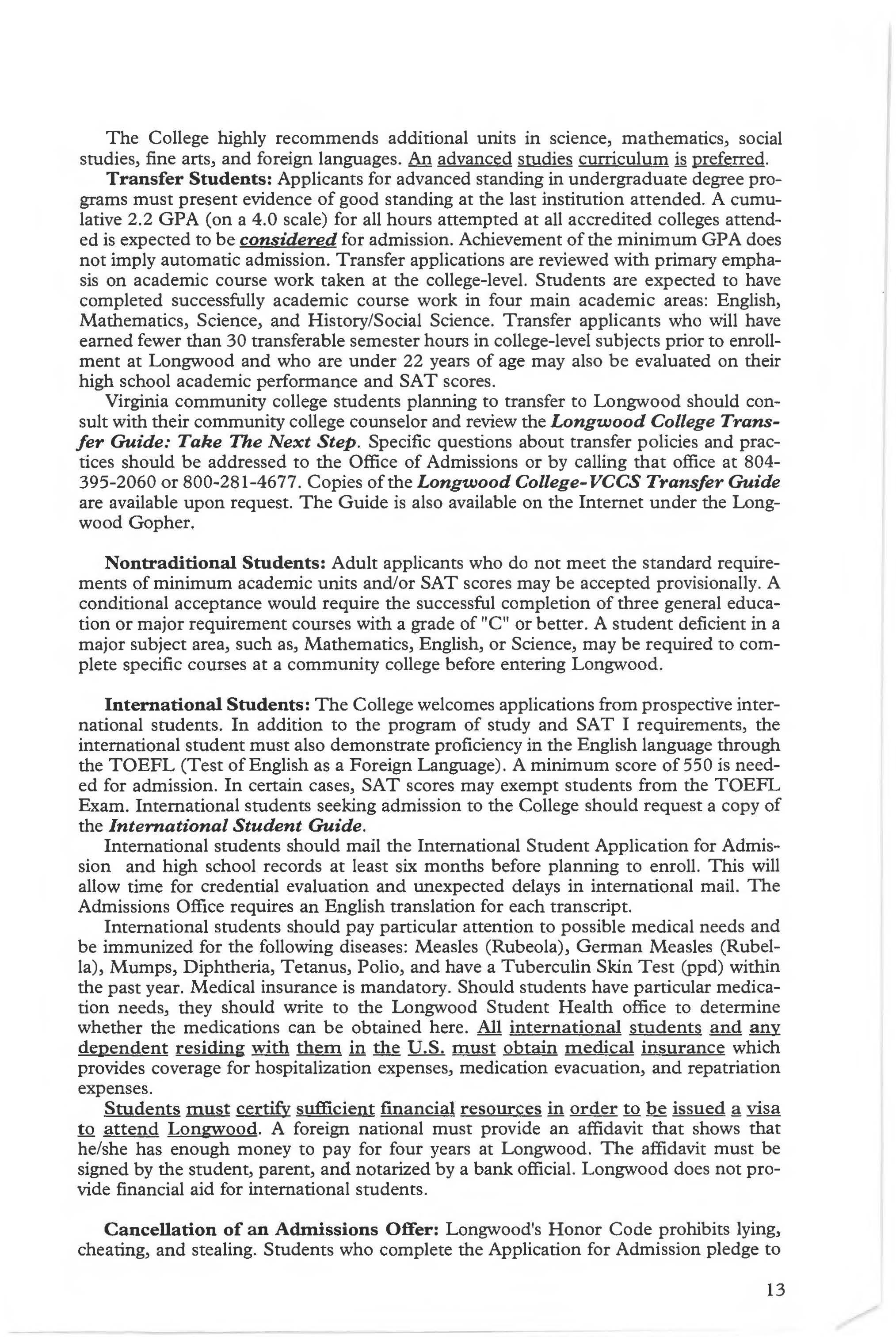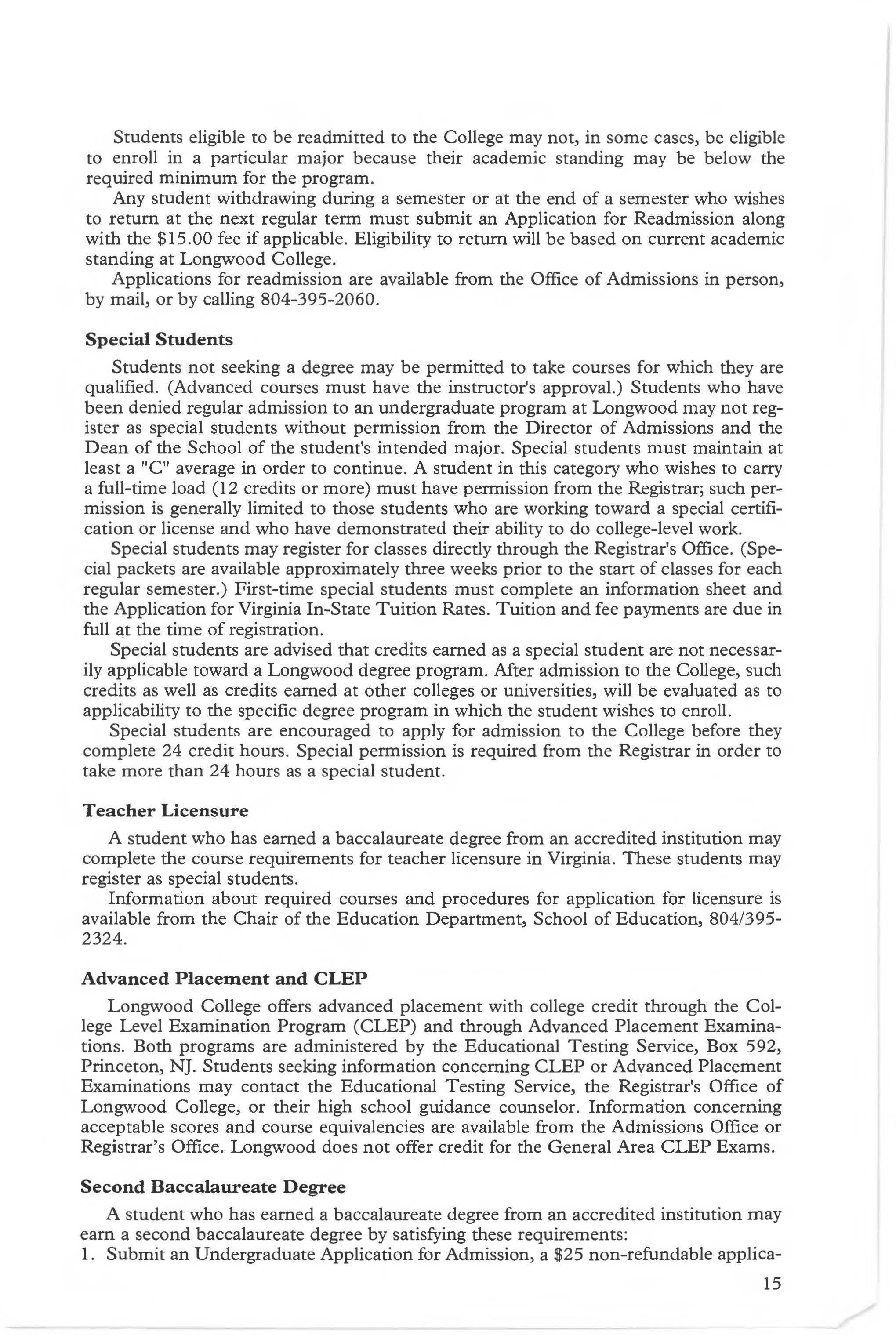 This catalog describes academic course numbers, descriptions, and standards for student progress and retention at the time of publication. However, the provisions of this publication are not to be regarded as an irrevocable contract between the student and Longwood College . There are established procedures for making changes which protect the institution's right to make changes deemed appropriate. A change of curriculum or graduation requirement is not made retroactive unless the alteration is to the student's advantage and can be accommodated within the span of years normally required for graduation .