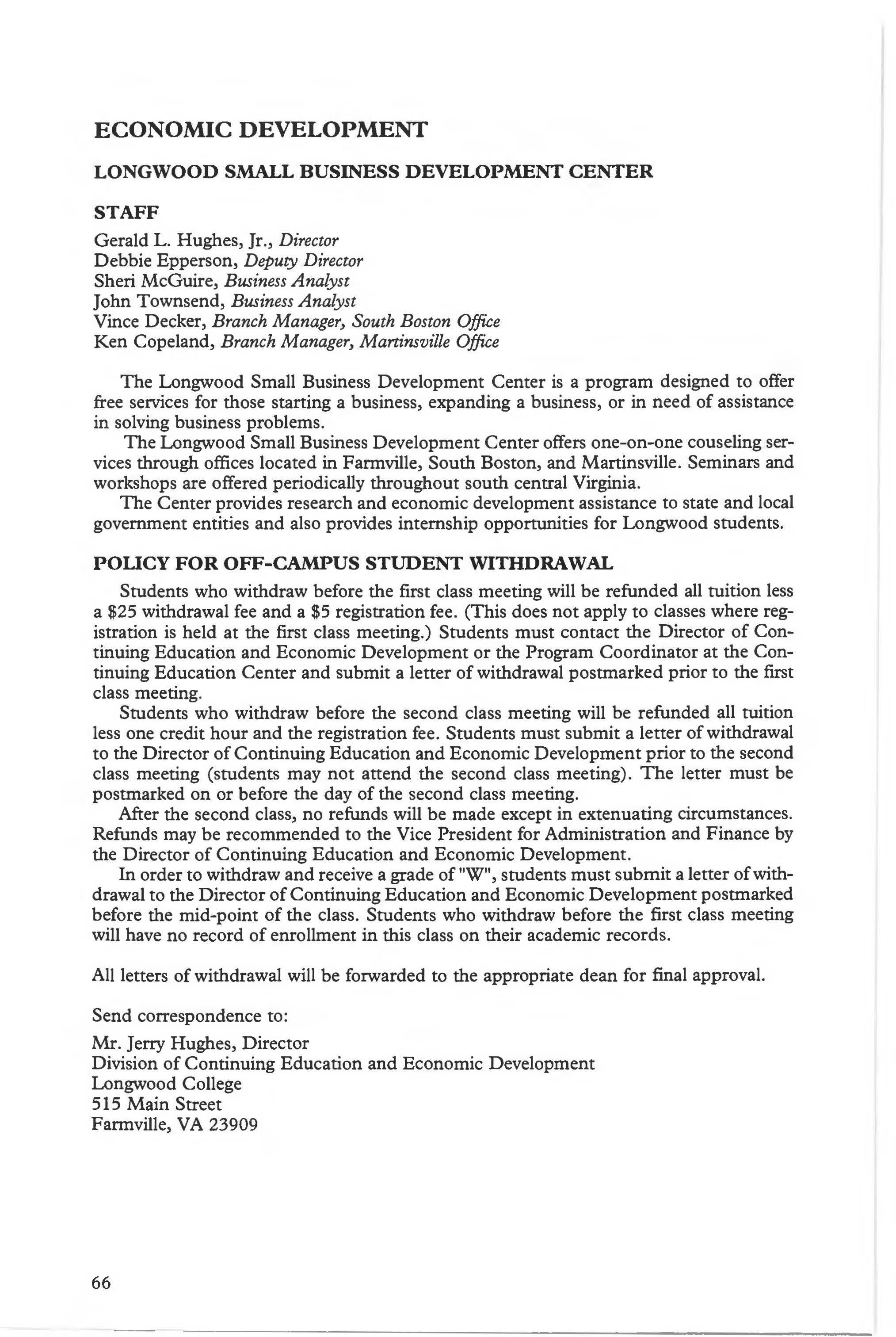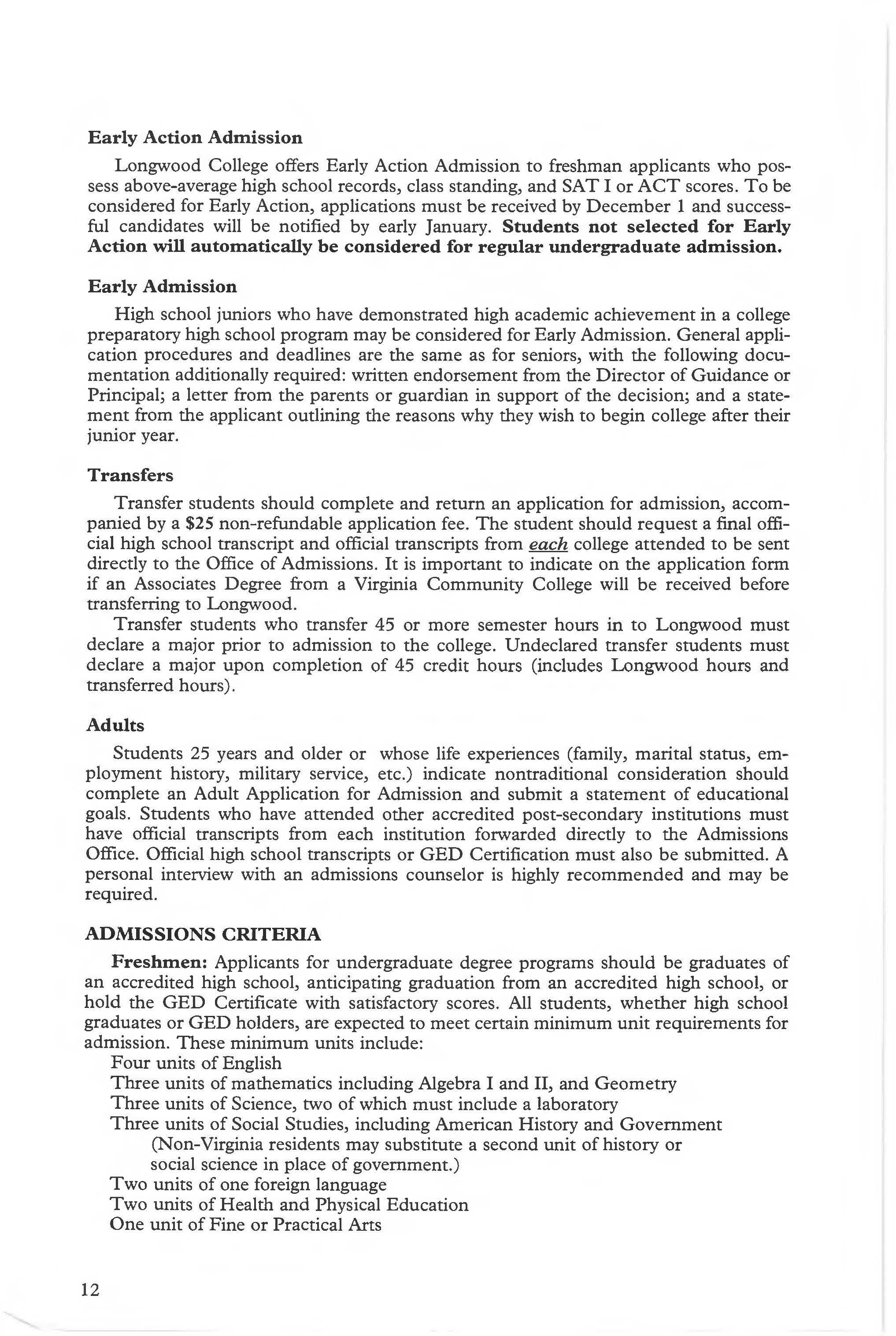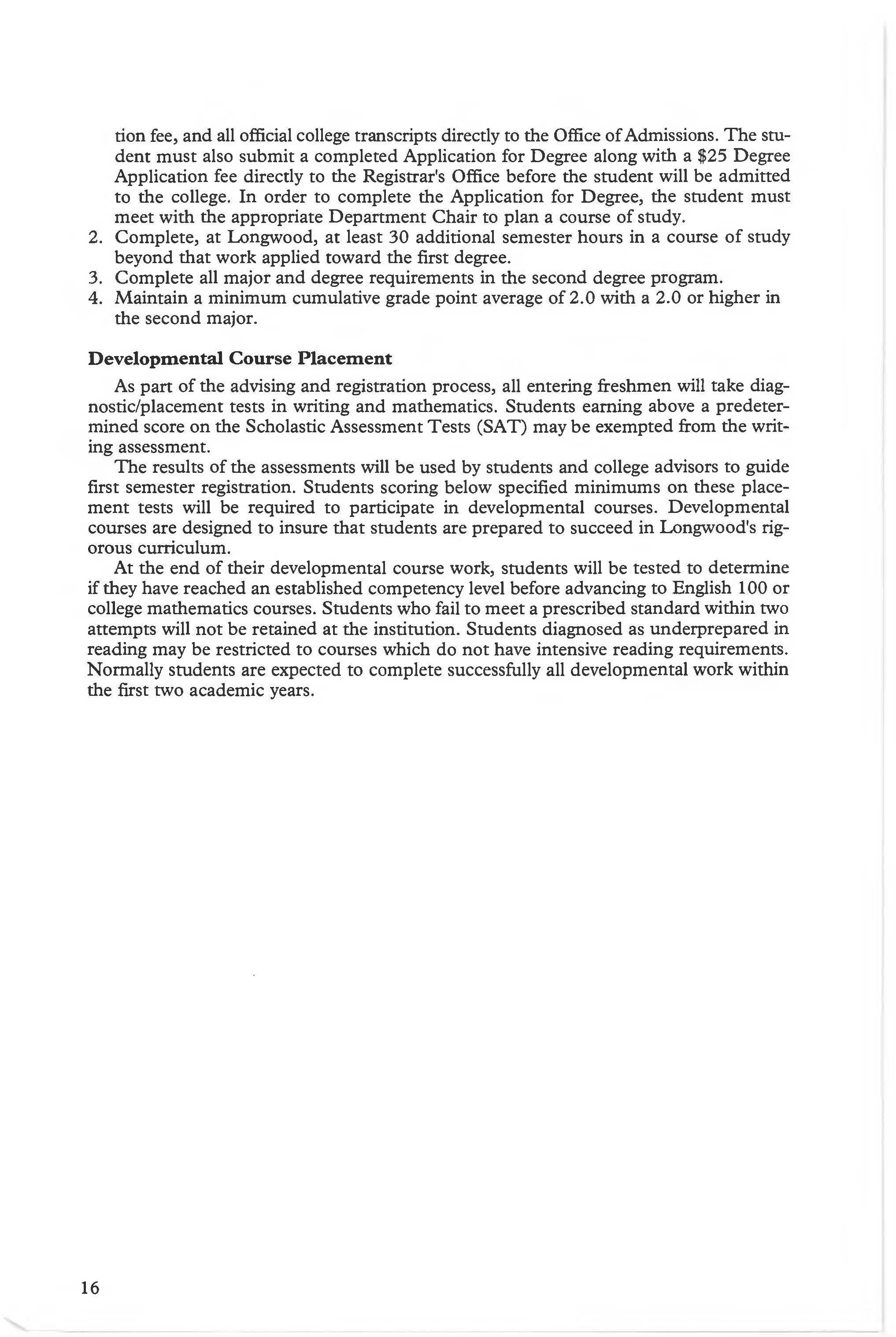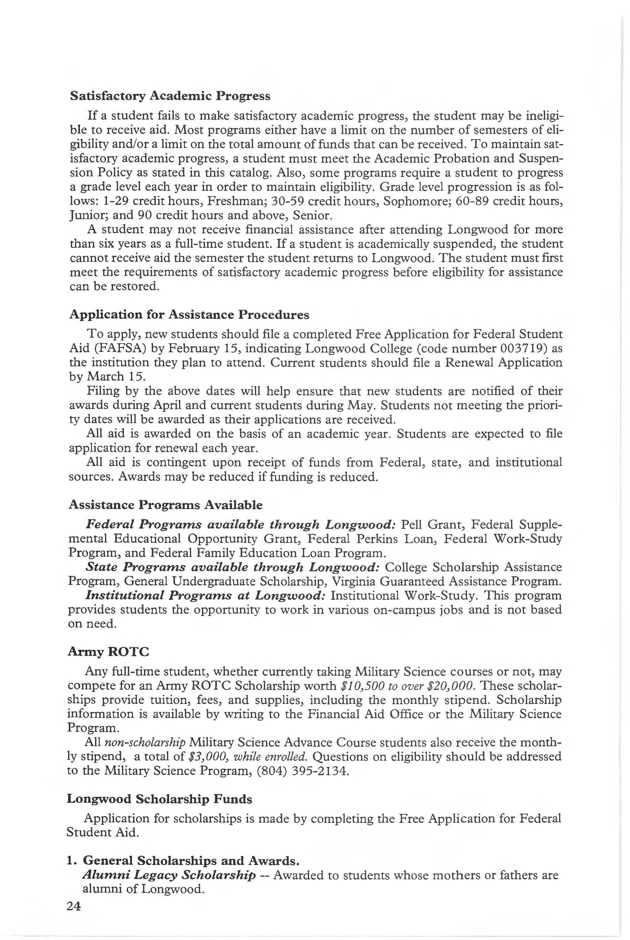 This catalog describes academic course numbers, descriptions, and standards for student progress and retention at the time of publication. However, the provisions of this publication are not to be regarded as an irrevocable contract between the student and Longwood College . There are established procedures for making changes which protect the institution's right to make changes deemed appropriate. A change of curriculum or graduation requirement is not made retroactive unless the alteration is to the student's advantage and can be accommodated within the span of years normally required for graduation .