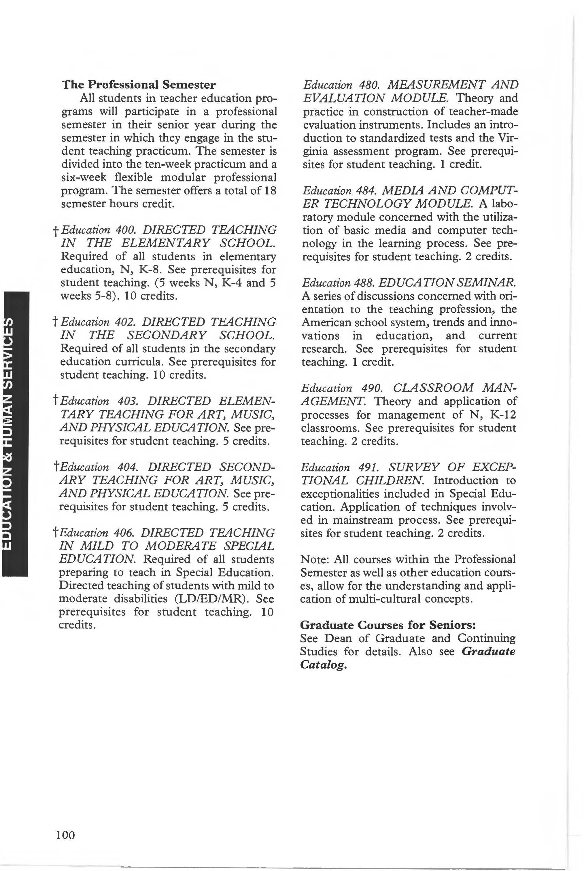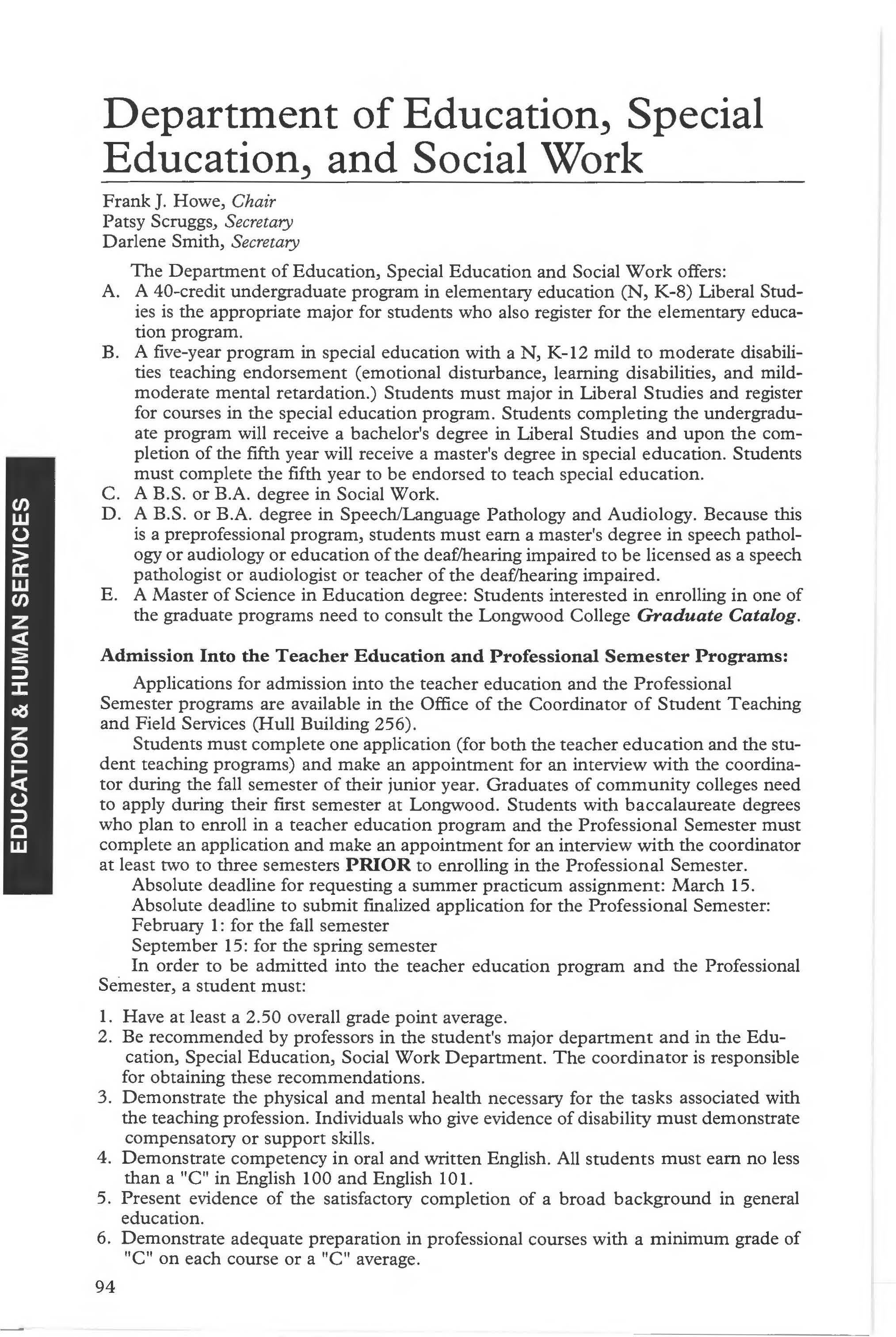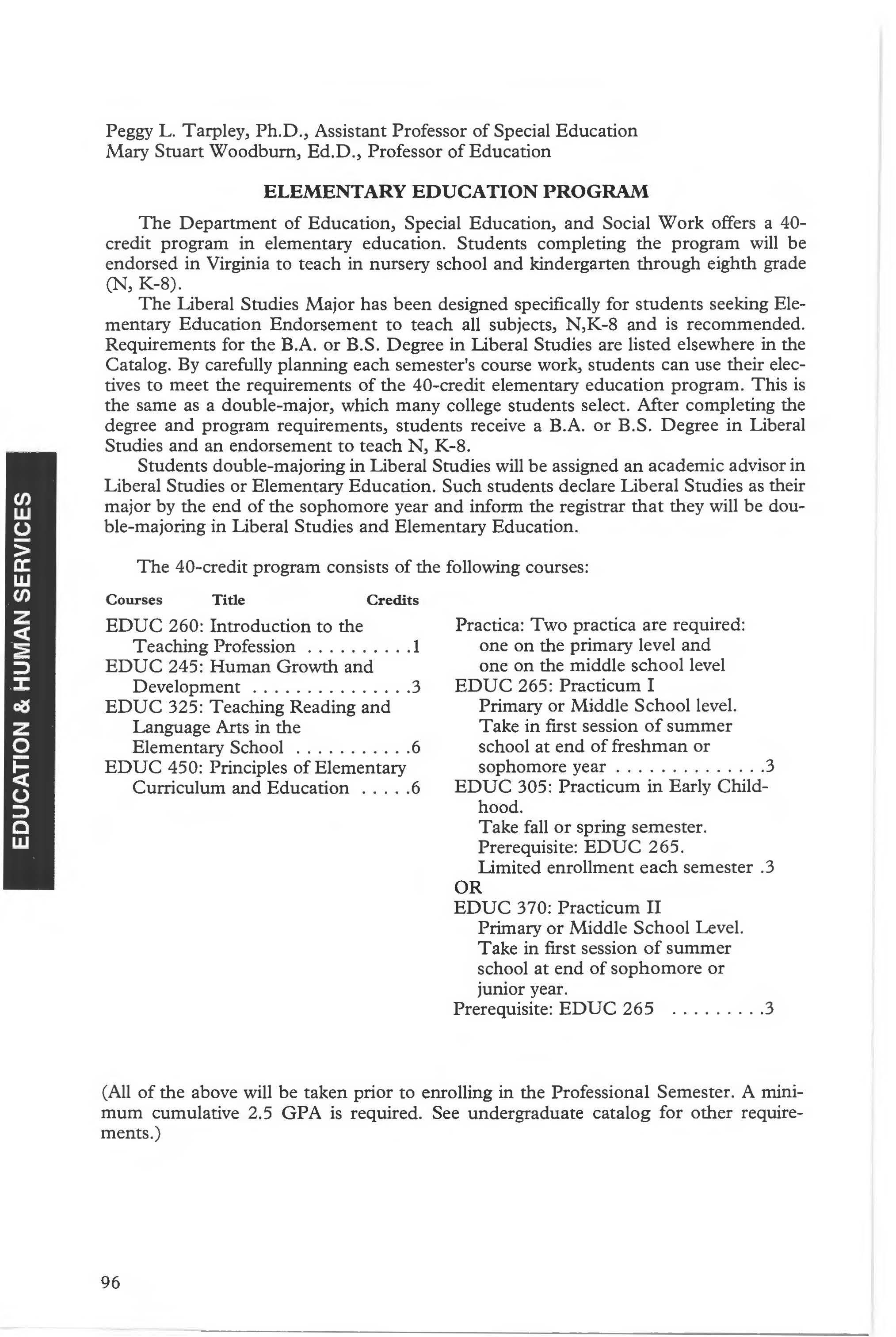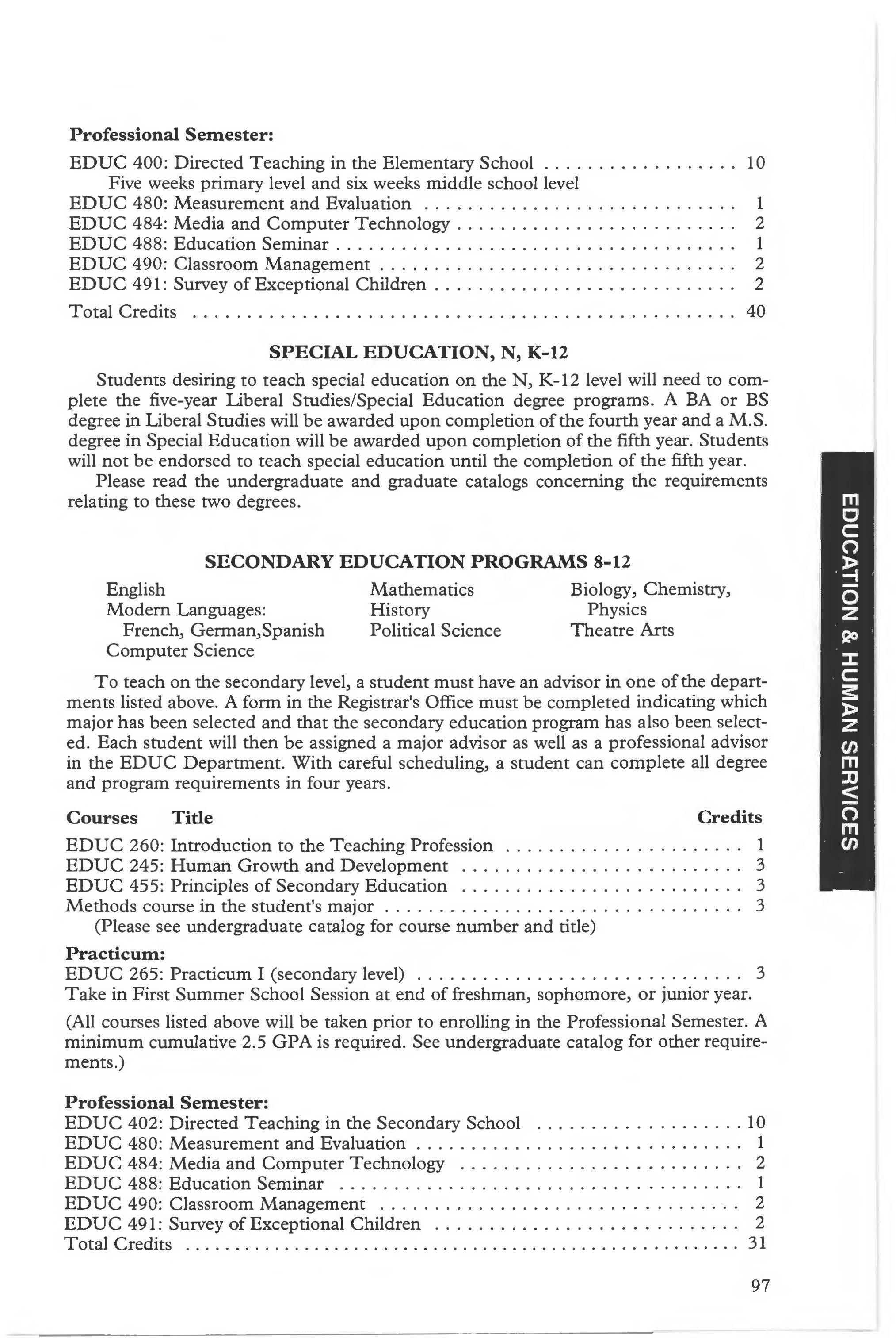 Education, Special Education, and Social Work, Dept. of . . . ...... . 94 Elementary Education Program 96-97 Professional Semester ..... ... . . . .97