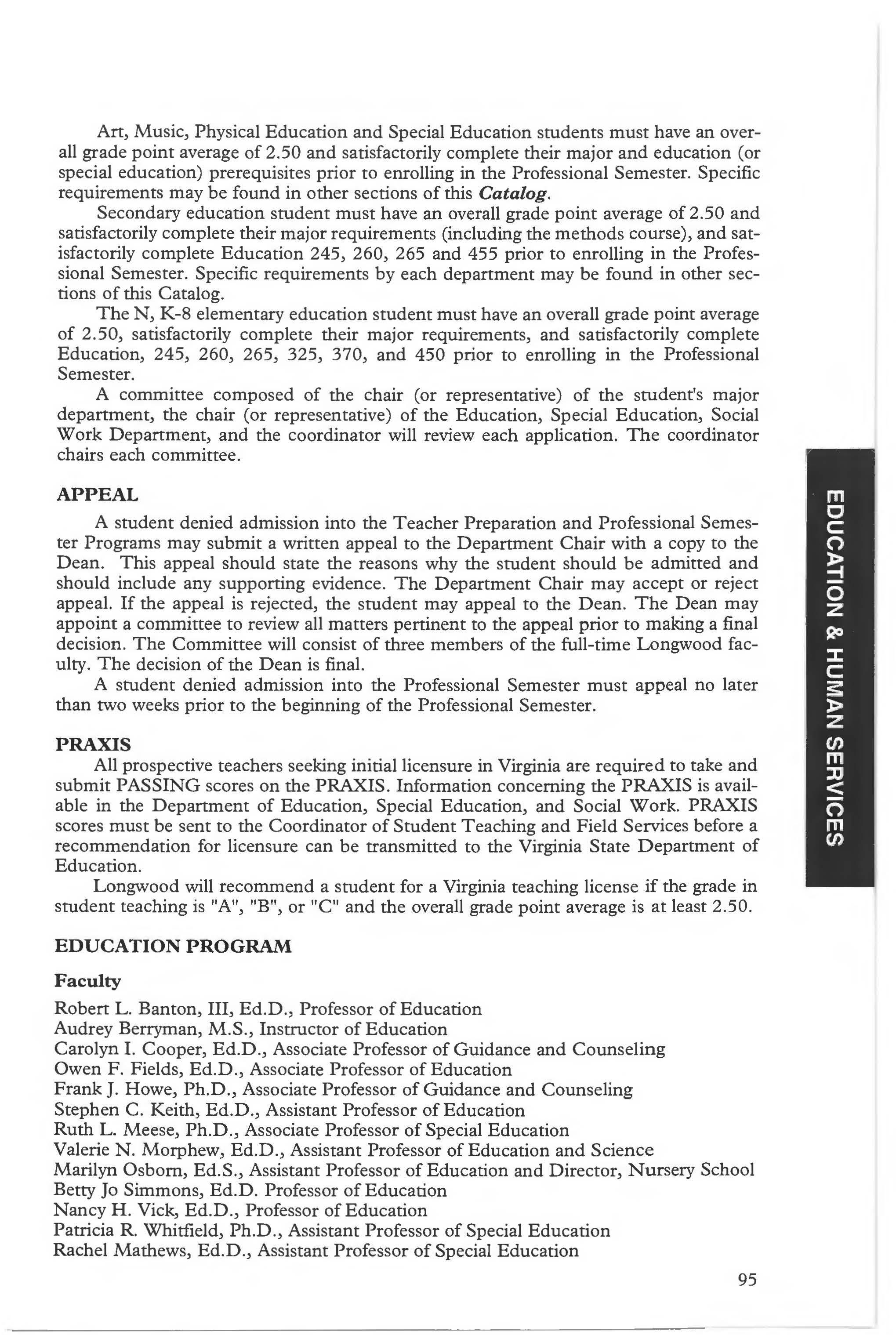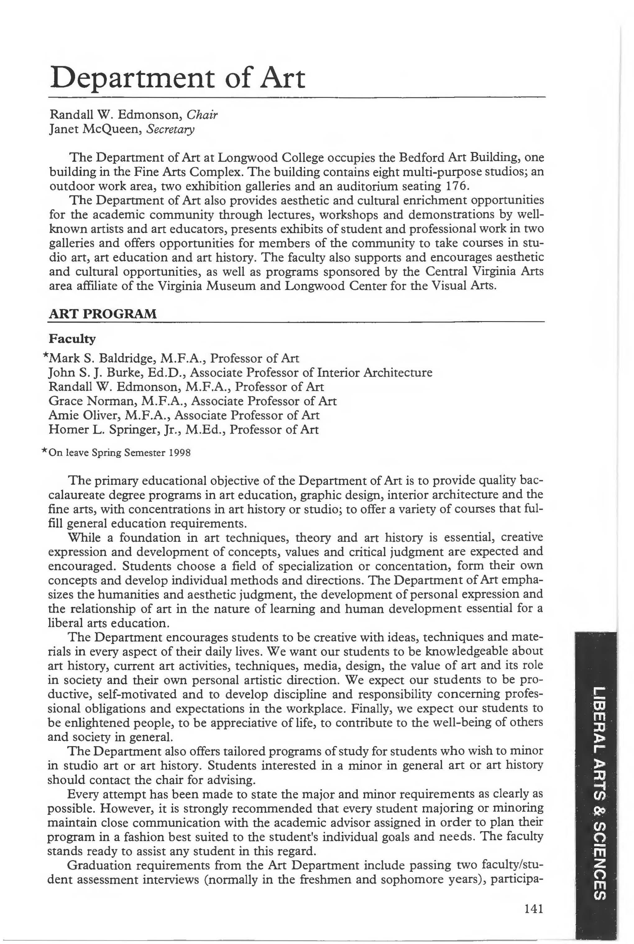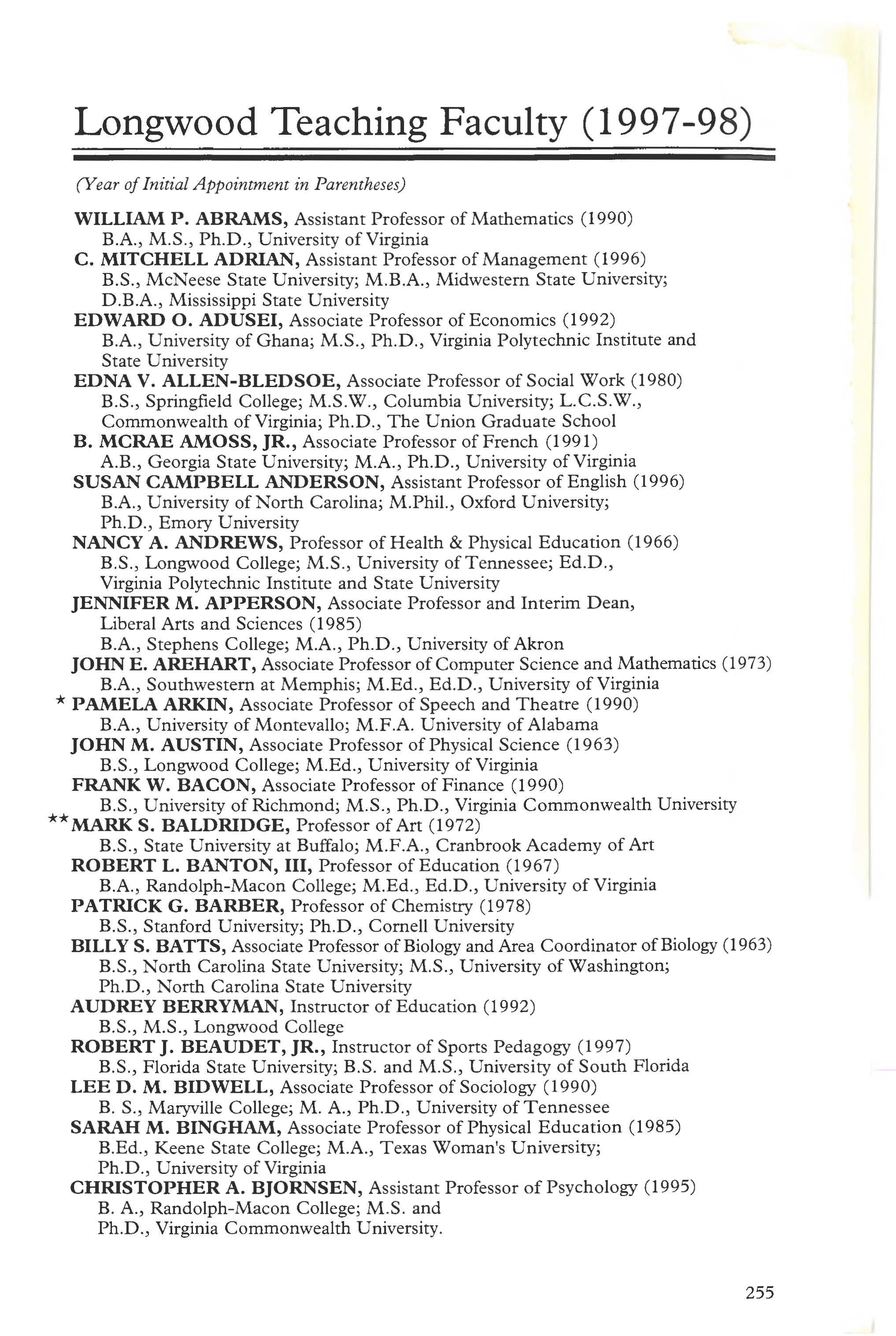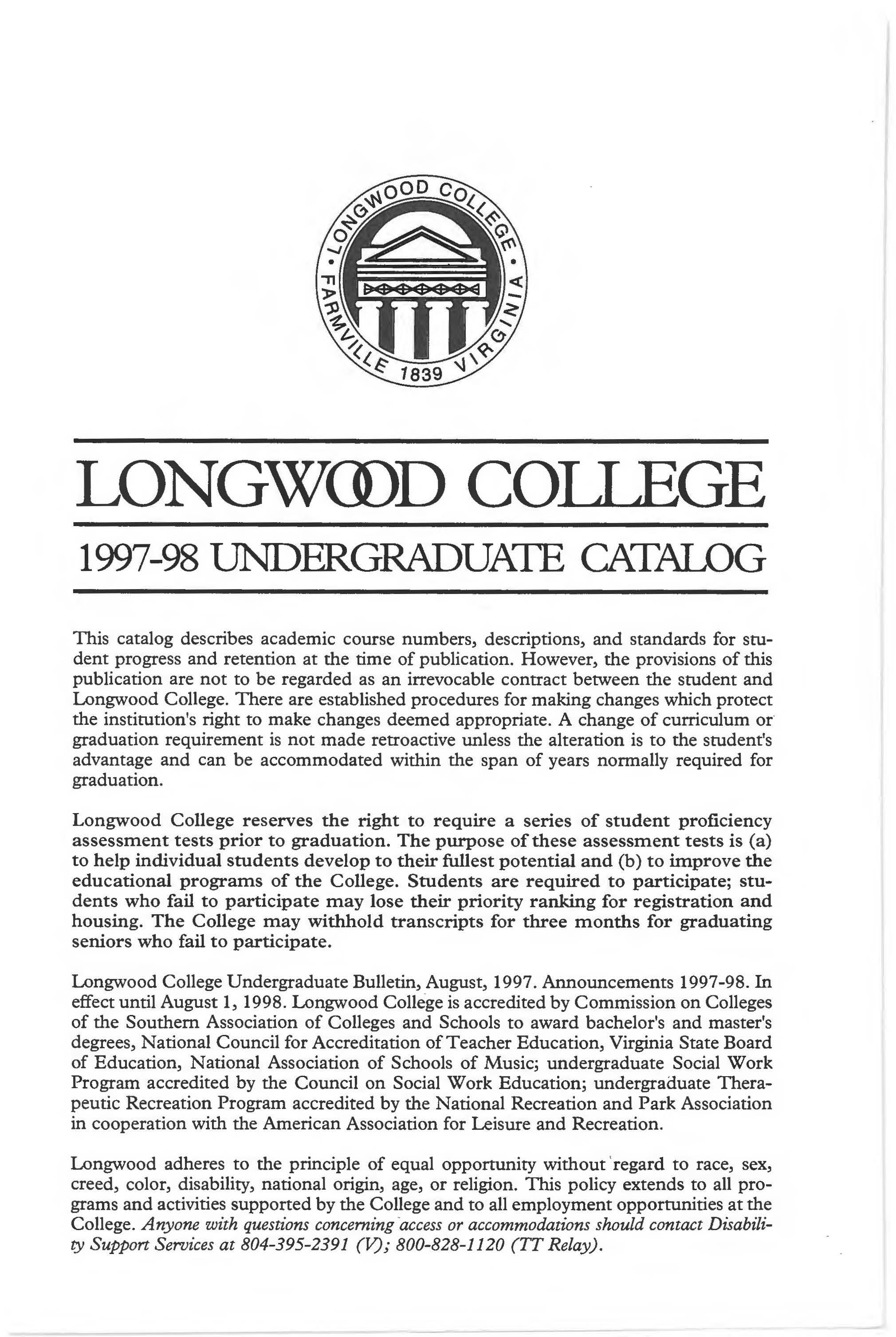 Longwood College Undergraduate Bulletin, August, 1997. Announcements 1997-98. In effect until August 1, 1998. Longwood College is accredited by Commission on Colleges of the Southern Association of Colleges and Schools to award bachelor's and master's degrees, National Council for Accreditation of Teacher Education, Virginia State Board of Education, National Association of Schools of Music; undergraduate Social Work Program accredited by the Council on Social Work Education; undergraduate Therapeutic Recreation Program accredited by the National Recreation and Park Association in cooperation with the American Association for Leisure and Recreation
