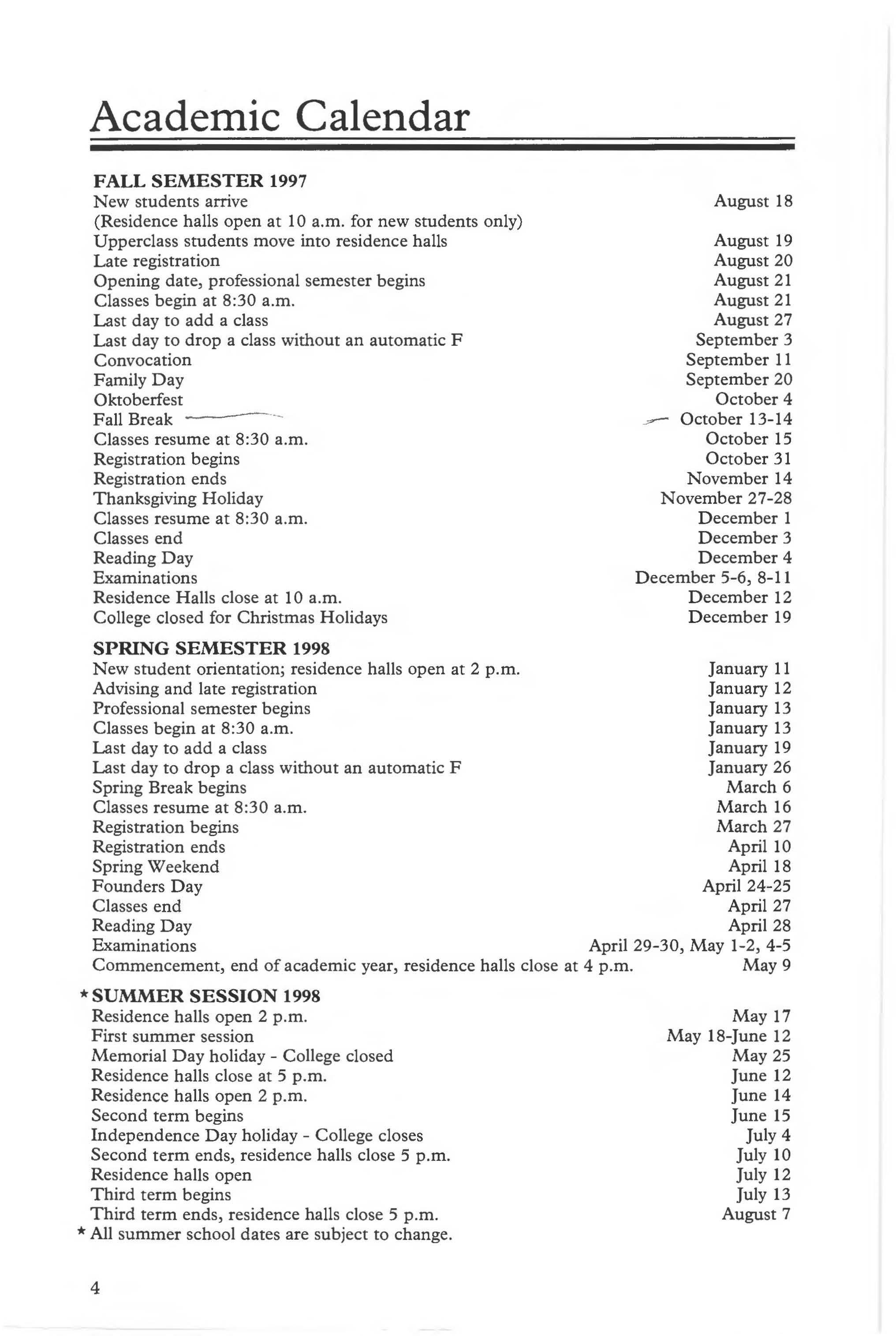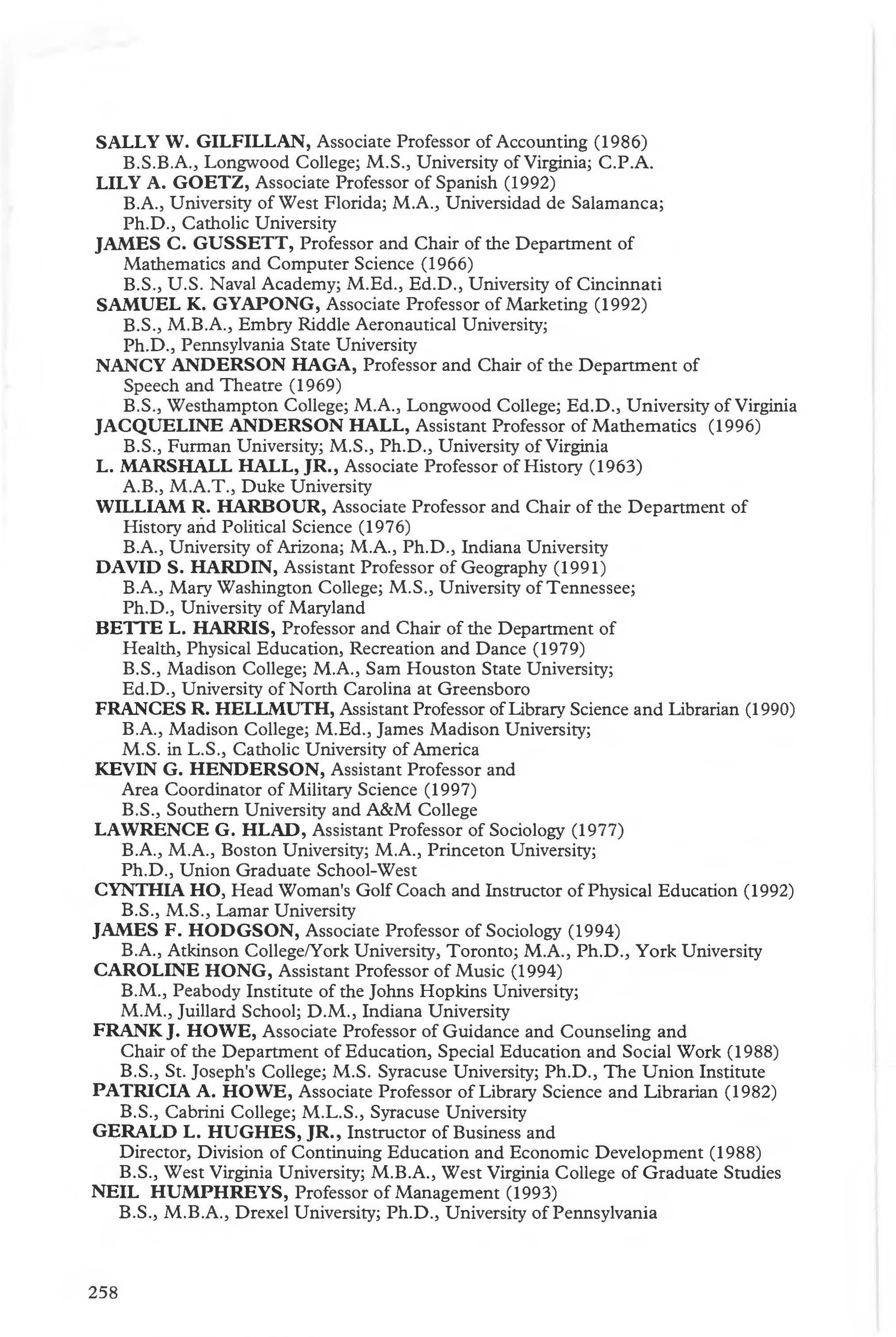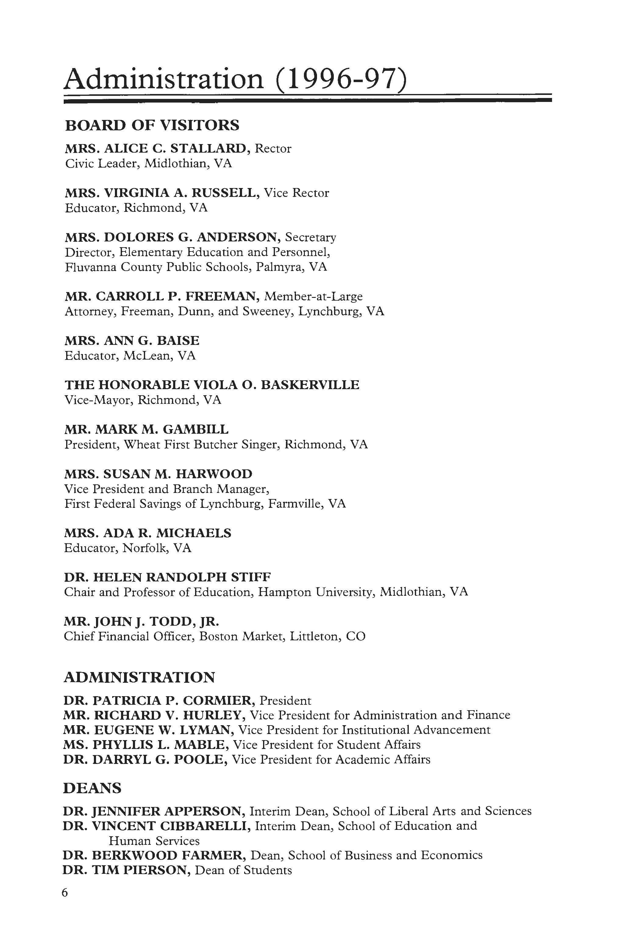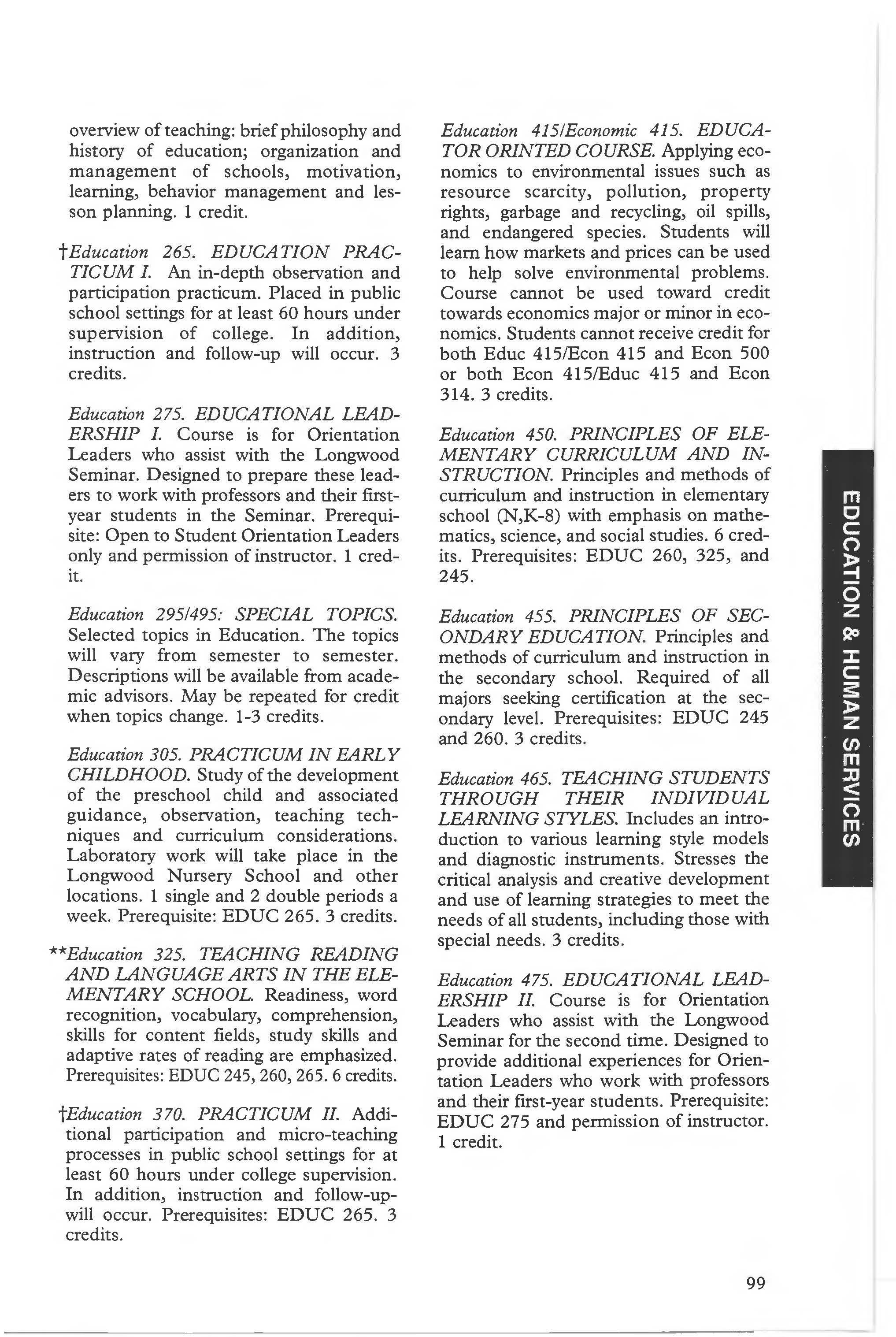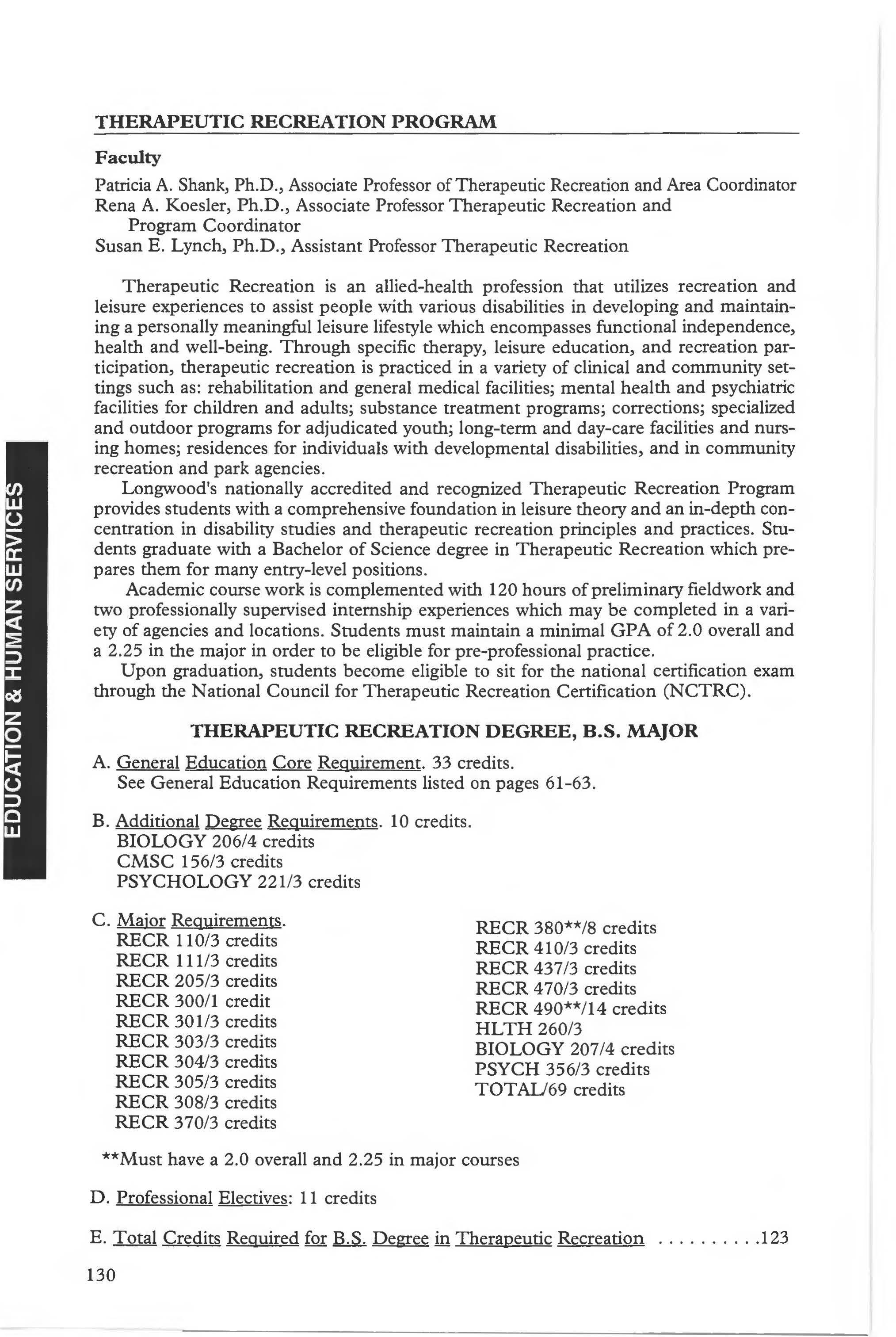 Longwood College Undergraduate Bulletin, August, 1997. Announcements 1997-98. In effect until August 1, 1998. Longwood College is accredited by Commission on Colleges of the Southern Association of Colleges and Schools to award bachelor's and master's degrees, National Council for Accreditation of Teacher Education, Virginia State Board of Education, National Association of Schools of Music; undergraduate Social Work Program accredited by the Council on Social Work Education; undergraduate Therapeutic Recreation Program accredited by the National Recreation and Park Association in cooperation with the American Association for Leisure and Recreation