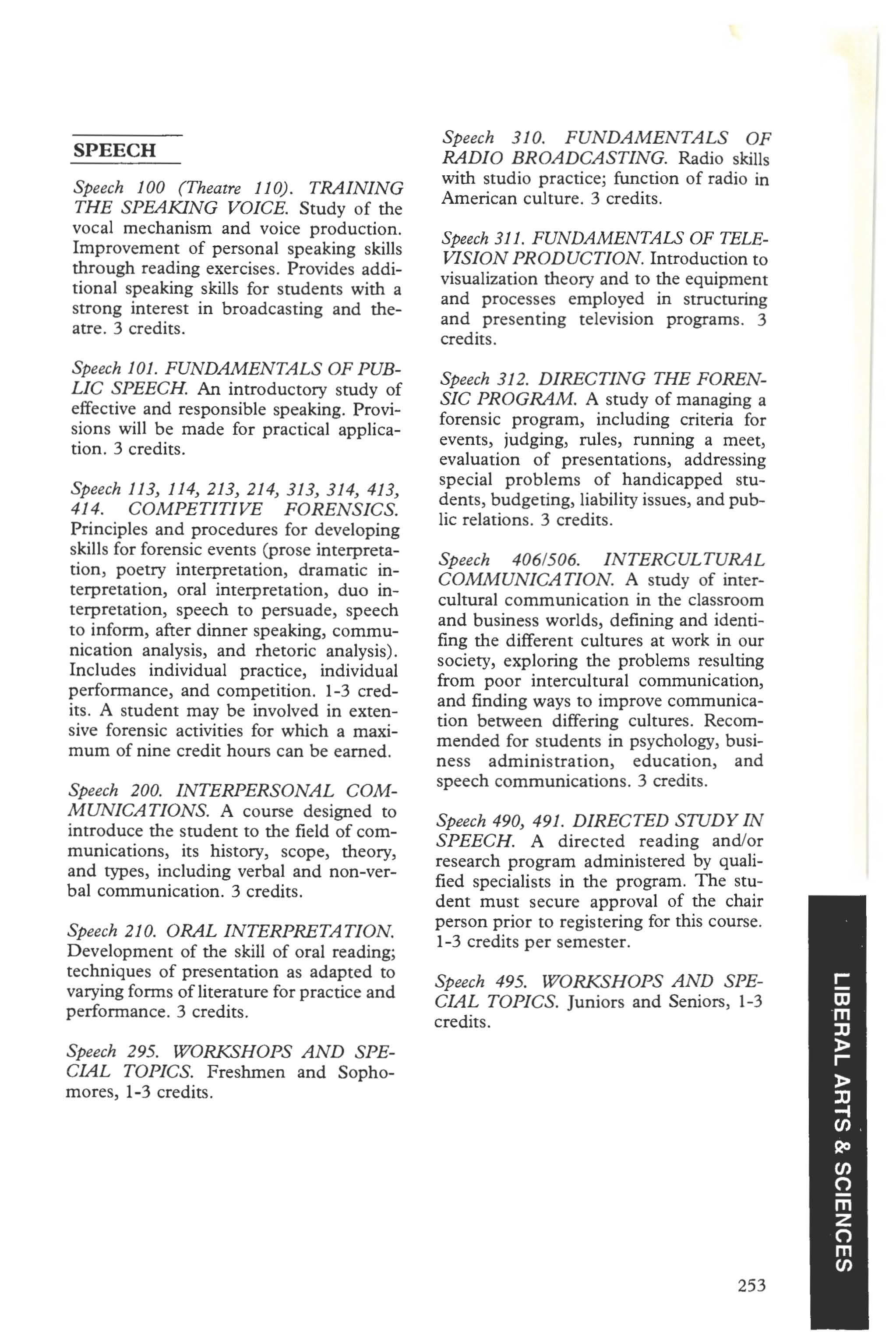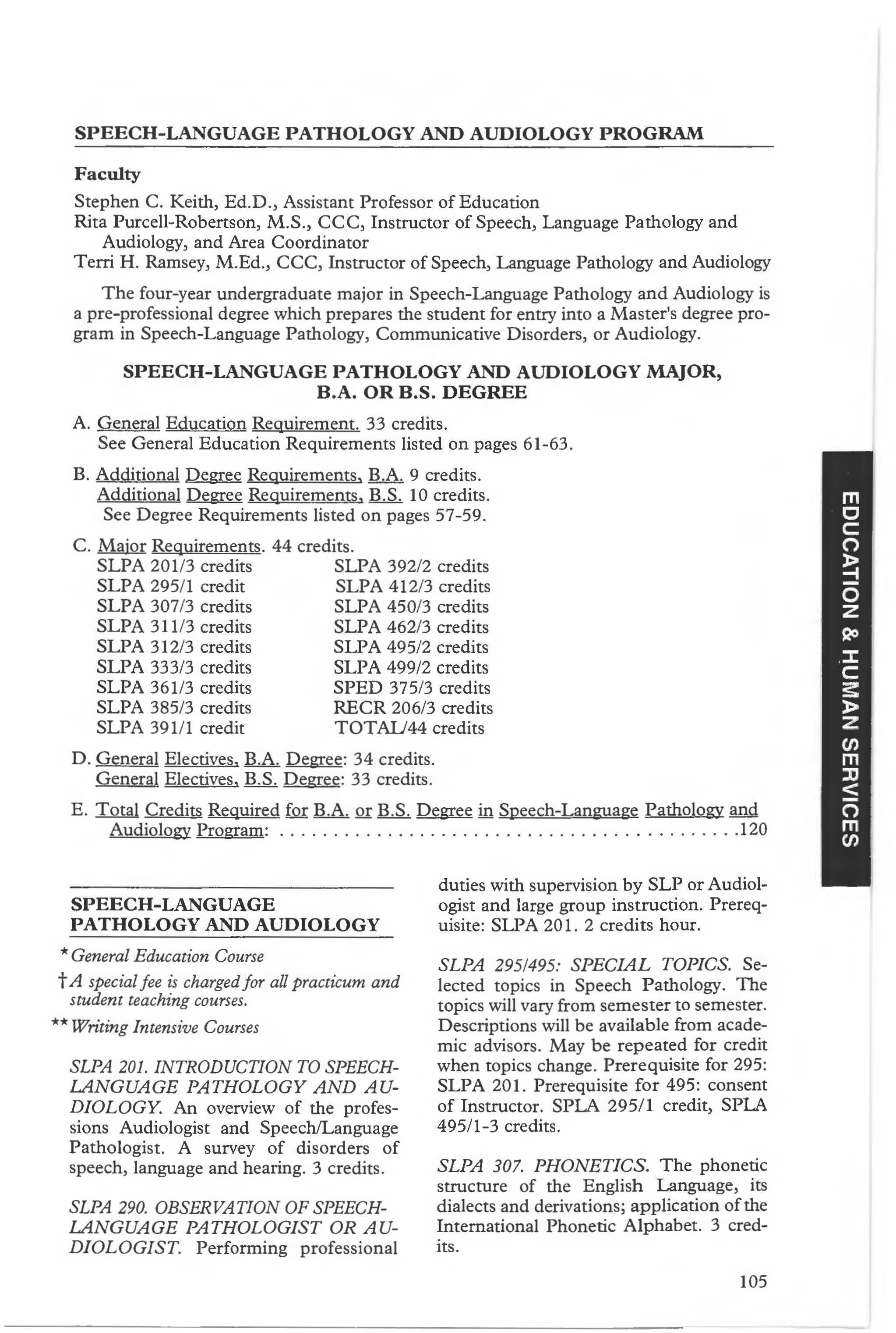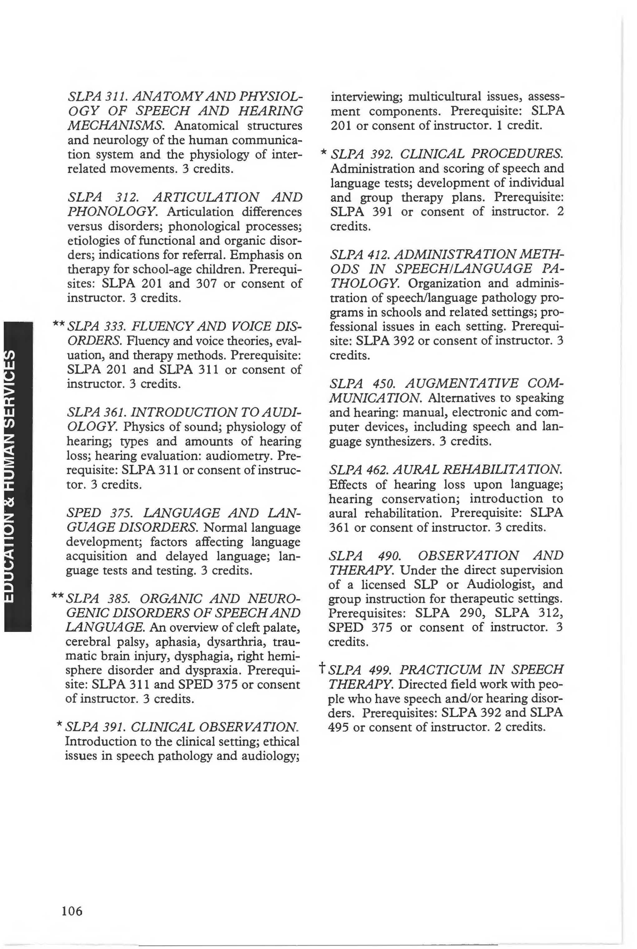 Spanish 162 Spanish Courses . ... . ....... 167-169 Special Education Courses .... 102-104 Special Students 15 Speech Courses 253 Speech/Language Pathology & Audiology Major, B.A. or B.S 105 Speech/Language Pathology & Audiology Program . .... ...... 105 Speech/Language Pathology Courses . . . . . . . . . . ..... . 10 5-106