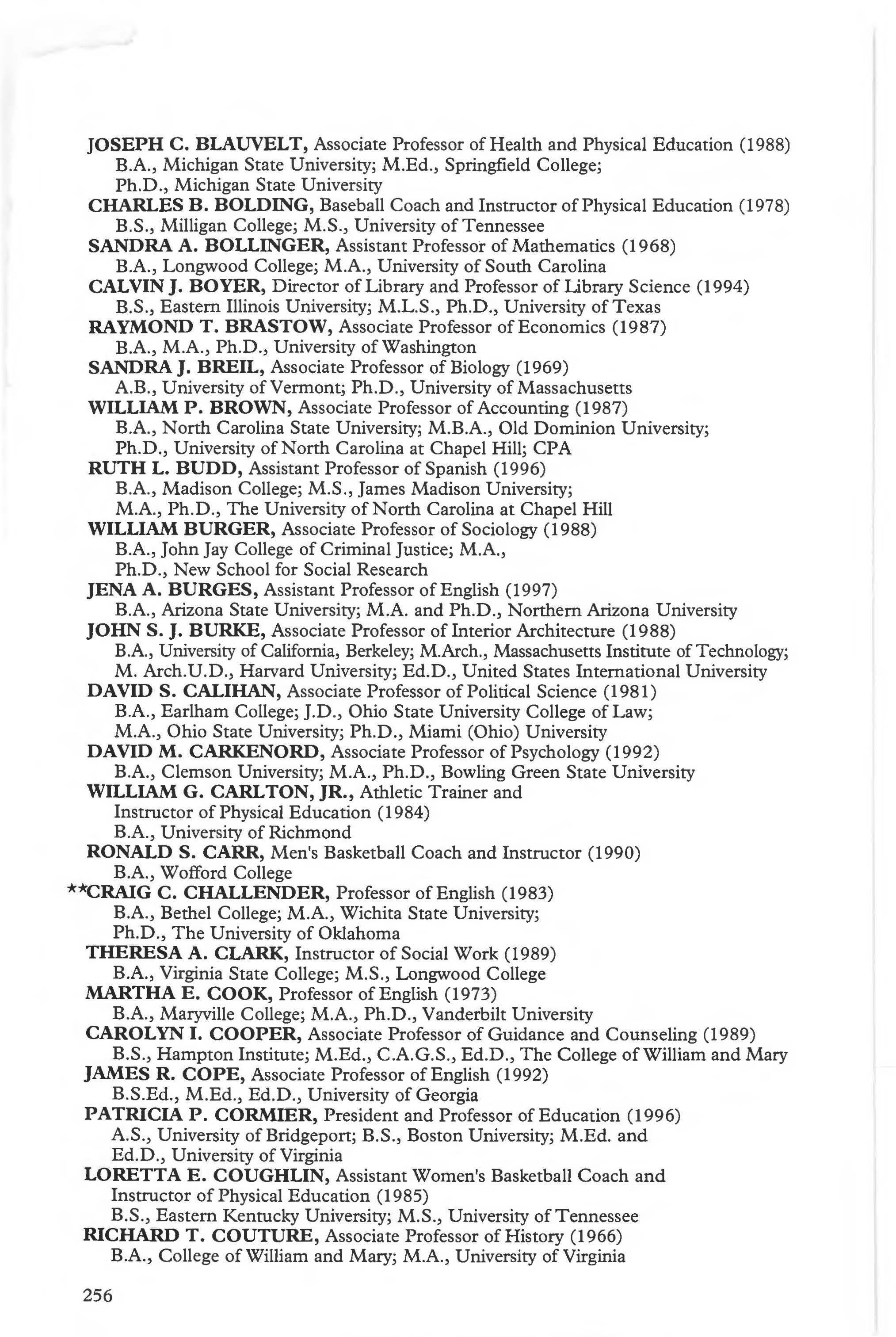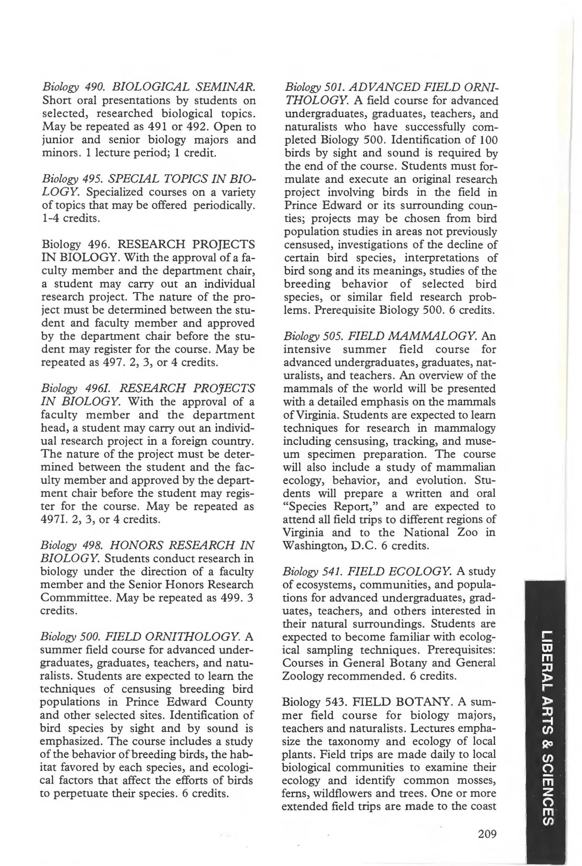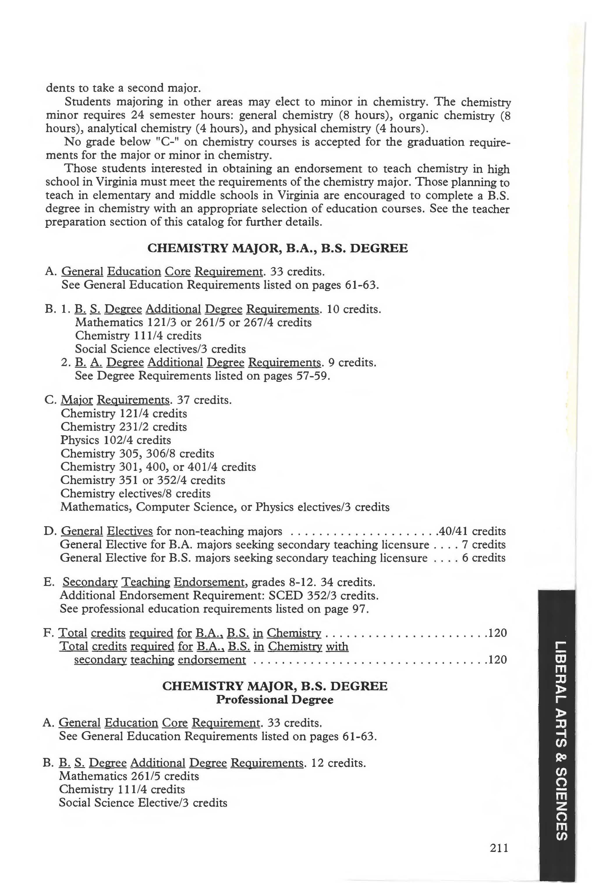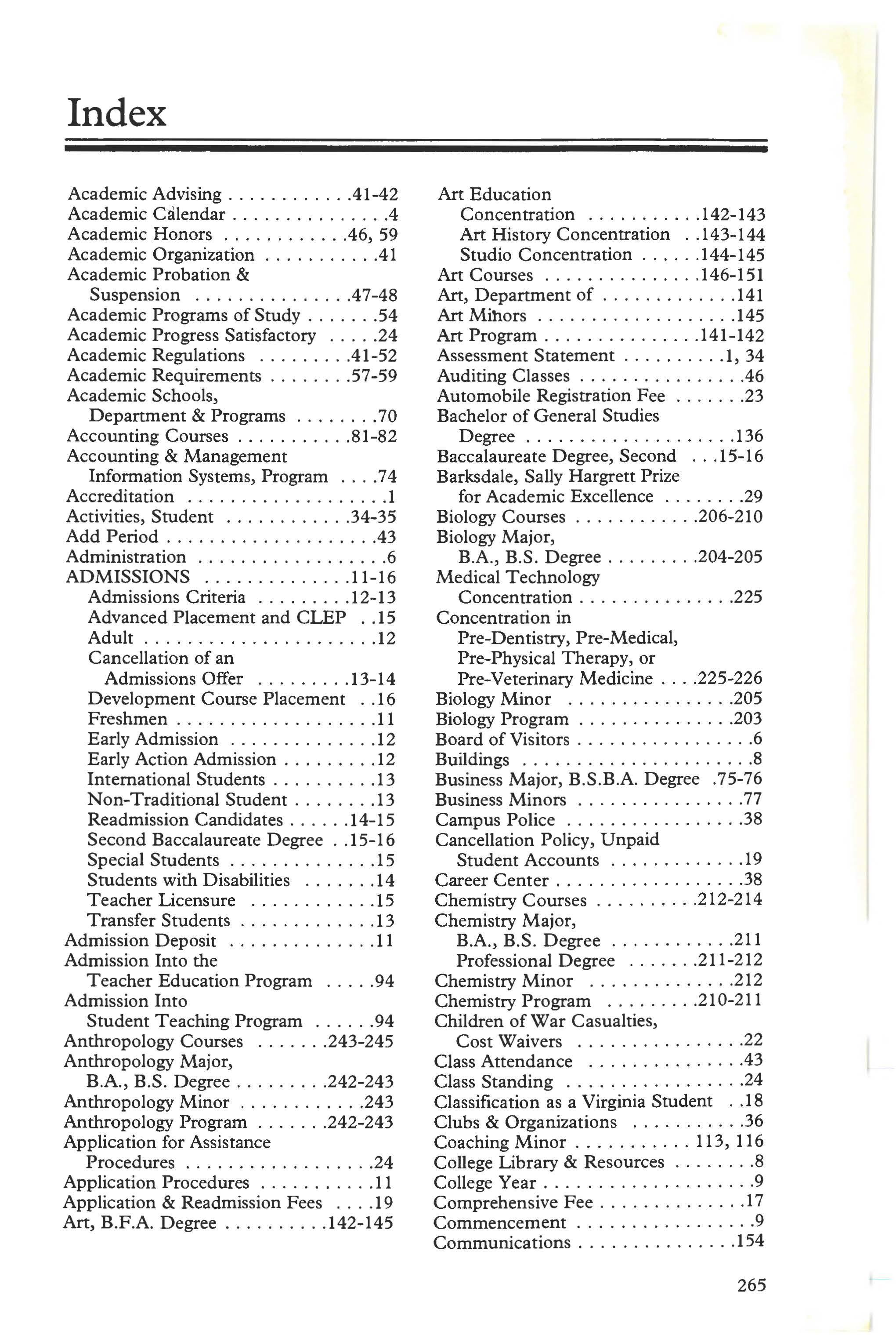 Art Education Concentration 142-143 Art History Concentration 143-144 Studio Concentration 144-145 Art Courses 146-151 Art, Department of . .. .. ...... .. 141 Art Mihors . . . . . . .. . ... .. ... . . 145 Art Program . .... .. ........ 141-142 Assessment Statement . 1, 34 Auditing Classes .46 Automobile Registration Fee 23 Bachelor of General Studies Degree 136 Baccalaureate Degree, Second ... 15-16 Barksdale, Sally Hargrett Prize for Academic Excellence ...... . .29 Biology Courses . . . .. . ...... 206-210 Biology Major, B.A , B S Degree 204-205 Medical Technology Concentration 225 Concentration in Pre-Dentistry, Pre-Medical, Pre-Physical Therapy, or Pre-Veterinary Medicine 225-226 Biology Minor 205 Biology Program 203 Board of Visitors 6 Buildings . .... ... ... . . . . ... .. . .8 Business Major, B .S.B.A. Degree .75-76 Business Minors . .. . . .... ... . . .. 77 Campus Police .. .... ... ...... . .38 Cancellation Policy, Unpaid Student Accounts 19 Career Center 38 Chemistry Courses 212-214 Chemistry Major, B.A., B.S . Degree 211 Professional Degree ....... 211-212 Chemistry Minor ... ... . ... . . .. 212 Chemistry Program ... ...... 210-211 Children of War Casualties, Cost Waivers . . .. . ...... ... . .22 Class Attendance .43 Class Standing . . .. ............ .24 Classification as a Virginia Student 18 Clubs & Organizations ........... 36 Coaching Minor .. ......... 113, 116 College Library & Resources ....... .8 College Year . . . . . . .. . . ...... .. . .9