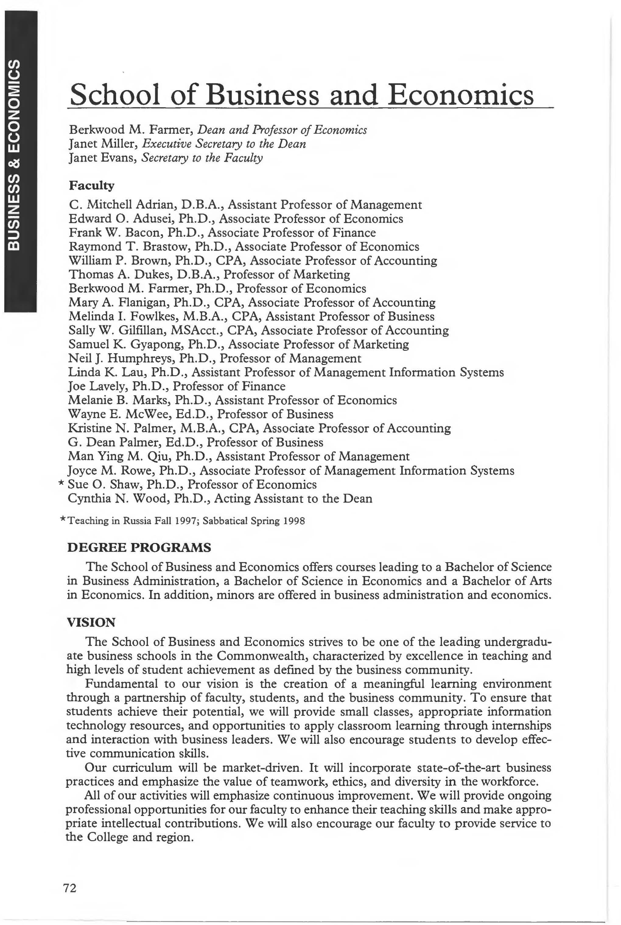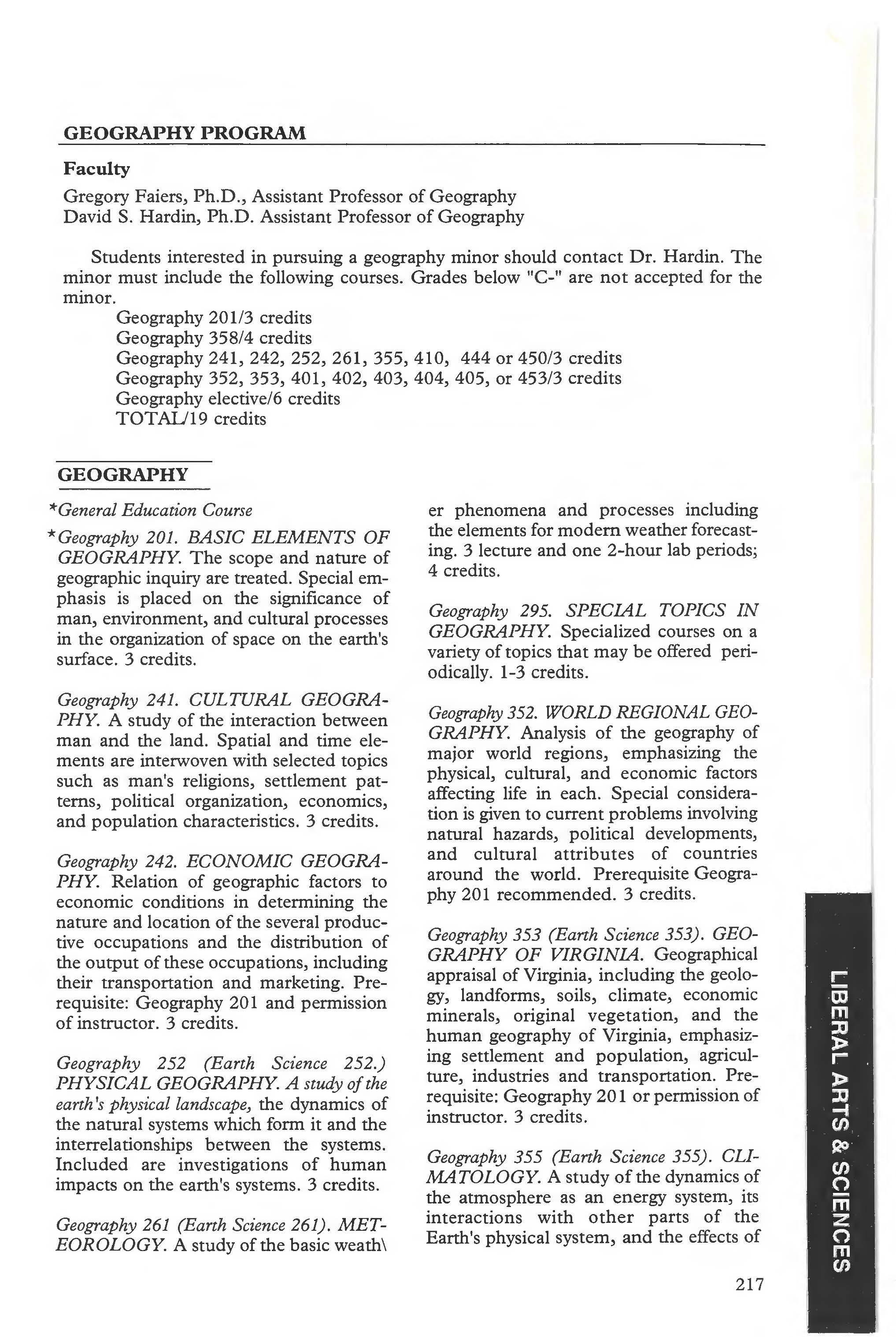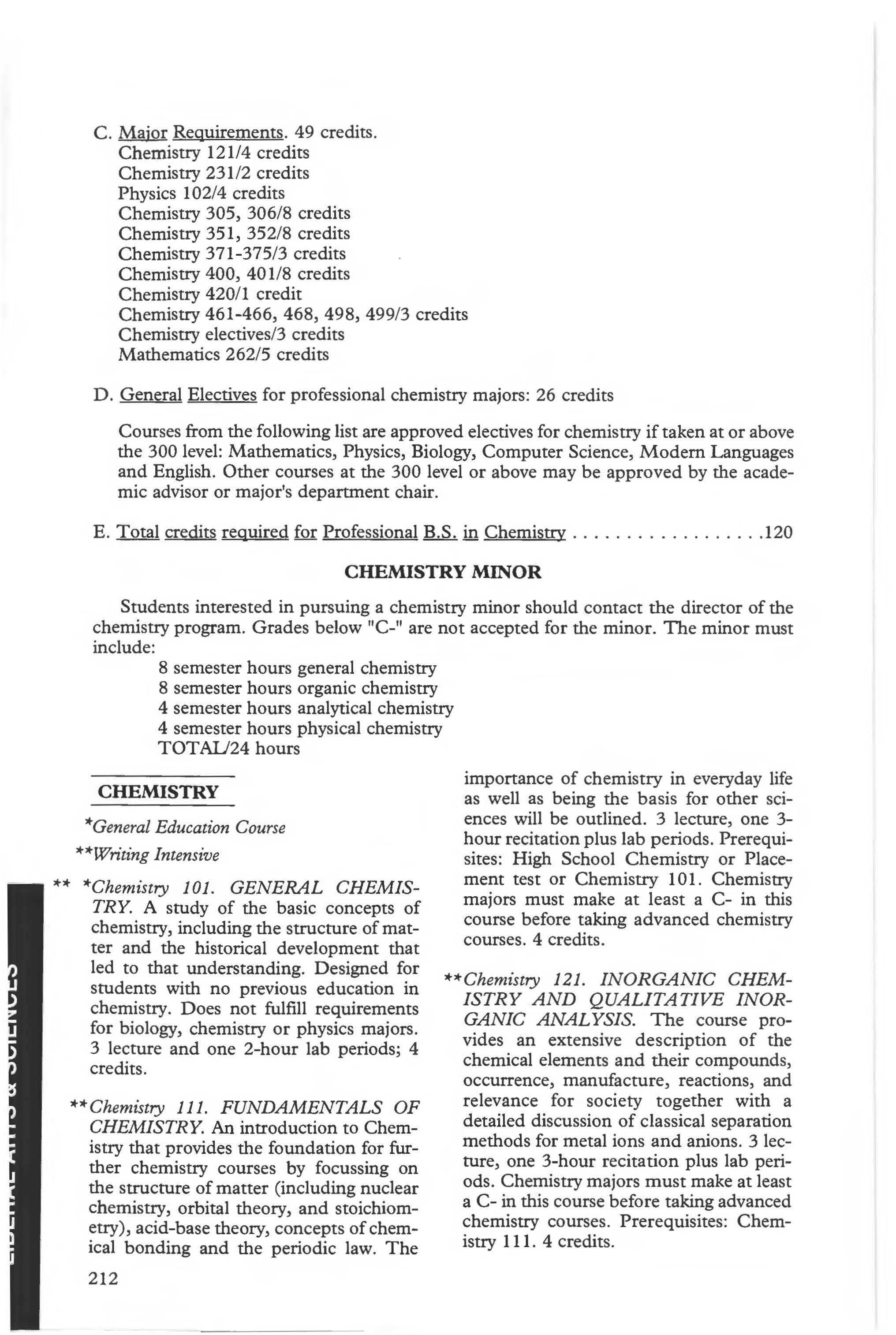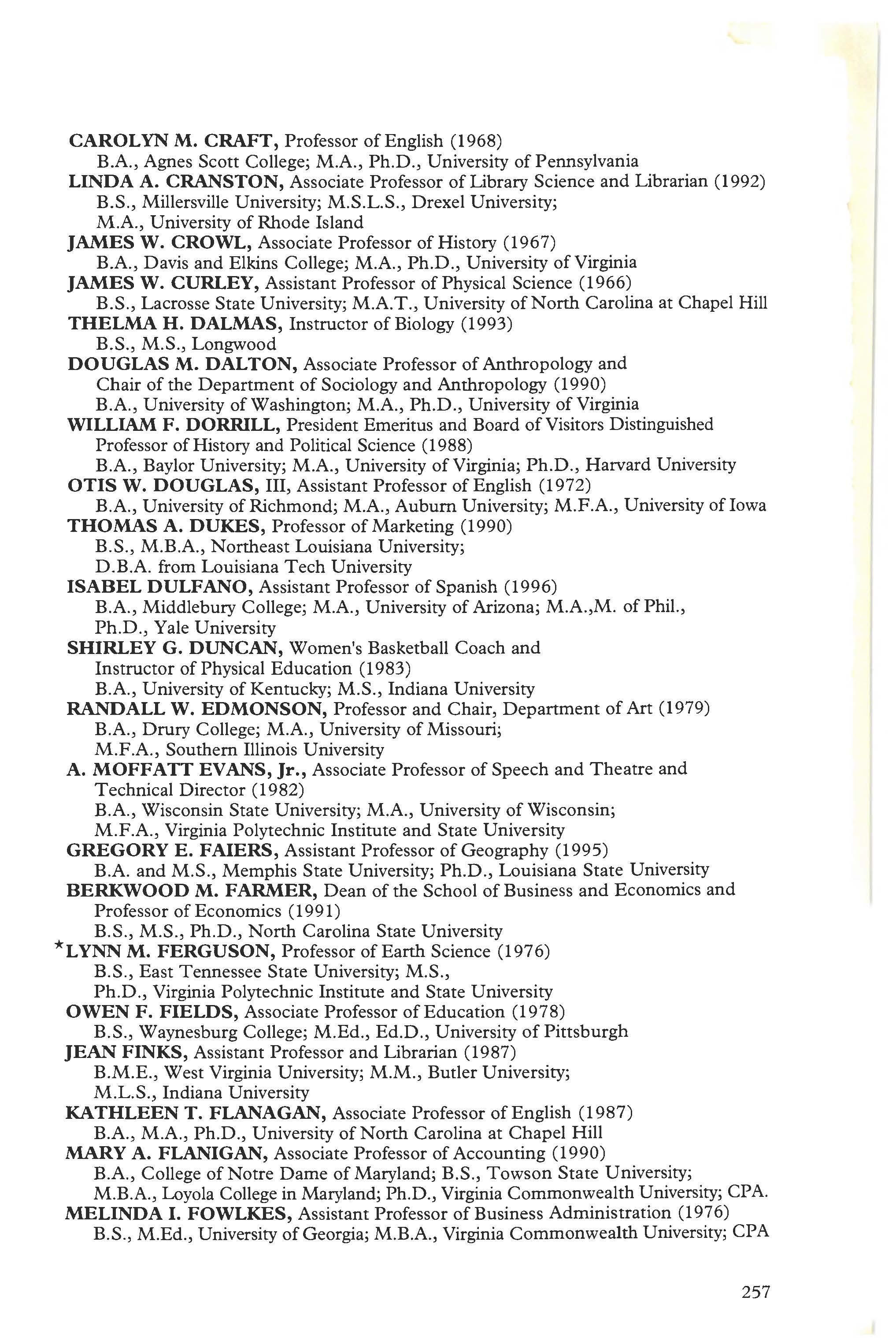 Art Education Concentration 142-143 Art History Concentration 143-144 Studio Concentration 144-145 Art Courses 146-151 Art, Department of . .. .. ...... .. 141 Art Mihors . . . . . . .. . ... .. ... . . 145 Art Program . .... .. ........ 141-142 Assessment Statement . 1, 34 Auditing Classes .46 Automobile Registration Fee 23 Bachelor of General Studies Degree 136 Baccalaureate Degree, Second ... 15-16 Barksdale, Sally Hargrett Prize for Academic Excellence ...... . .29 Biology Courses . . . .. . ...... 206-210 Biology Major, B.A , B S Degree 204-205 Medical Technology Concentration 225 Concentration in Pre-Dentistry, Pre-Medical, Pre-Physical Therapy, or Pre-Veterinary Medicine 225-226 Biology Minor 205 Biology Program 203 Board of Visitors 6 Buildings . .... ... ... . . . . ... .. . .8 Business Major, B .S.B.A. Degree .75-76 Business Minors . .. . . .... ... . . .. 77 Campus Police .. .... ... ...... . .38 Cancellation Policy, Unpaid Student Accounts 19 Career Center 38 Chemistry Courses 212-214 Chemistry Major, B.A., B.S . Degree 211 Professional Degree ....... 211-212 Chemistry Minor ... ... . ... . . .. 212 Chemistry Program ... ...... 210-211 Children of War Casualties, Cost Waivers . . .. . ...... ... . .22 Class Attendance .43 Class Standing . . .. ............ .24 Classification as a Virginia Student 18 Clubs & Organizations ........... 36 Coaching Minor .. ......... 113, 116 College Library & Resources ....... .8 College Year . . . . . . .. . . ...... .. . .9