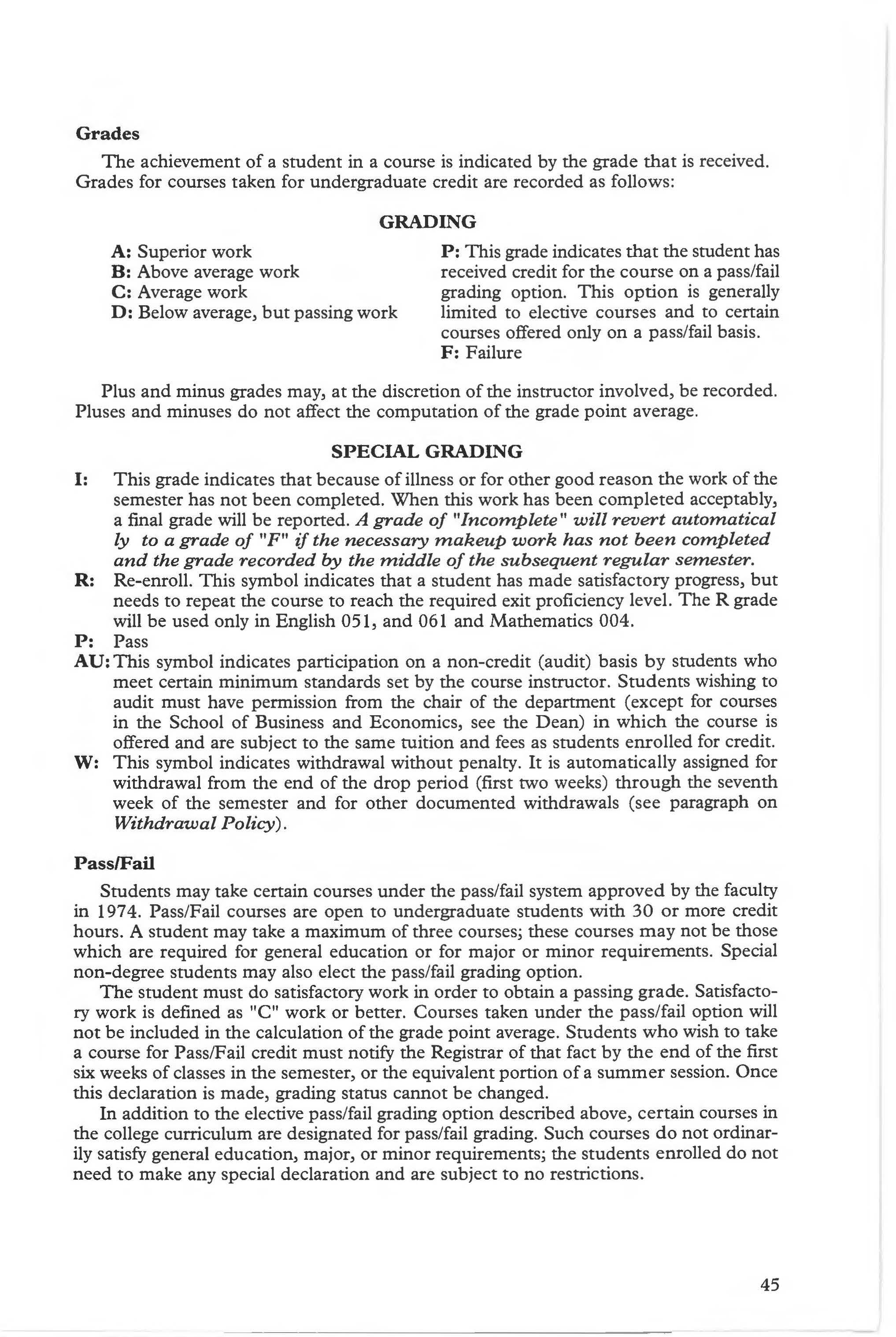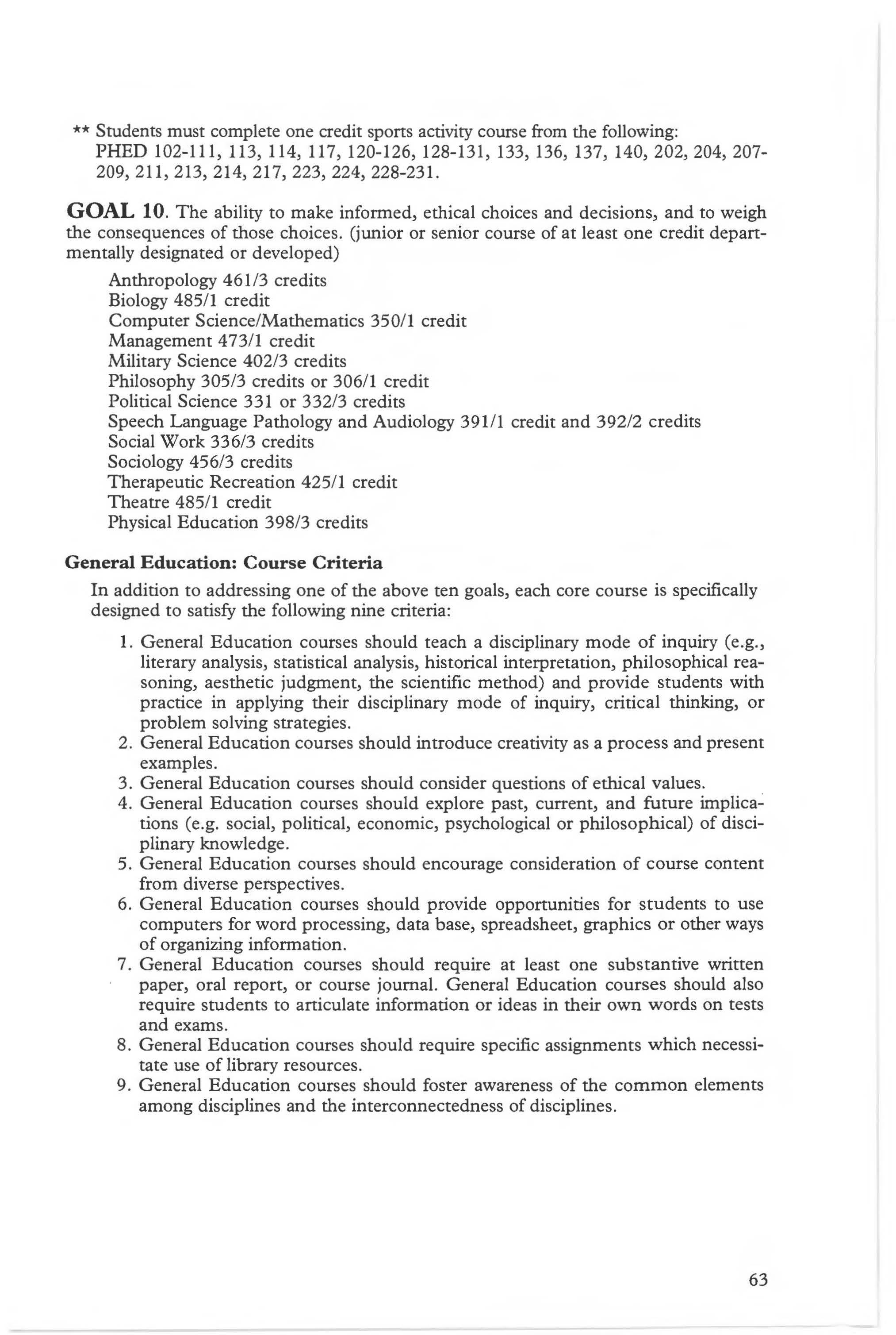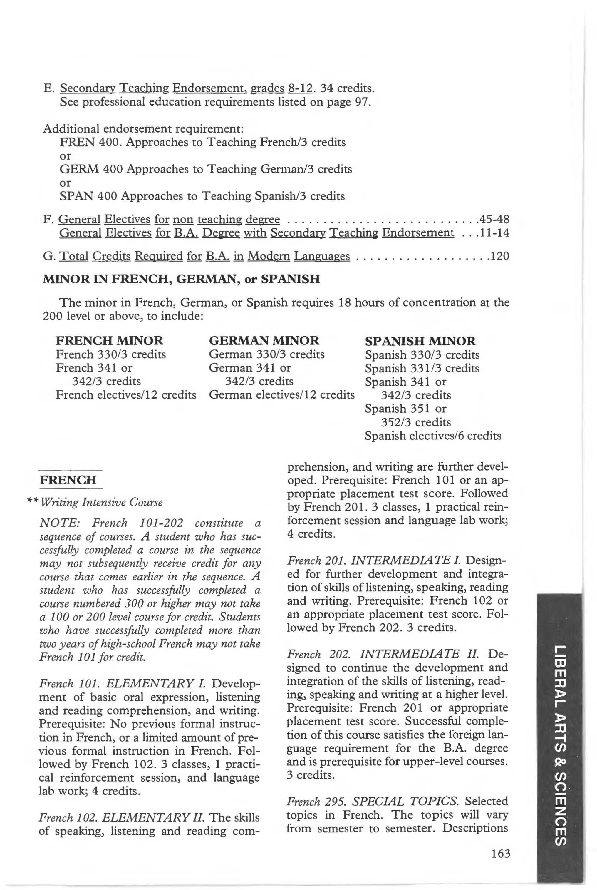 French 161 French Courses 163-165 Freshmen, Admission Requirements .11 Freshman Year Requirement 57 General Education . .... . .... . . 61-63 General Education Requirements .... 61 General Studies Degree 136 General Studies Program .. ....... 136 Geography Courses 217-218 Geography Program 217 German 161 German Courses 165-166 Grade Appeals 47 Grade Estimates .... . . ...... .... 47 Grade Level Progression .......... 24 Grades 45