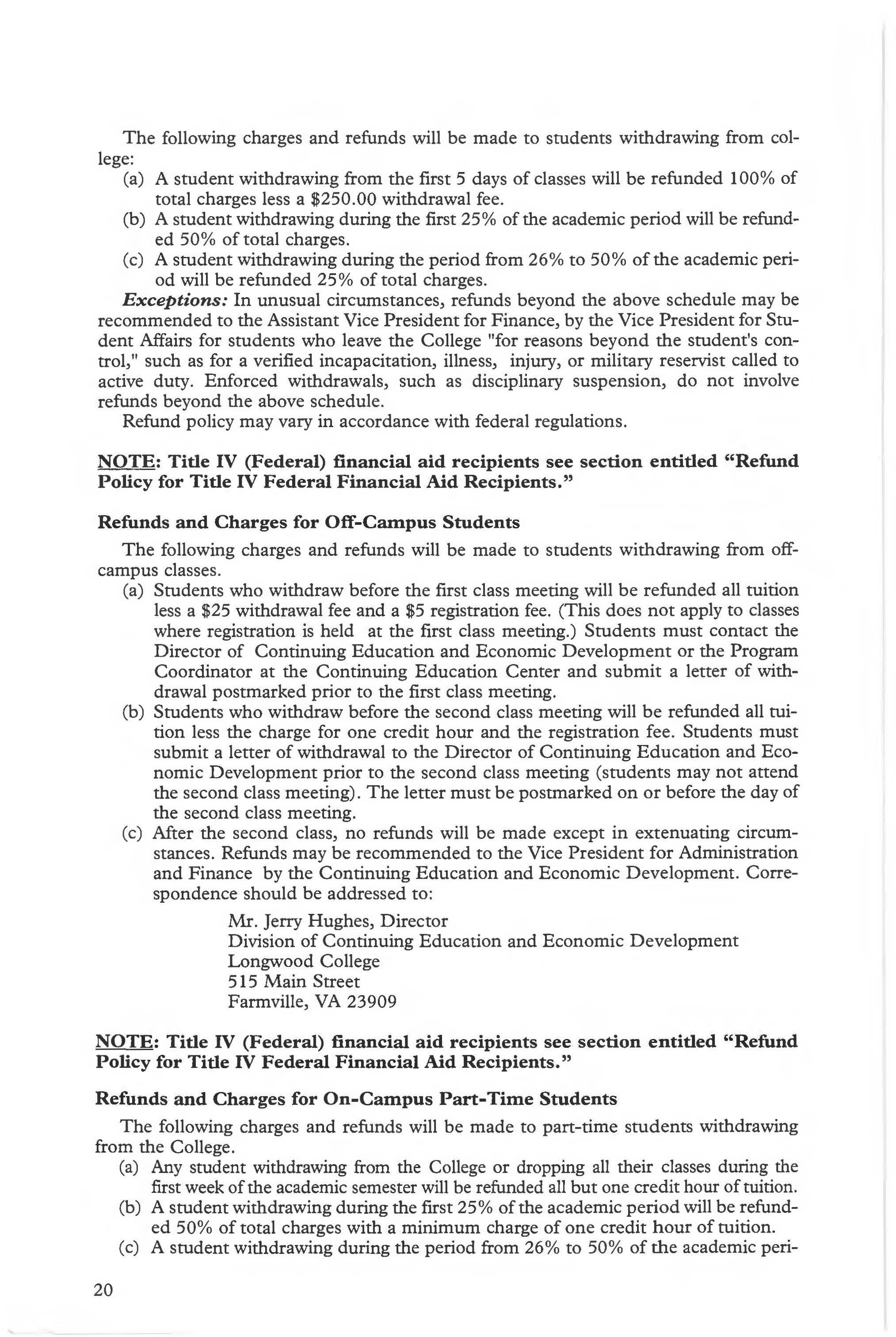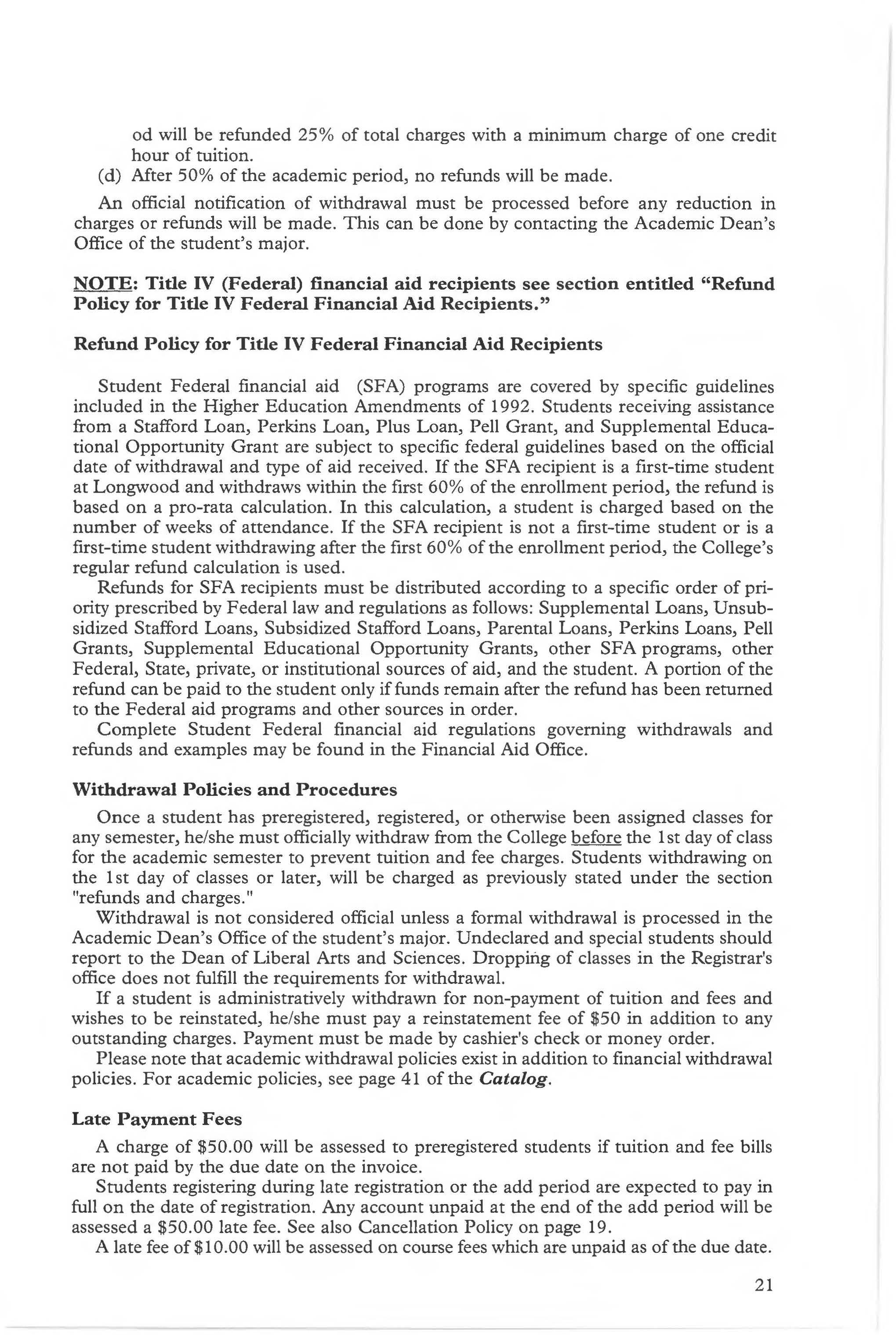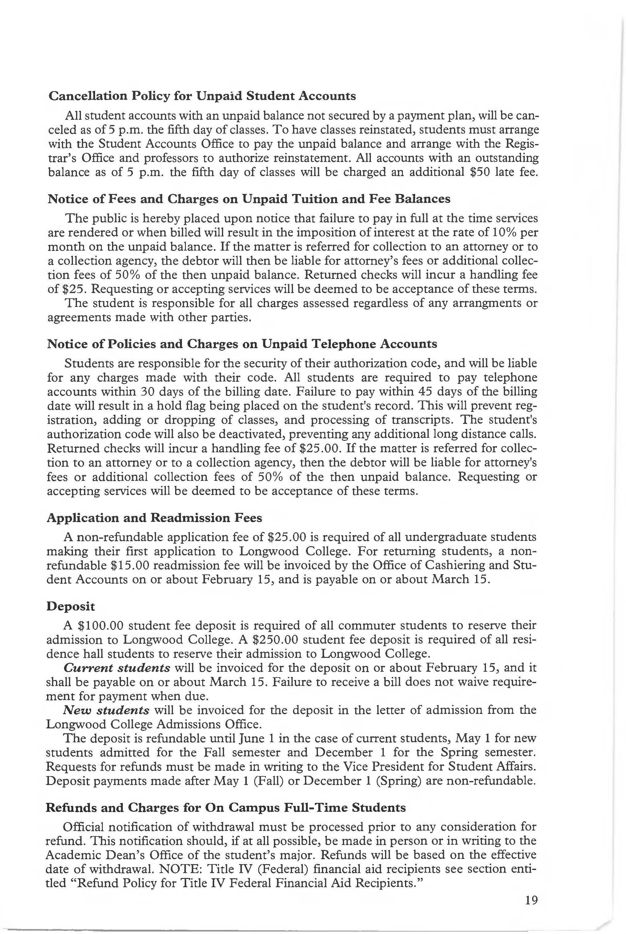 Environmental/Studies Minor . . ... 205 Examination Fee, Special 23 Examinations 44 Re-examination Policy 48 Exercise Science 113 Expenses & Financial Aid .. . . . . . . . 17 Faculty, Longwood ... ...... 255-263 Fees & Expenses for Students 17 Late Payment Fee 21 Policy on Minimum Refunds 22 Policy on Unpaid Tuition and Fees 19 Policy on Unpaid Telephone Accounts 19