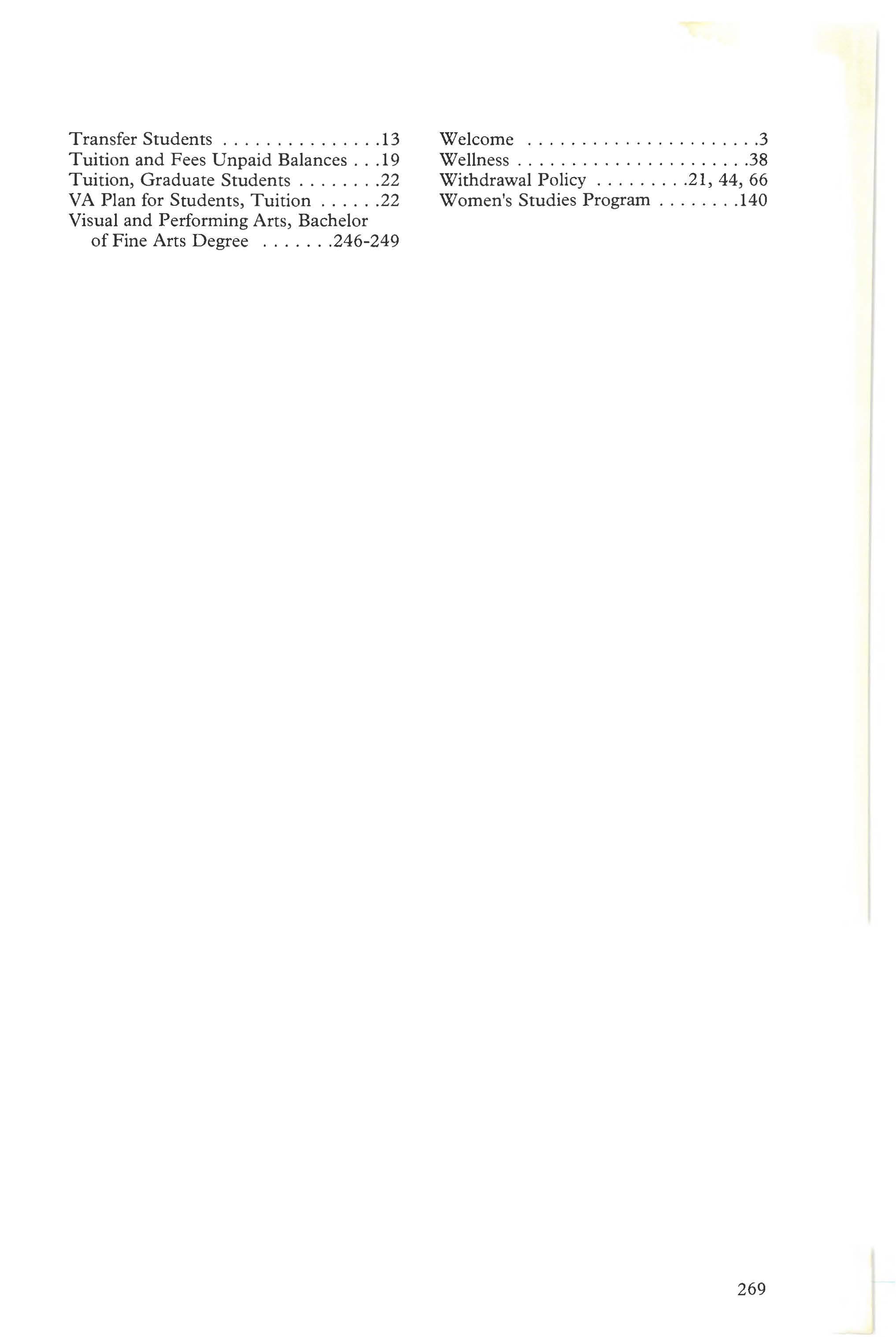 Tuition and Fees Unpaid Balances 19 Wellness 38 Tuition, Graduate Students . . .. . . .. 22 Withdrawal Policy 21, 44, 66 VA Plan for Students, Tuition ...... 22 Women' s Studies Program 140 Visual and Performing Arts, Bachelor of Fine Arts Degree ....... 246-249