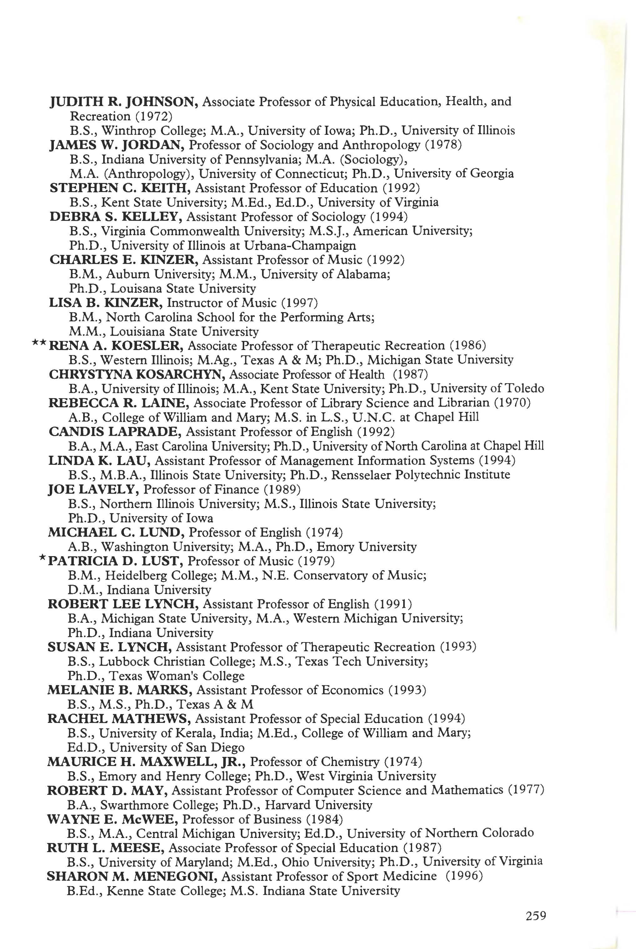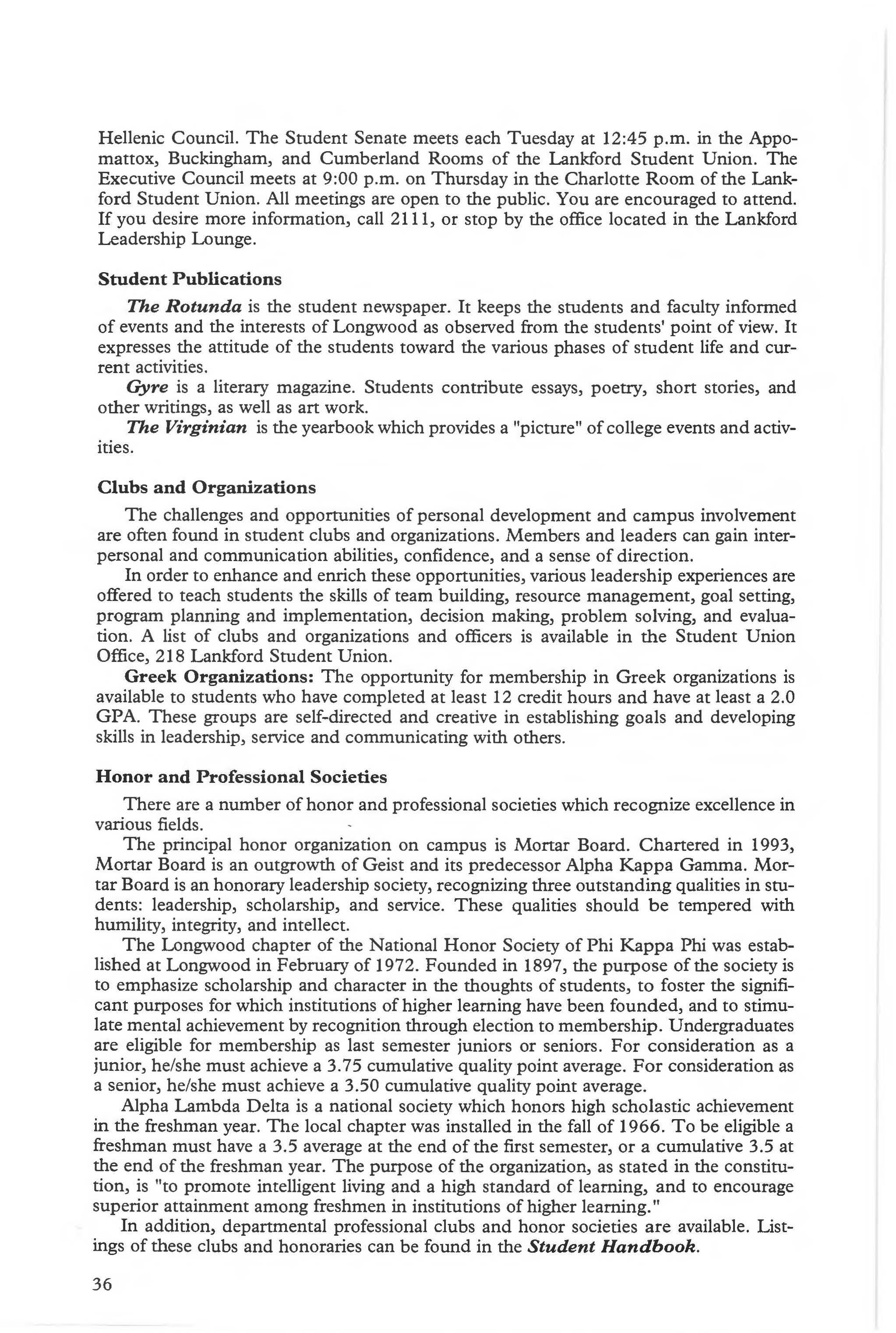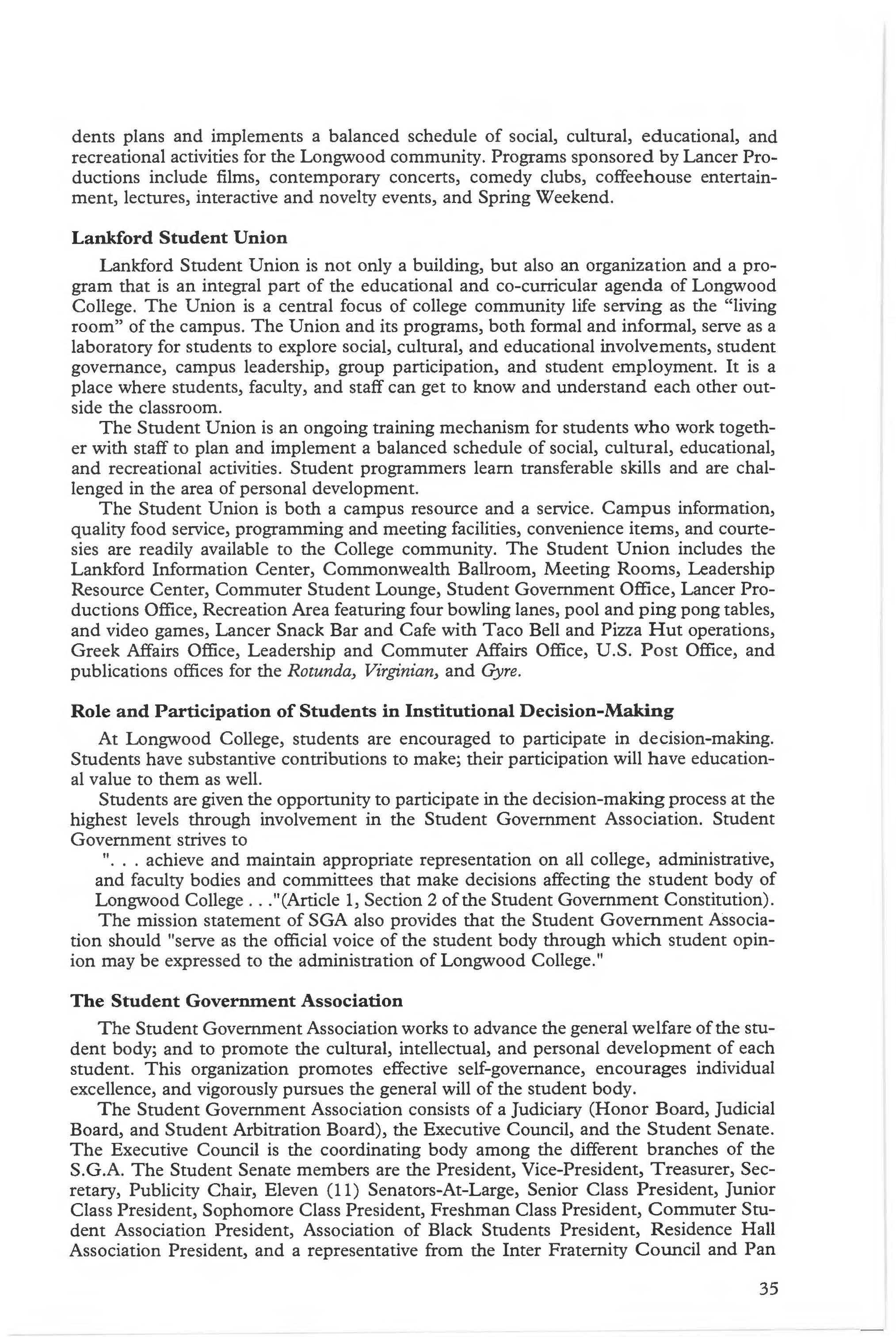 Speech Program ............... 252 Speech Minor 252 Speech and Theatre, Licensure in 252 Speech and Theatre, Depart. of. . .. 246 Sports Medicine . . . . ........... 113 State Residency .... . . ....... ... 18 Student Activities ............. 32-33 Student Affairs 31-32 Student Affairs, Vice President for ... ....... 31-32 Students, Dean of ... ........ .31-32 Student Assessment .. .. ....... 1, 34 Student Employment ......... ... 39 Student Goals 31 Student Government Association 35-36 Student Health Services 39 Student Services 31-39 Student Load .42 Student Publications . . . . ........ .36 Student Records, Longwood College Policy on .... . ......... ... 49-50