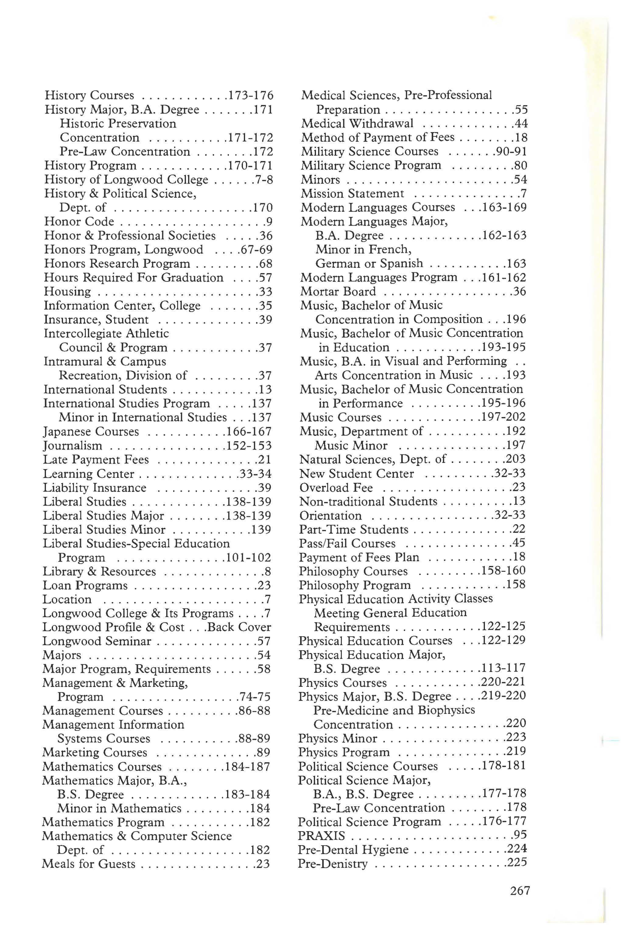 History of Longwood College ...... 7-8 History & Political Science, Dept. of . . ......... . . ... . . . 170 Honor Code 9 Honor & Professional Societies 36 Honors Program, Longwood 67-69 Honors Research Program ....... . . 68 Hours Required For Graduation .... 57 Housing .................. . ... 33 Information Center, College 35 Insurance, Student 39 Intercollegiate Athletic Council & Program 37 Intramural & Campus Recreation, Division of .. ..... .. 37 International Students 13