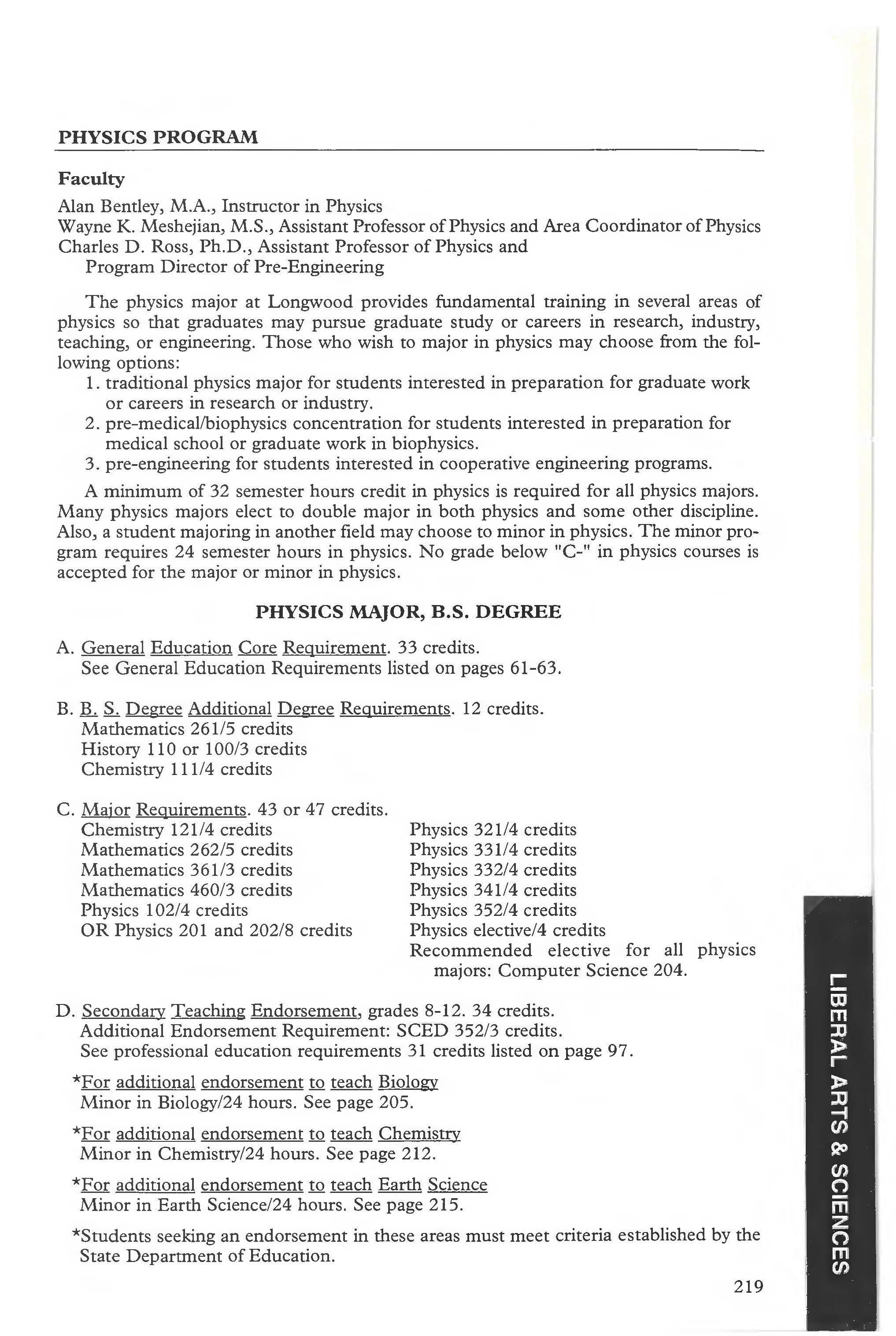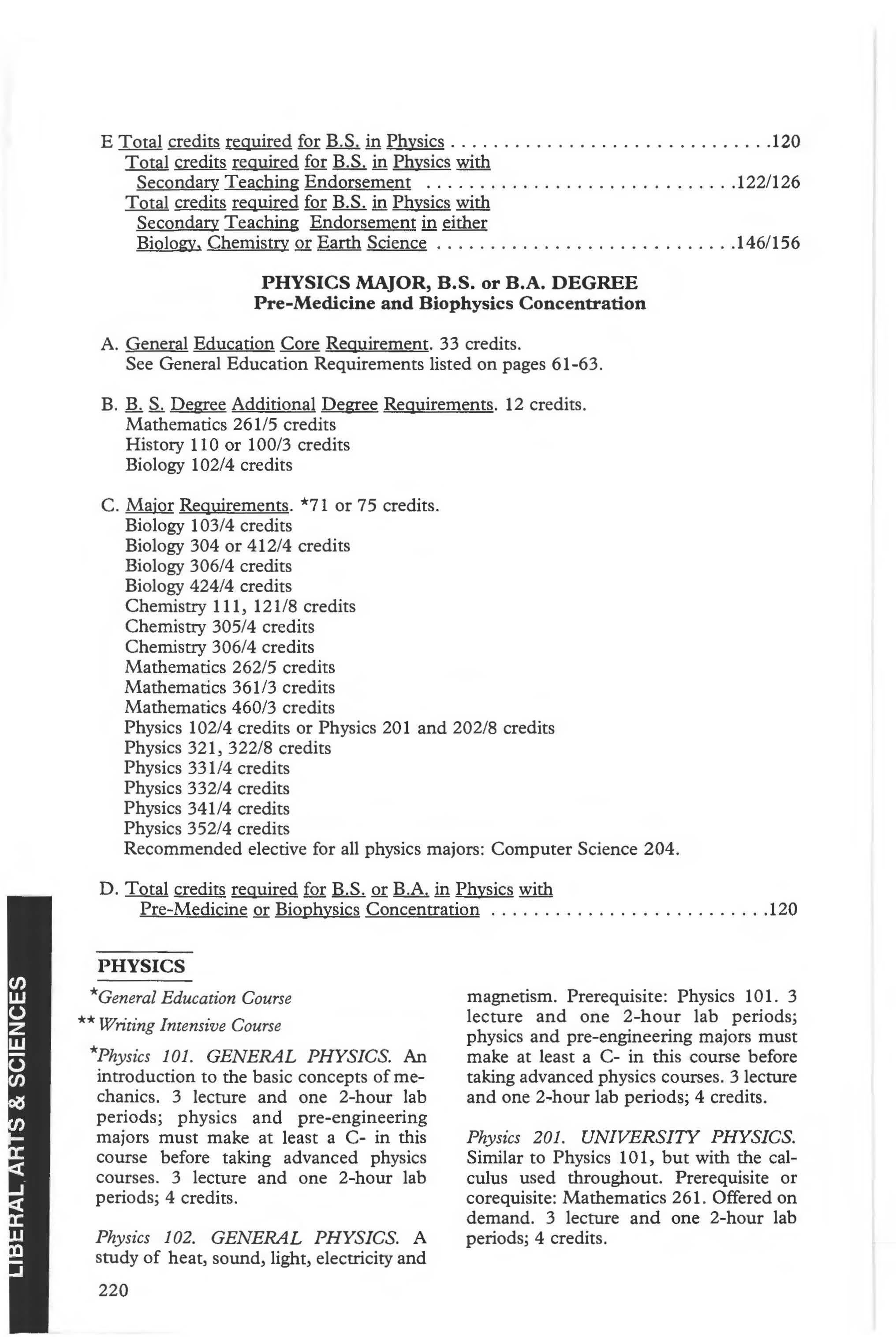 Physical Education Courses ... 122-129 Physical Education Major, B.S. Degree .. ..... . ..... 113-117 Physics Courses . .. .. ....... 220-221 Physics Major, B.S. Degree .... 219-220 Pre-Medicine and Biophysics Concentration ............... 220 Physics Minor 223 Physics Program ............... 219