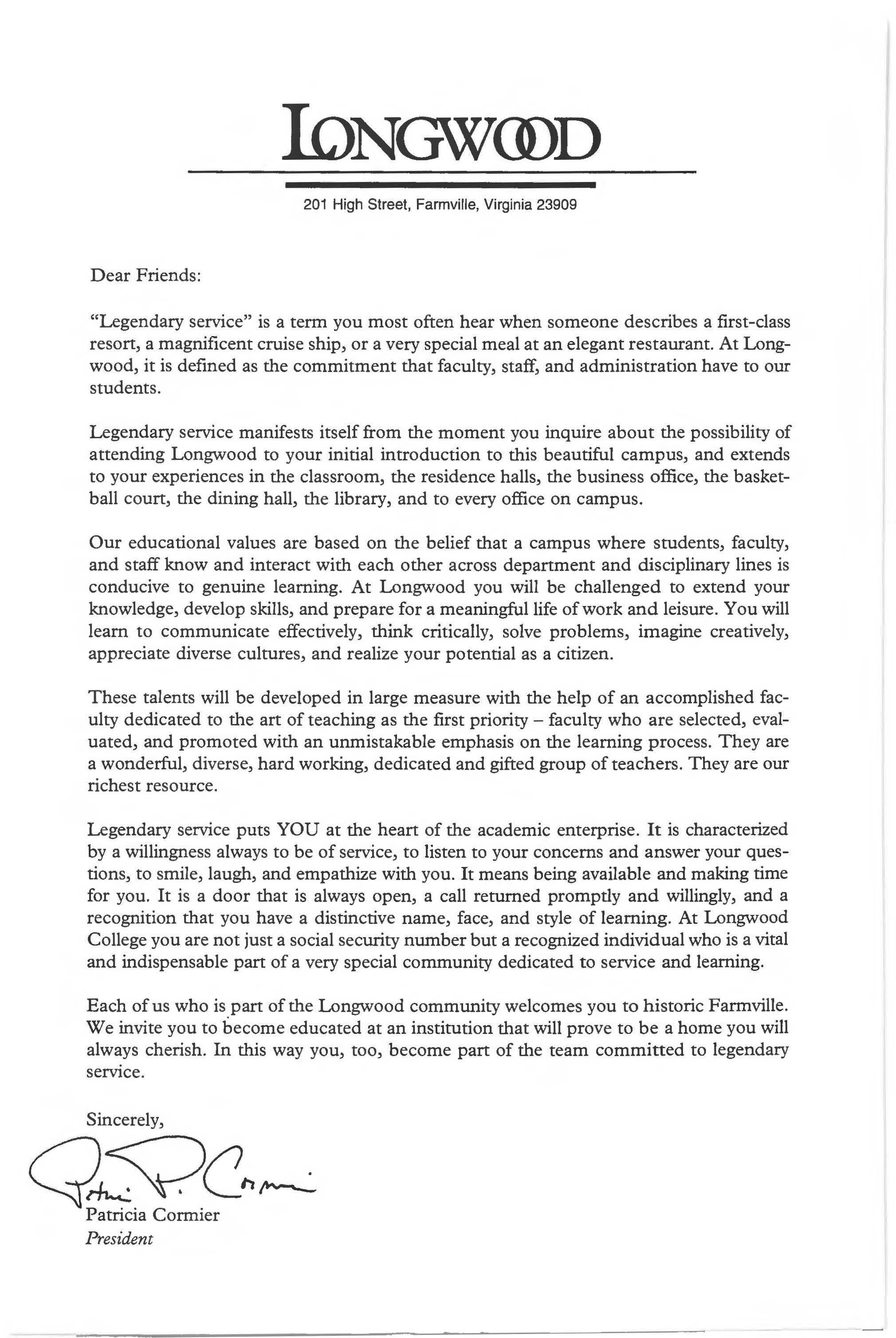 Each of us who is part of the Longwood community welcomes you to historic Farmville. We invite you to become educated at an institution that will prove to be a home you will always cherish. In this way you, too, become part of the team committed to legendary service.