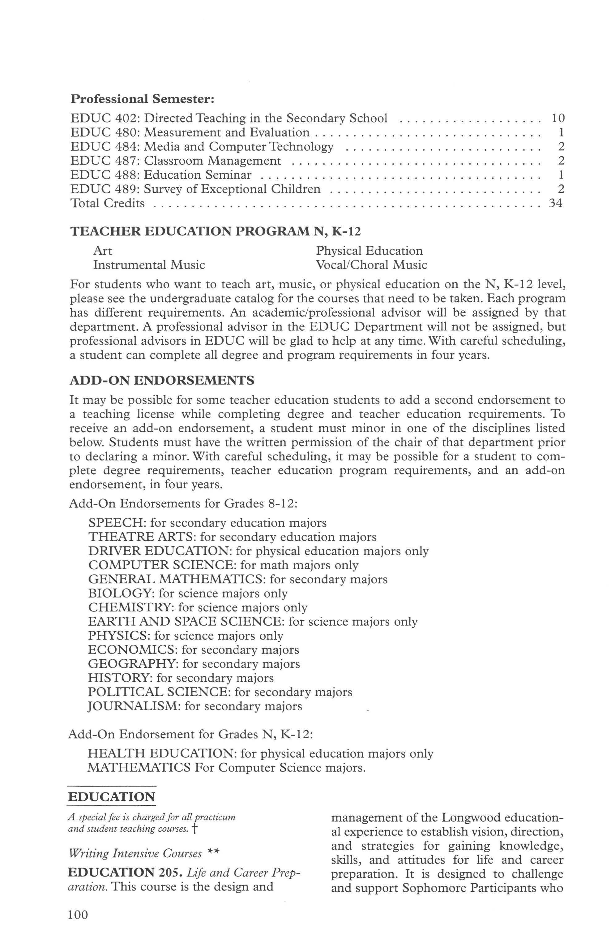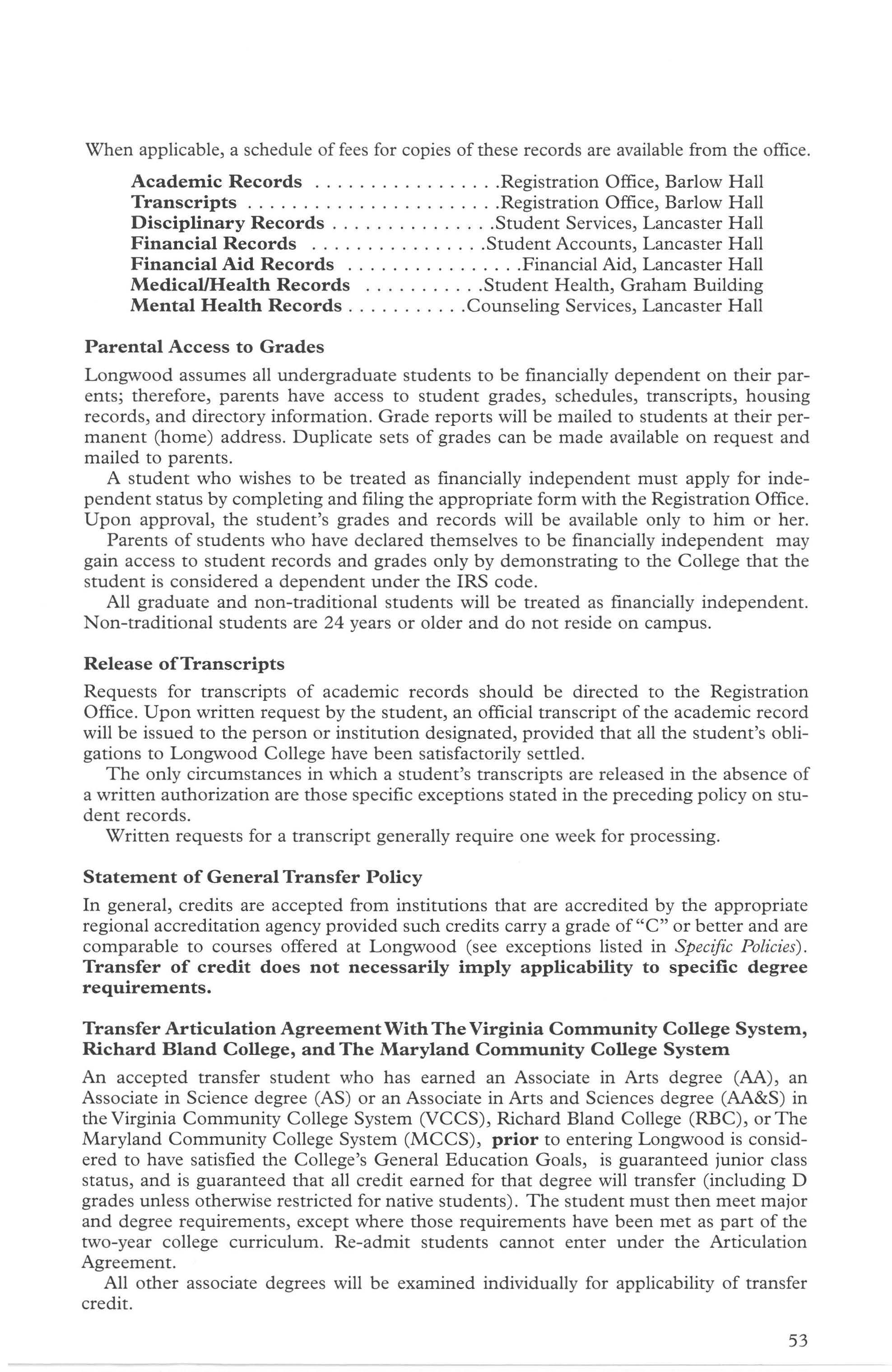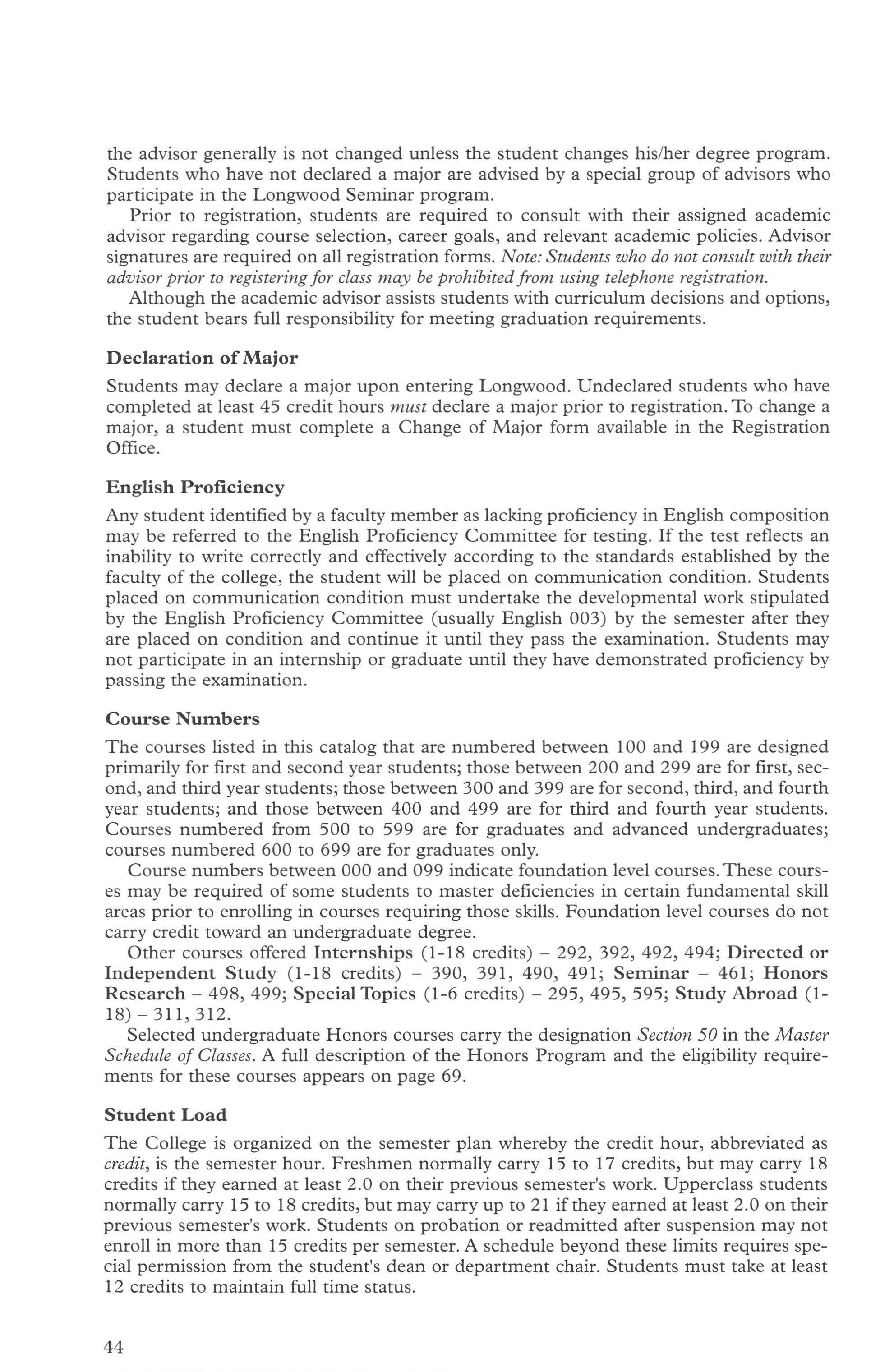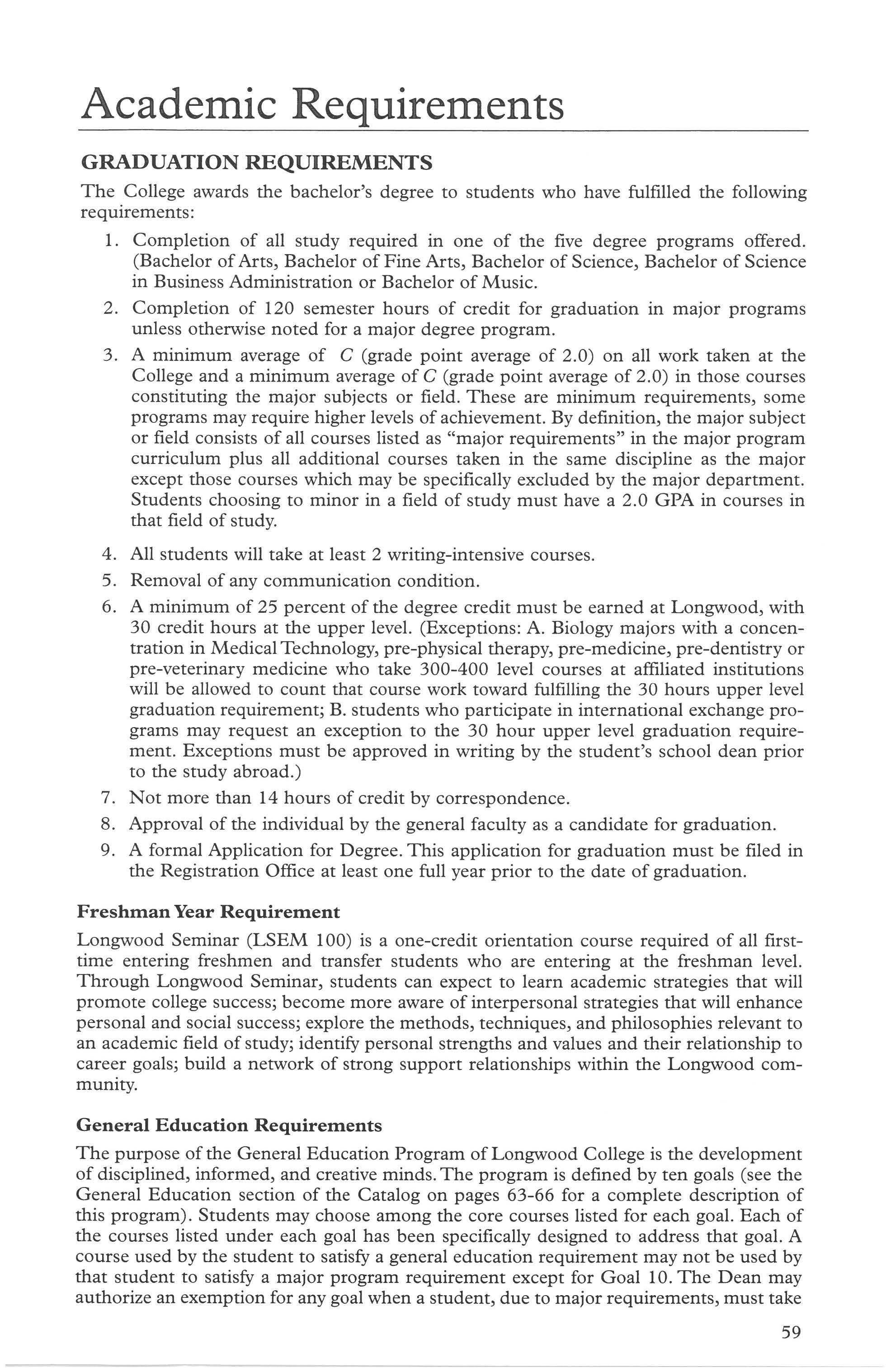 This catalog describes Longwood's academic programs, including course numbers, descriptions, and standards for student progress and retention at the time of publication . However, the provisions of this publication are not to be regarded as an irrevocable contract between the student and Longwood College. There are established procedures for making changes which protect the institution's right to make changes deemed appropriate. A change of curriculum or graduation requirement is not made retroactive unless the alteration is to the student's advantage and can be accommodated within the span of years normally required for graduation.