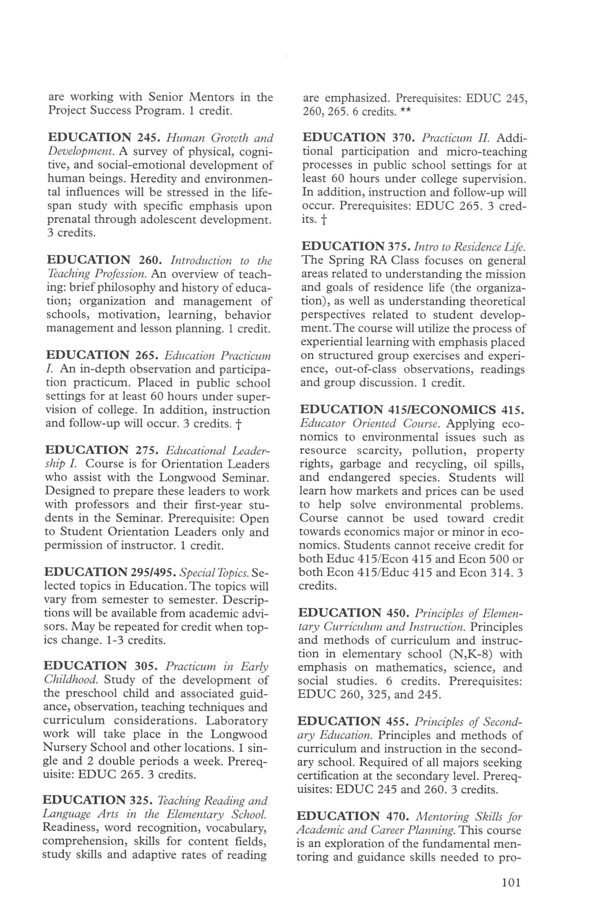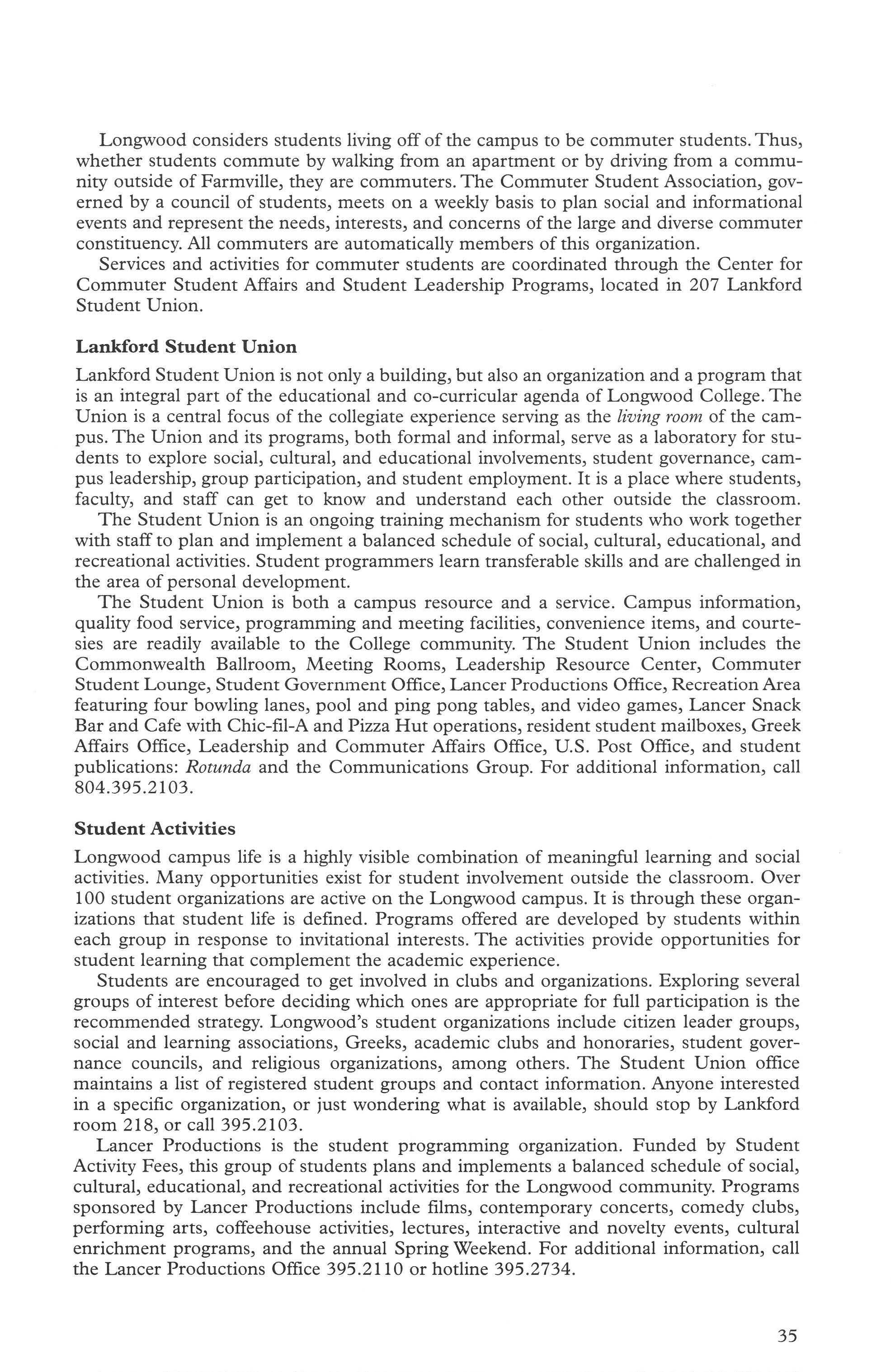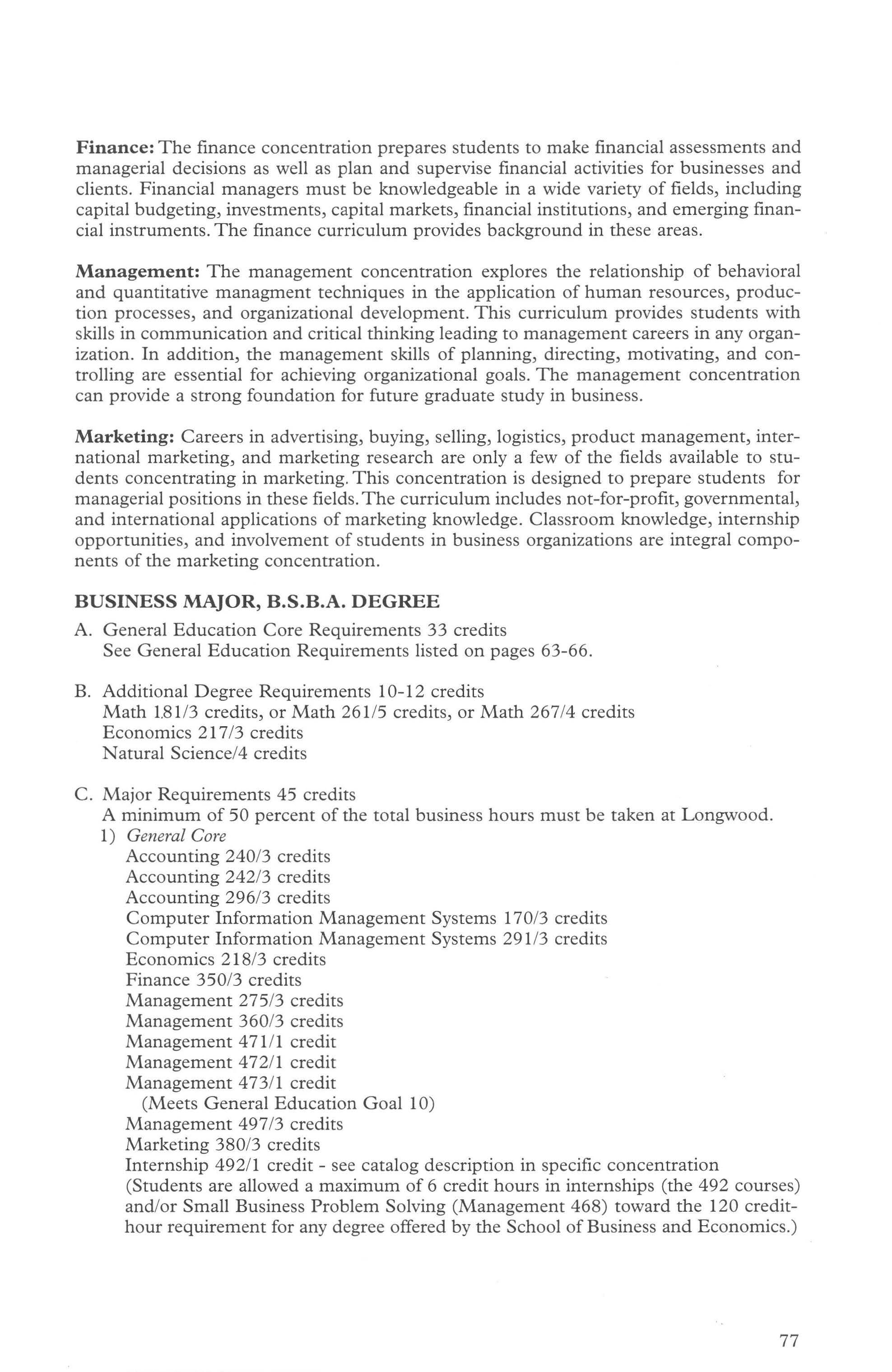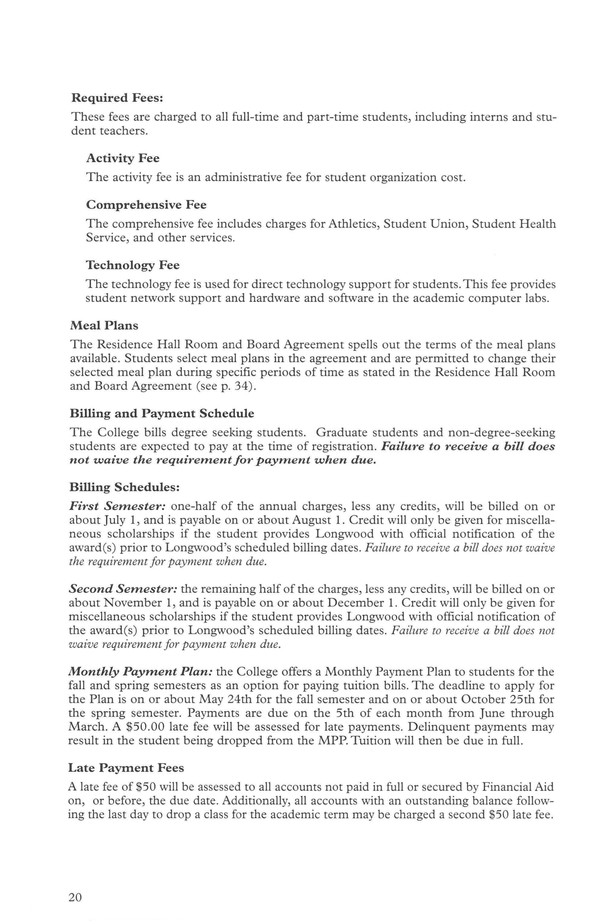 This catalog describes Longwood's academic programs, including course numbers, descriptions, and standards for student progress and retention at the time of publication . However, the provisions of this publication are not to be regarded as an irrevocable contract between the student and Longwood College. There are established procedures for making changes which protect the institution's right to make changes deemed appropriate. A change of curriculum or graduation requirement is not made retroactive unless the alteration is to the student's advantage and can be accommodated within the span of years normally required for graduation.