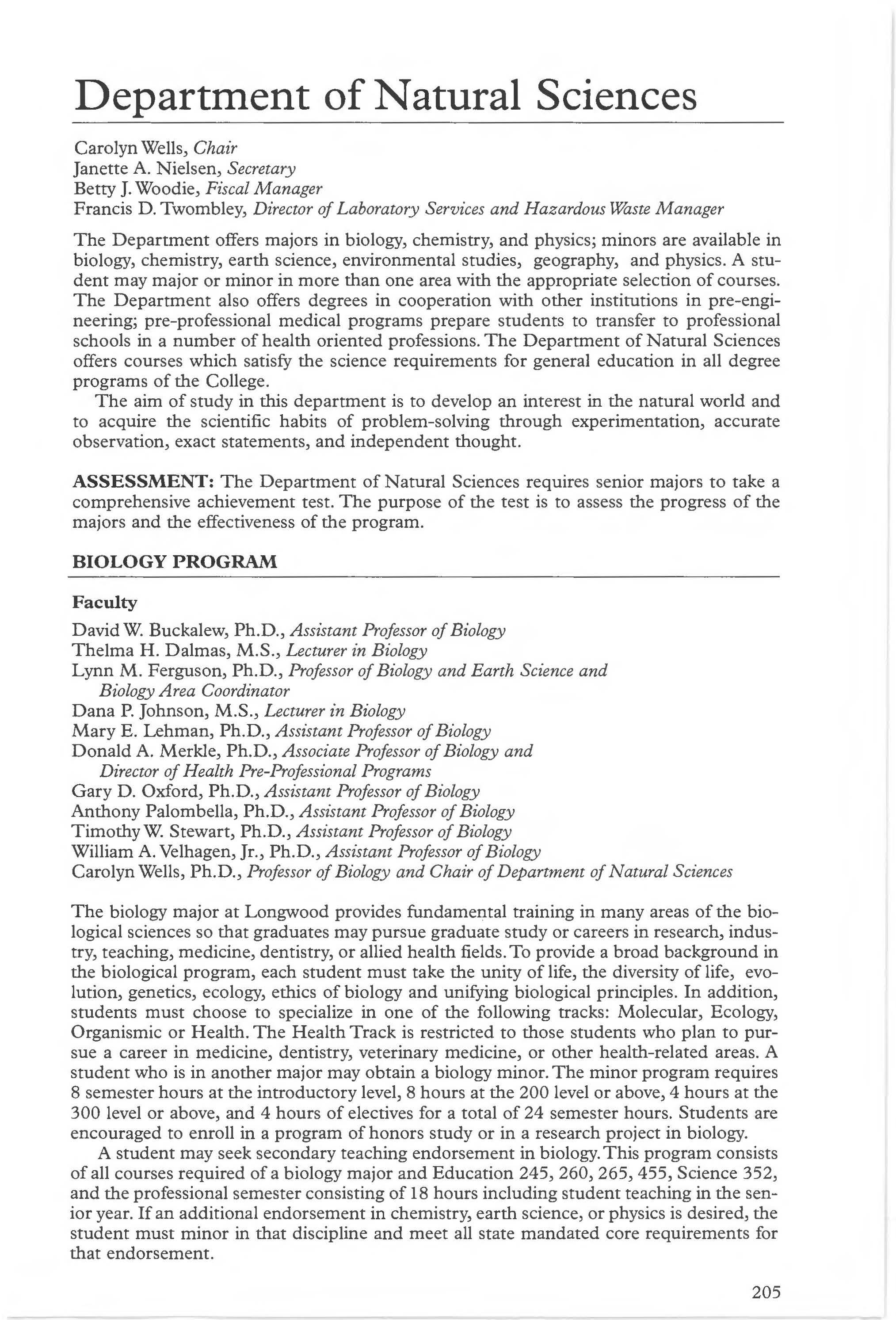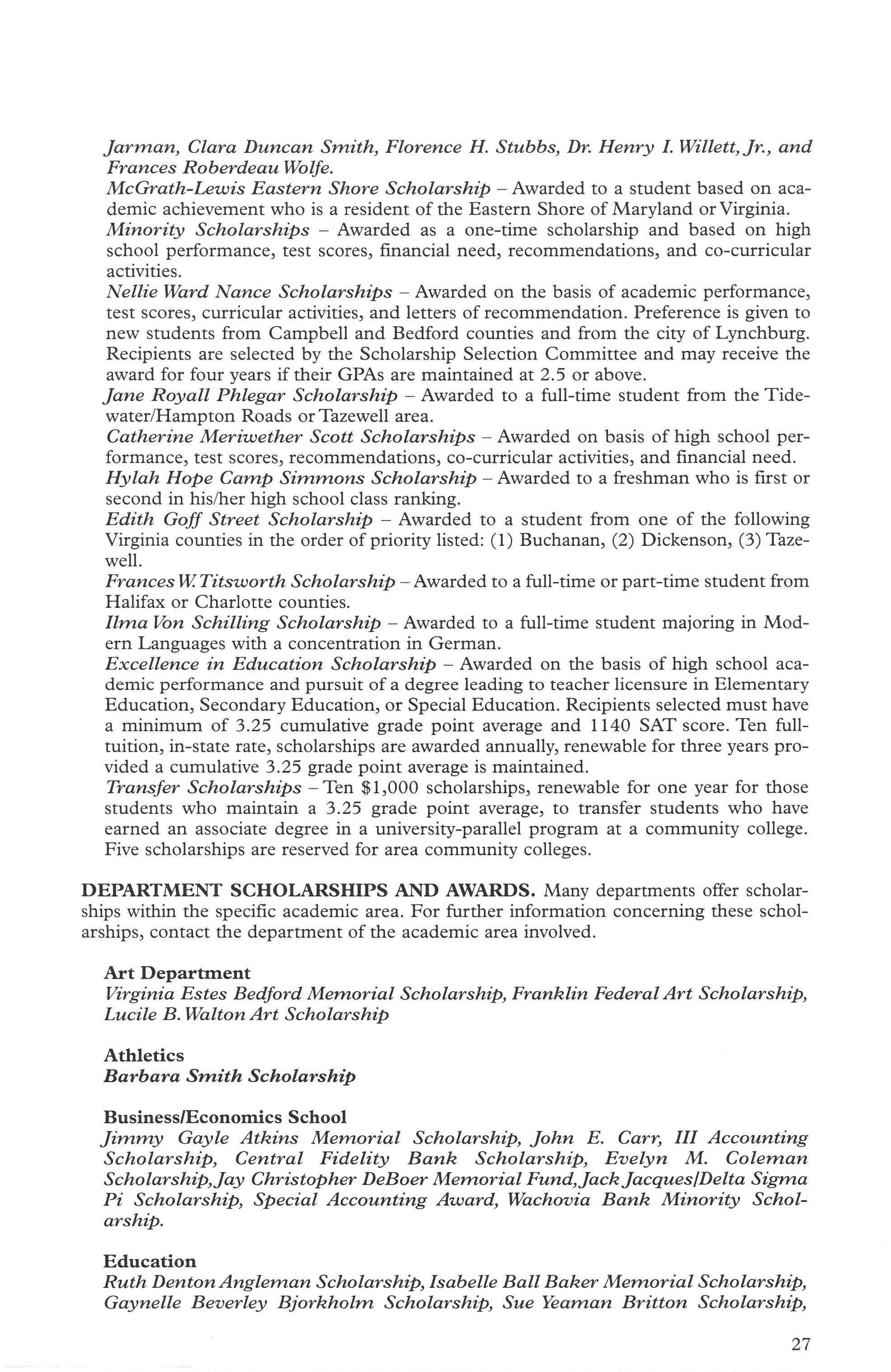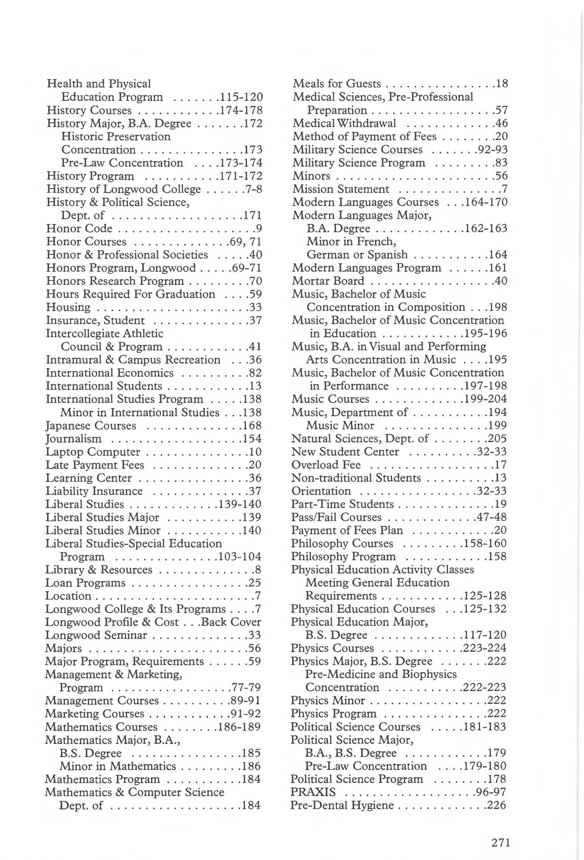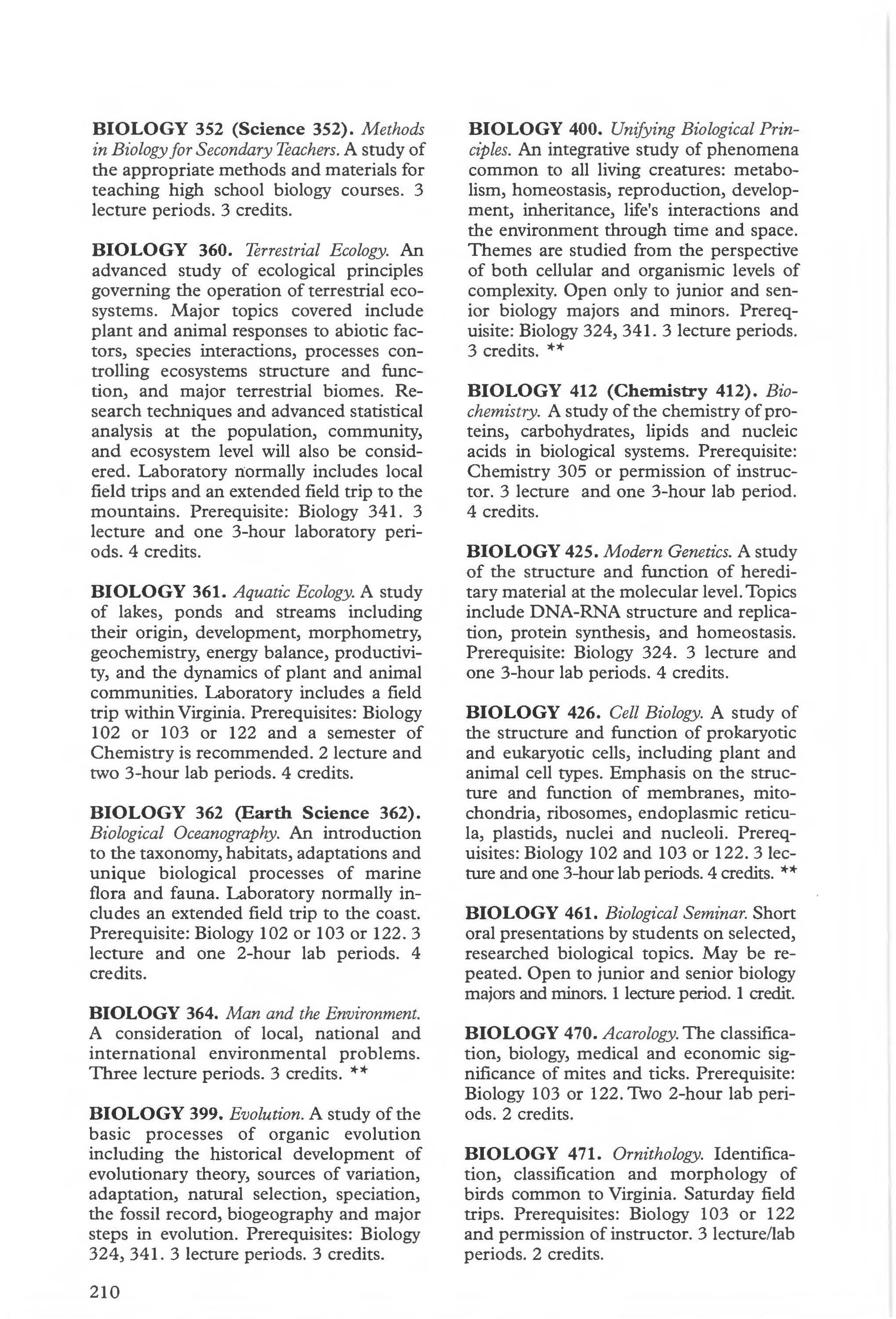 Art Courses .. ............. 147-151 Art, Department of ............. 142 Art Minors ................... 146 Art Program .............. 142-143 Assessment Statement 1, 43 Athletic Training Program .116, 119-120 Auditing Classes . .. .... ... ...... 48 Automobile Registration Fee 17 Baccalaureate Degree, Second 16 Barksdale, Sally Hargrett Prize for Academic Excellence 30 Biology Courses 208-212 Biology Major, B.A., B.S. Degree ......... 206-207 Medical Technology Concentration 227 Concentration in Pre-Dentistry, Pre-Medical, Pre-Physical Therapy, or Pre-Veterinary Medicine 228-230 Biology Minor ................ 207 Biology Program . ... ........... 205 Board ofVisitors 6 Buildings 8 Business Major, B.S.B.A. Degree .77-79 Business Minor 79 Campus Police 38 Cancellation Policy, Unpaid Student Accounts ............. 21 Career Center 37-38 Chemistry Courses 215-217 Chemistry Major, B.A., B.S. Degree ......... 213-214 Professional Degree ........... 214 Chemistry Minor 214 Chemistry Program 213 Children ofWar Casualties, Cost Waivers 23 Class Attendance 45 Class Standing 24 Classification as a Virginia Student ... 18 Clubs & Organizations ......... 39, 40 Coaching Minor ........... 116, 119 College Library & Resources 8-9 College Year .................... 9 Comprehensive Fee ........... 17, 20 Commencement ................. 9 Communication Disorders, B.A., B.S. Degree ............ 106 Communication Disorders, Courses ............... 107-108 Communication Disorders Program .................. 106 Communications ............... 154