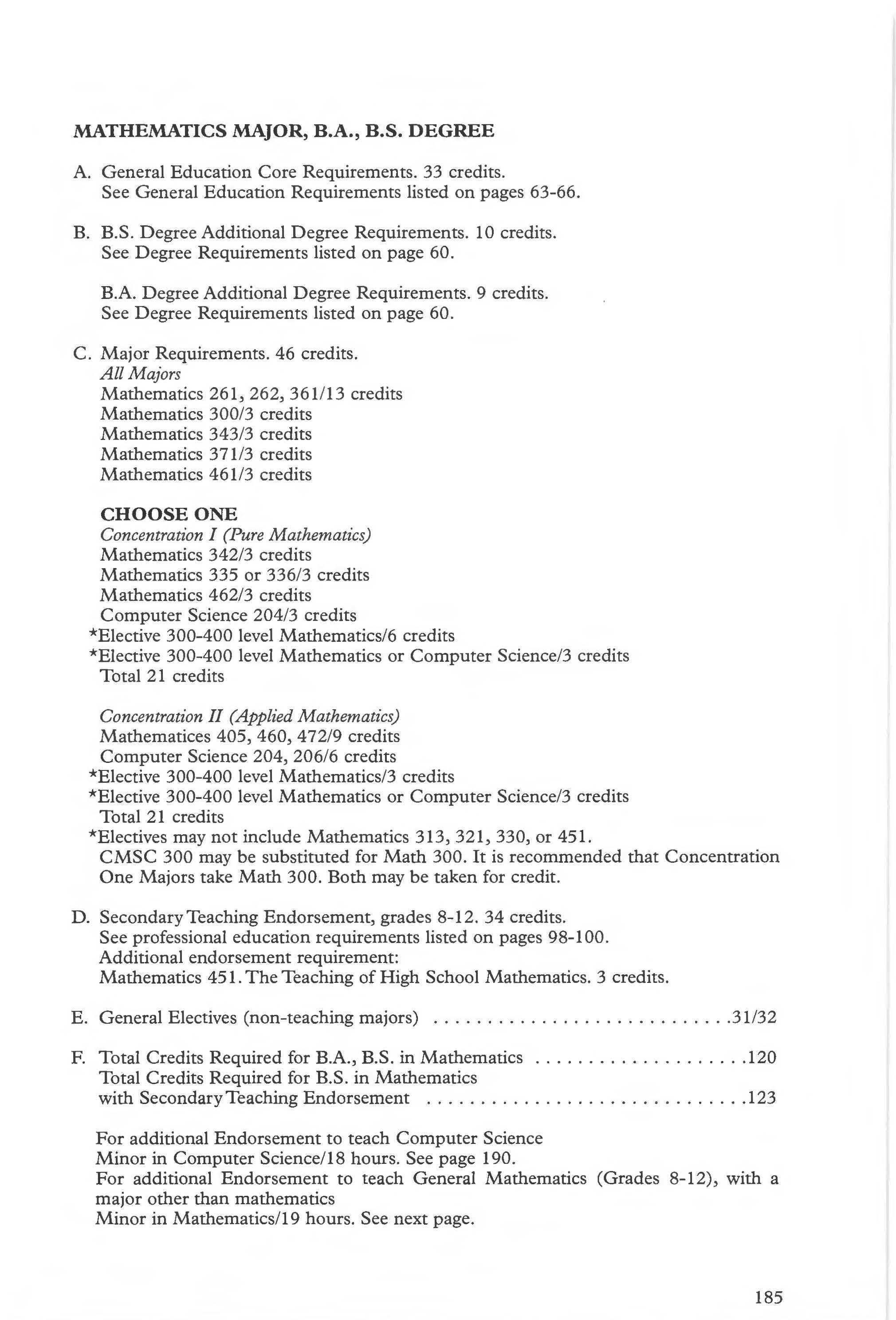 Management Courses 89-91 Marketing Courses ............ 91-92 Mathematics Courses 186-189 Mathematics Major, B.A., B.S. Degree ......... . ...... 185 Minor in Mathematics ........ . 186 Mathematics Program 184 Mathematics & Computer Science Dept. of 184