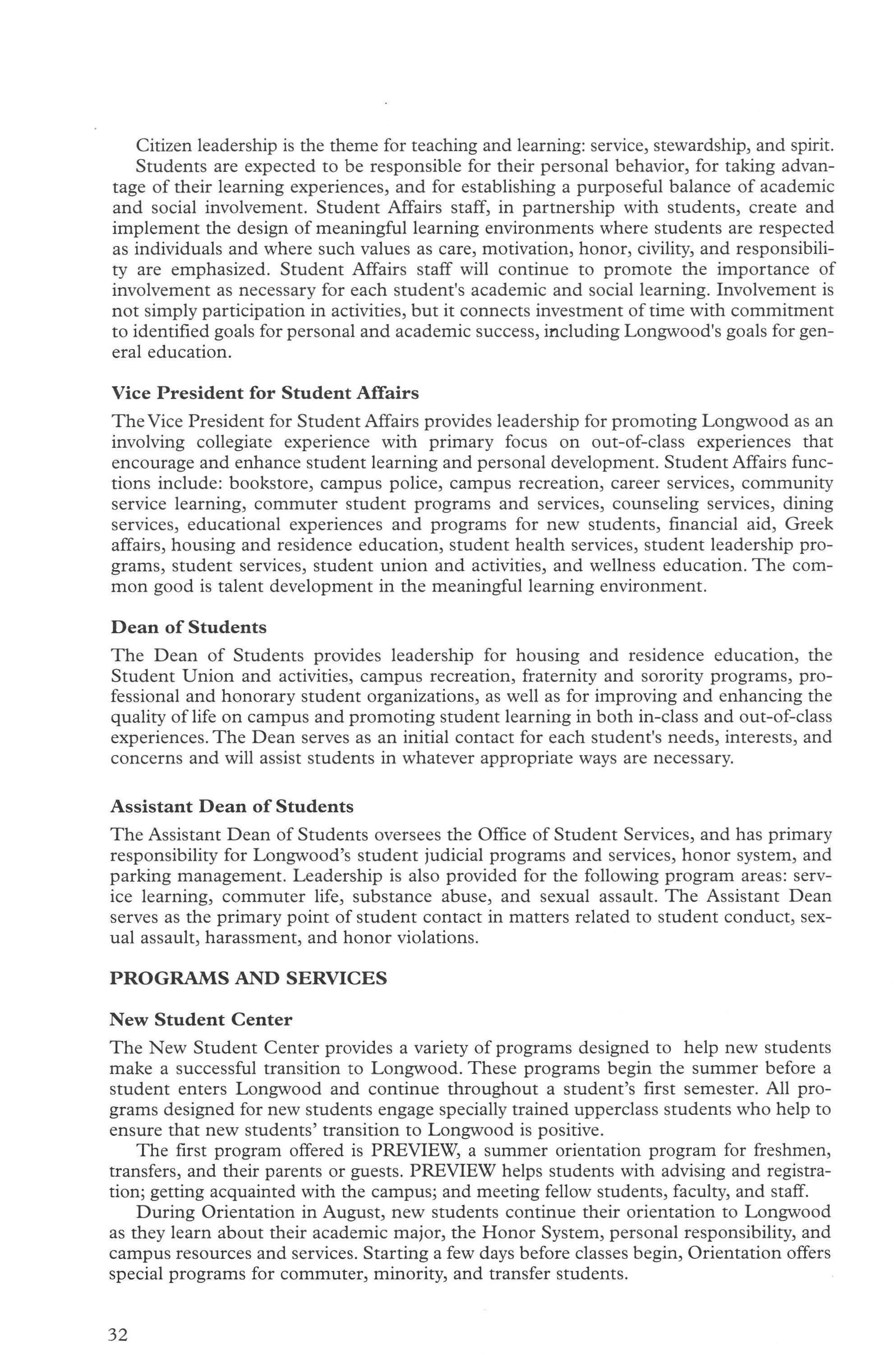 Lying at the heart ofThe New Collegiate Experience is an educational values system that is based on a very traditional belief that a college is first and foremost a community of colleagues, of people united in the pursuit of learning. Longwood College is an affirming place where students, faculty, and staff know and interact with each other on a regular basis in and out of the classroom, and for whom notions of citizenship, responsibility, honesty and civility are just as important as the content knowledge of an academic discipline. At Longwood you will not only learn to communicate effectively, think critically, solve problems, imagine creatively, and use technology adeptly, you also will learn to conduct yourself as a citizen and a leader in the world's greatest democracy.
