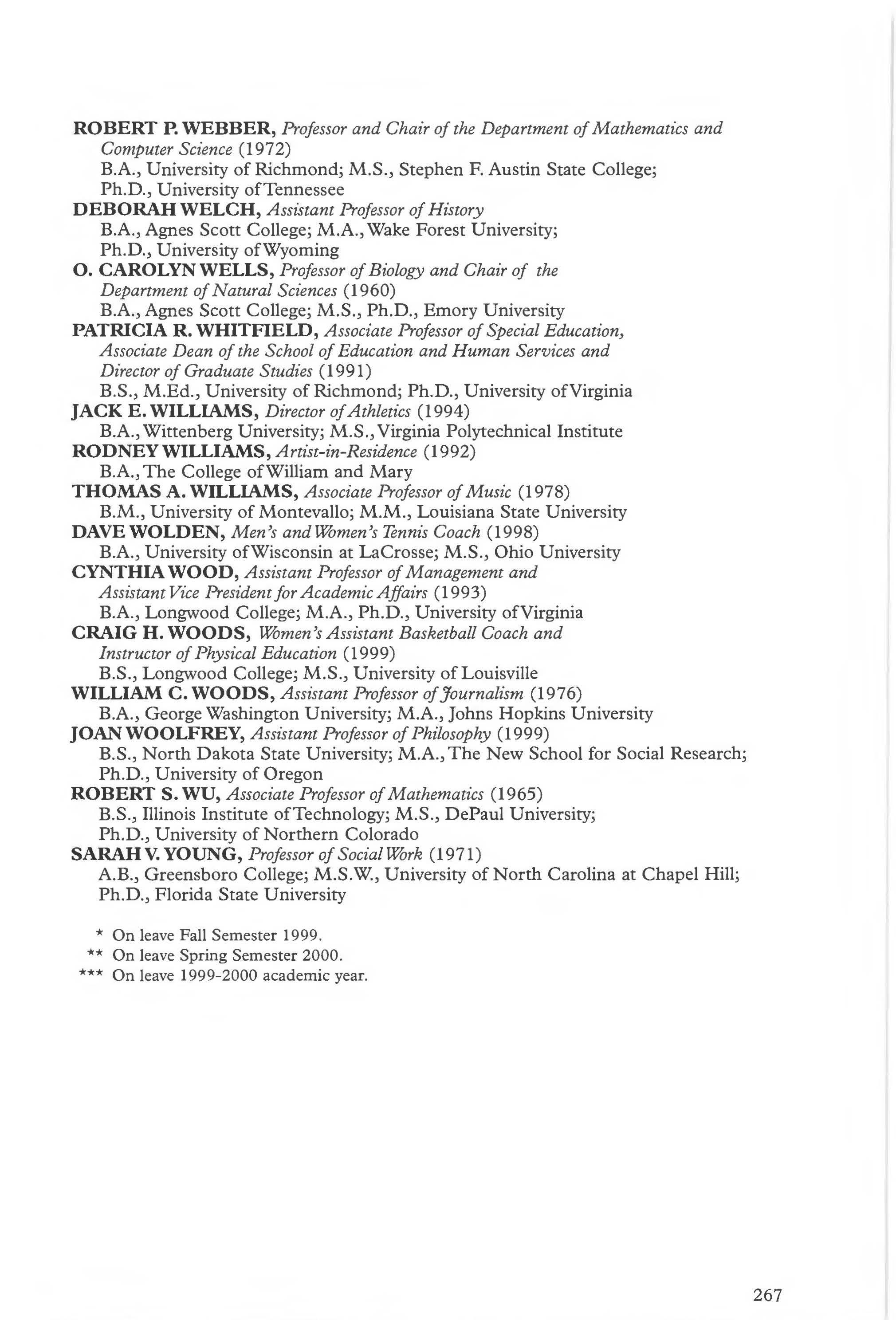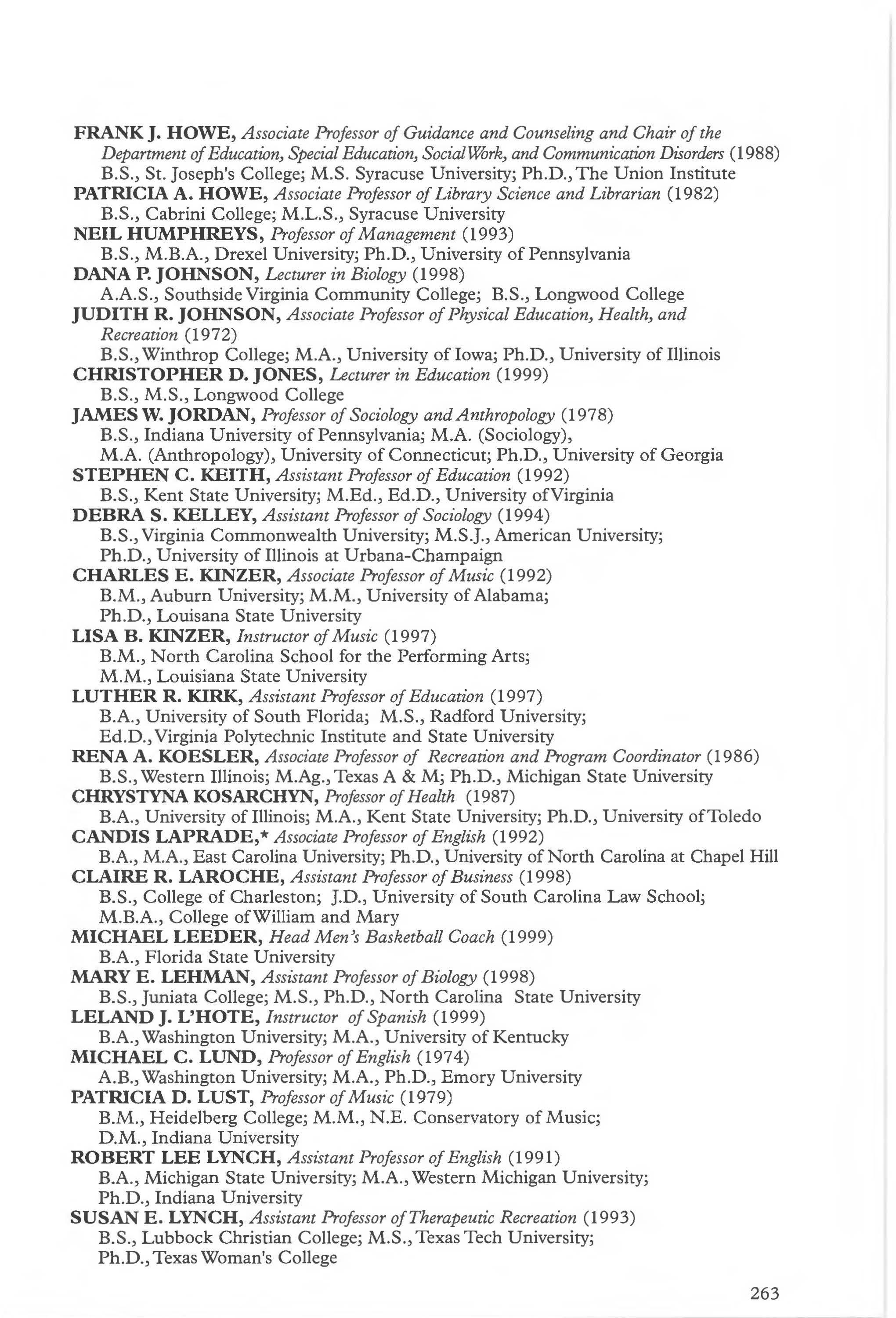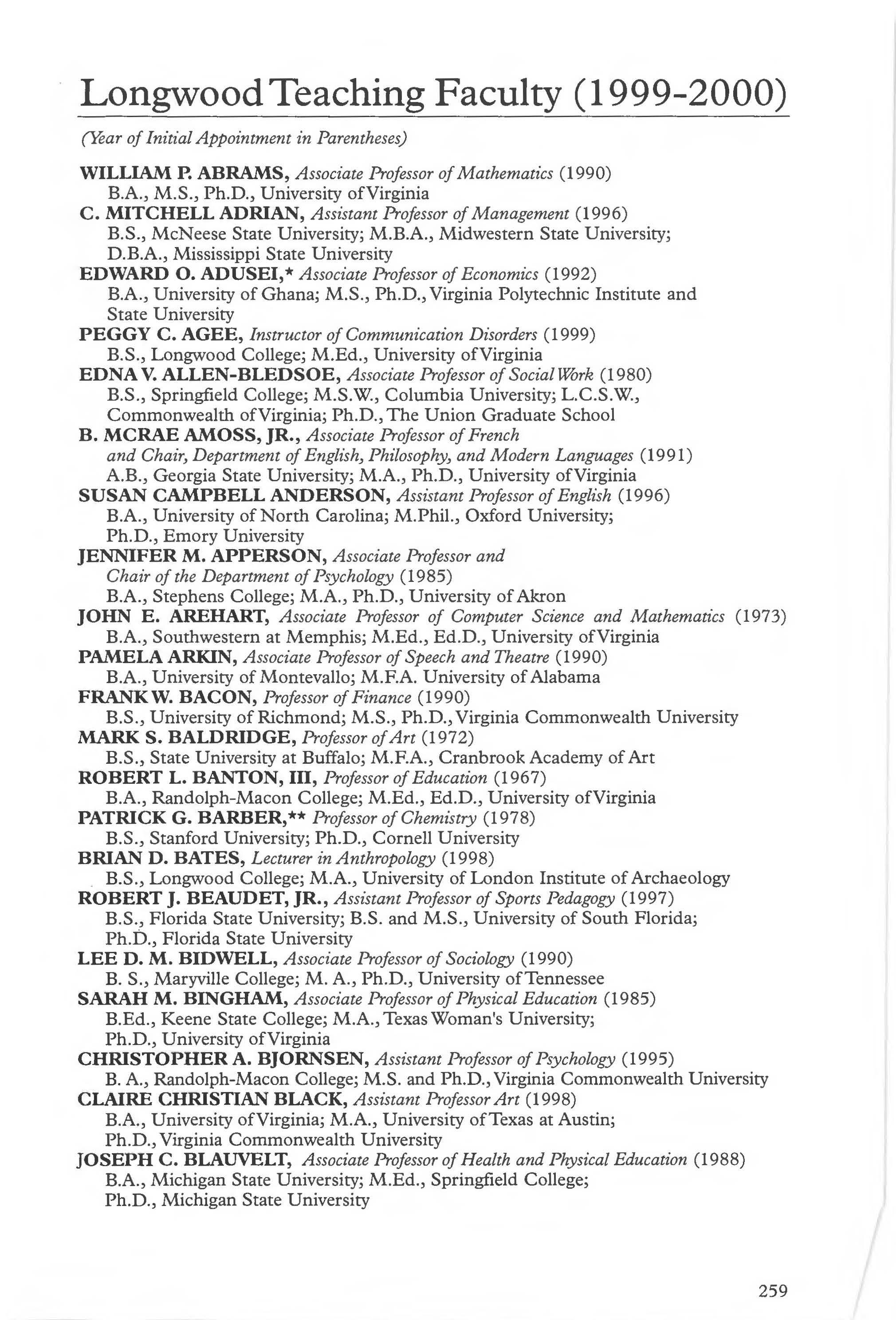 MERRY LEWIS ALLEN, Associate Professor Emerita of Mathematics NANCY A. ANDREWS, Professor Emerita of Health and Physical Education JACK M. AUSTIN, Associate Professor Emeritus of Physical Science BILLY S. BATTS, Associate Professor Emeritus of Biology ROBERT E. BLASCH, Professor Emeritus of Music ELEANOR W. BOBBITT, Professor Emerita of Health & Physical Education SANDRA J. BREIL, Associate Professor Emerita of Biology JOHN E. CARR, III, Professor Emeritus of Business ELISABETH FLYNN CHAPMAN, Professor Emerita of Art RICHARDT. COUTURE, Associate Professor Emeritus of History KATHLEEN G. COVER, Professor Emerita of Sociology WILLIAM F. DORRILL, President Emeritus, Board of Visitors Distinguished Professor, and Professor Emeritus of History GEORGE P. ELLIOTT, Professor Emeritus of Education