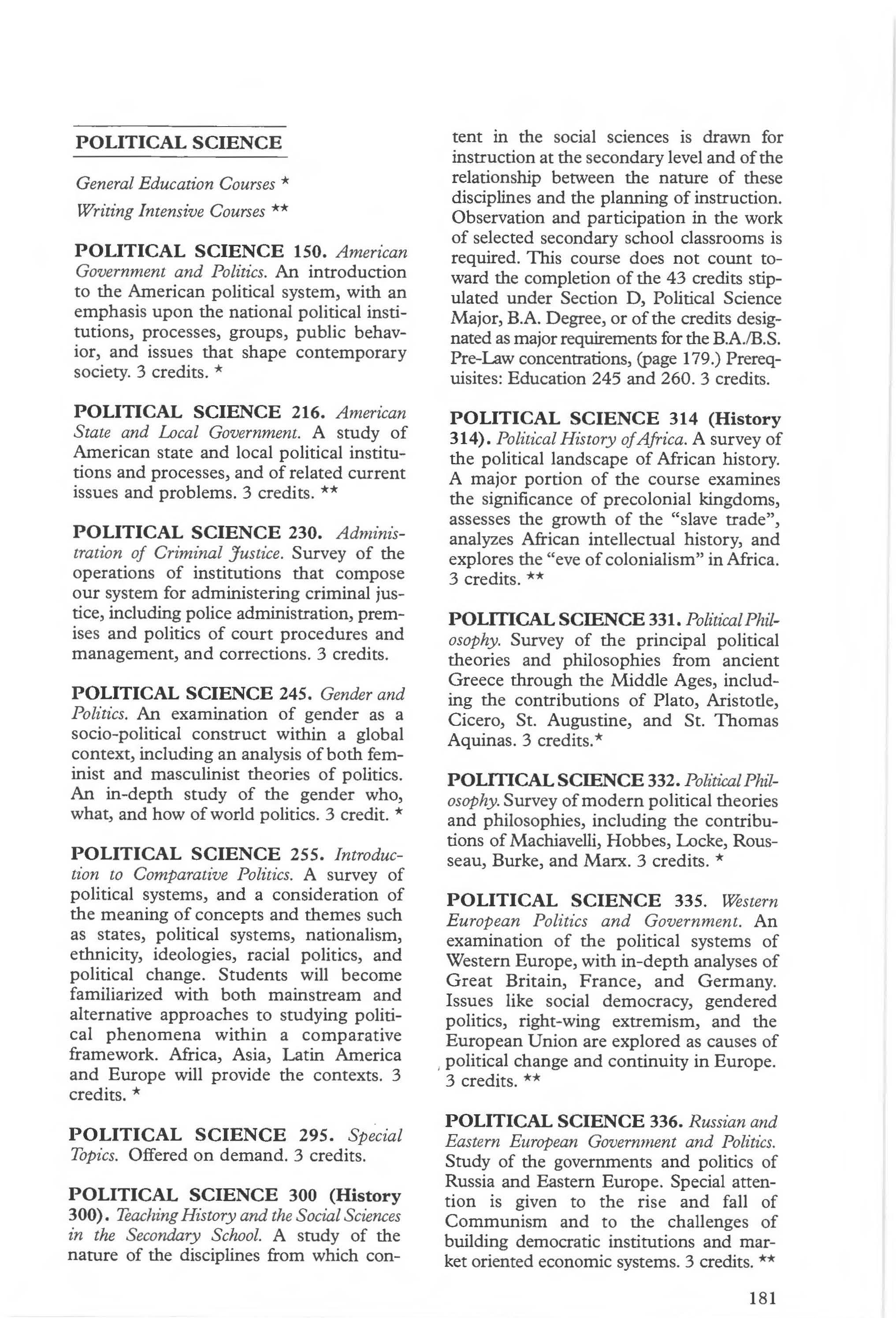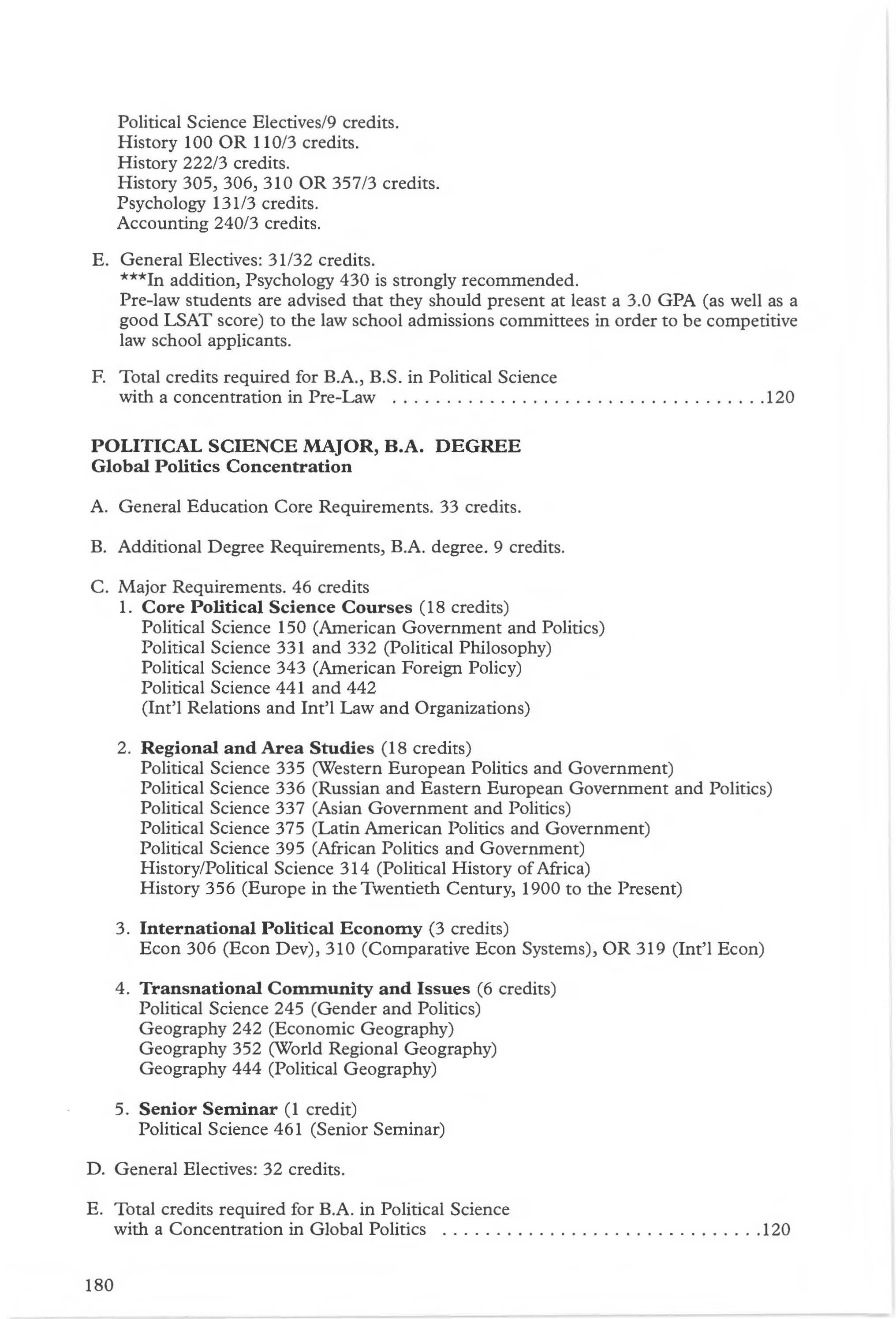 Political Science Courses .. . . . 181-183 Political Science Major, B.A., B.S. Degree 179 Pre-Law Concentration . ... 179-180 Political Science Program ..... .. . 178