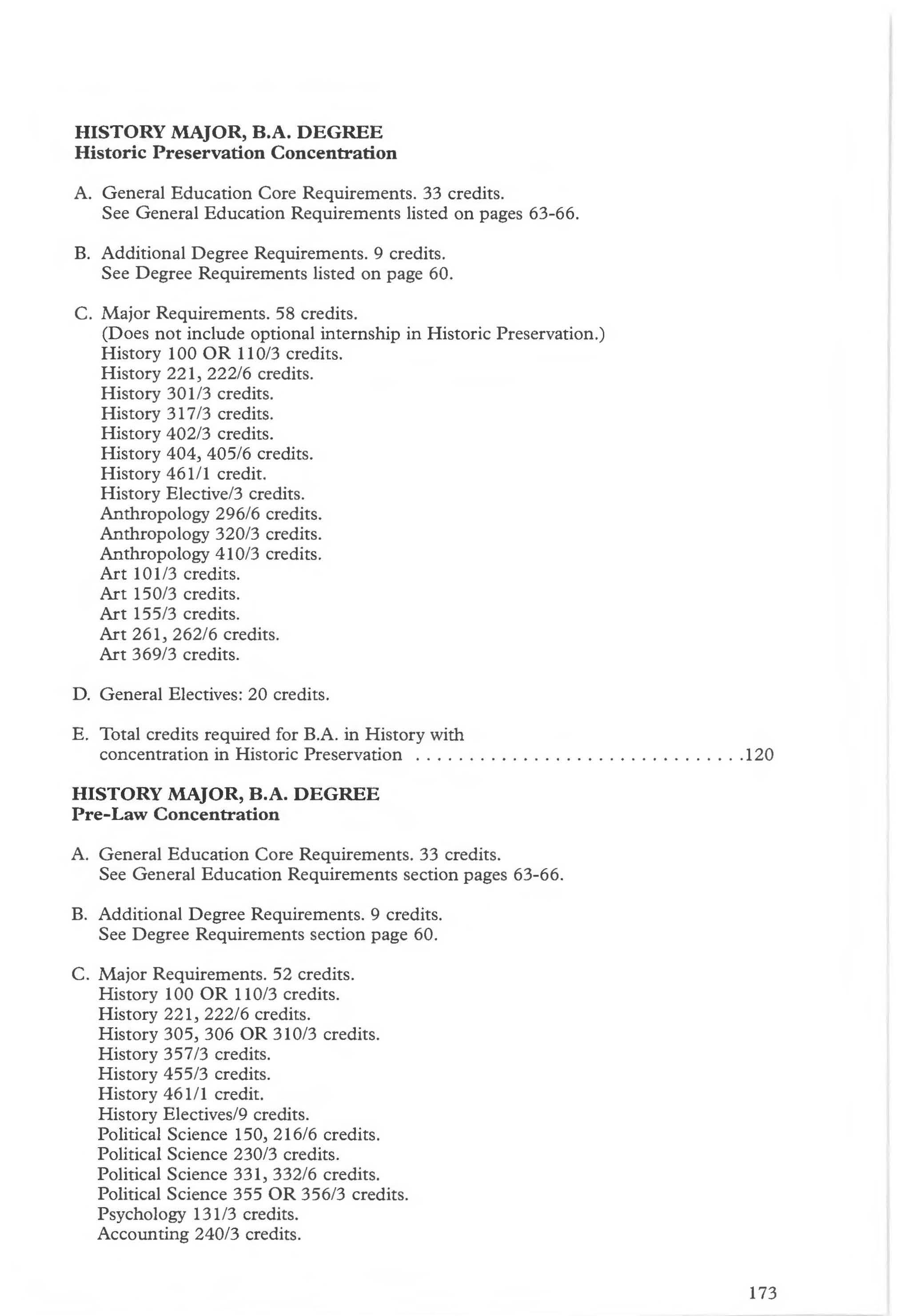 History Major, B.A . Degree 172 Historic Preservation Concentration 173 Pre-Law Concentration 173-174 History Program ........ . .. 171-1 72