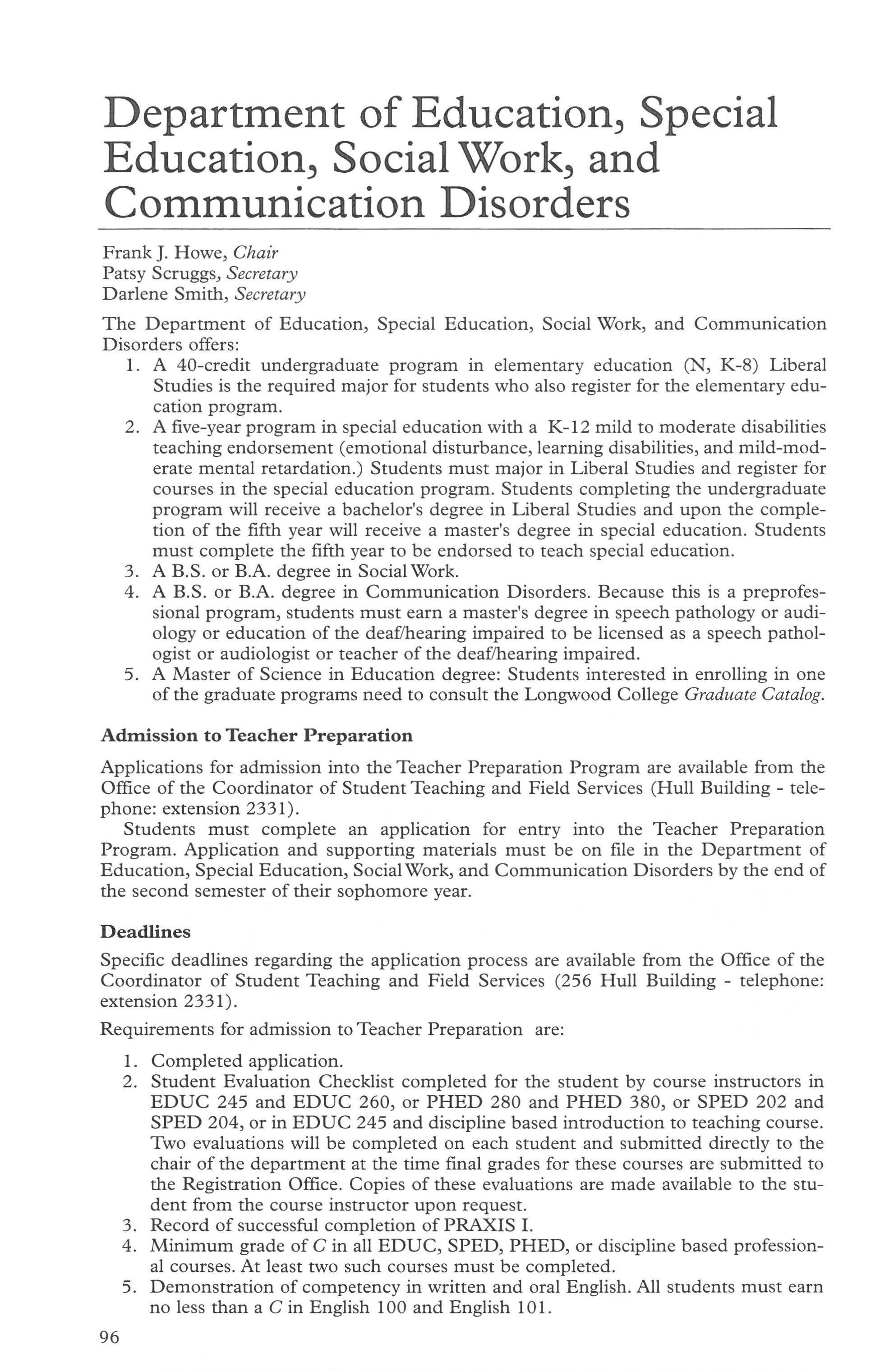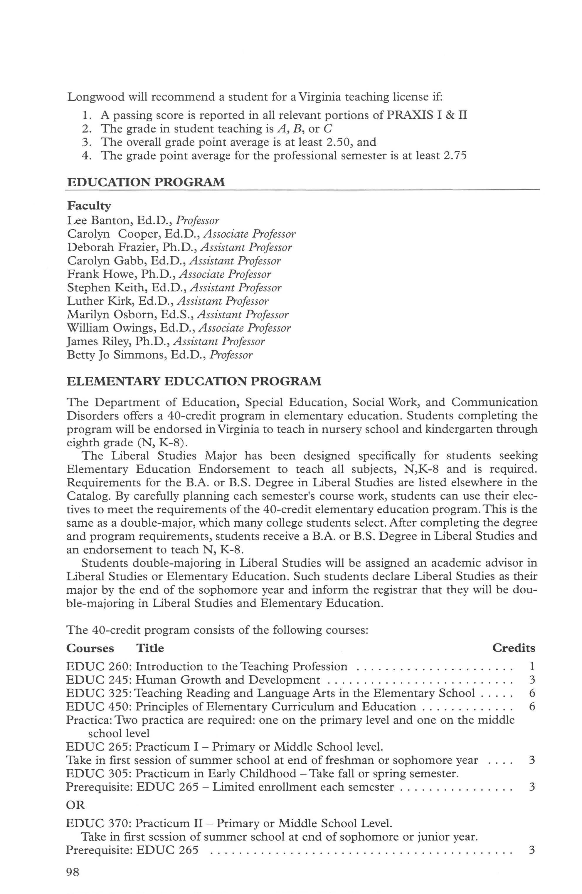 The Longwood College Undergraduate Bulletin was published in August, 1999. The Catalog and related announcements remain in effect until August 1, 2000. Longwood College is accredited by the Commission on Colleges of the Southern Association of Colleges and Schools to award bachelors and masters degrees; National Council for Accreditation of Teacher Education; Virginia State Board of Education; National Association of Schools of Music; the undergraduate Social Work Program is accredited by the Council on Social Work Education; the undergraduate Therapeutic Recreation Program is accredited by the National Recreation and Park Association in cooperation with the American Association for Leisure and Recreation; the undergraduate Business Administration Program is accredited by AACSB The International Association For Management Education; Longwood College is an accredited institutional member of the ~ational Association of Schools ofTheatre.