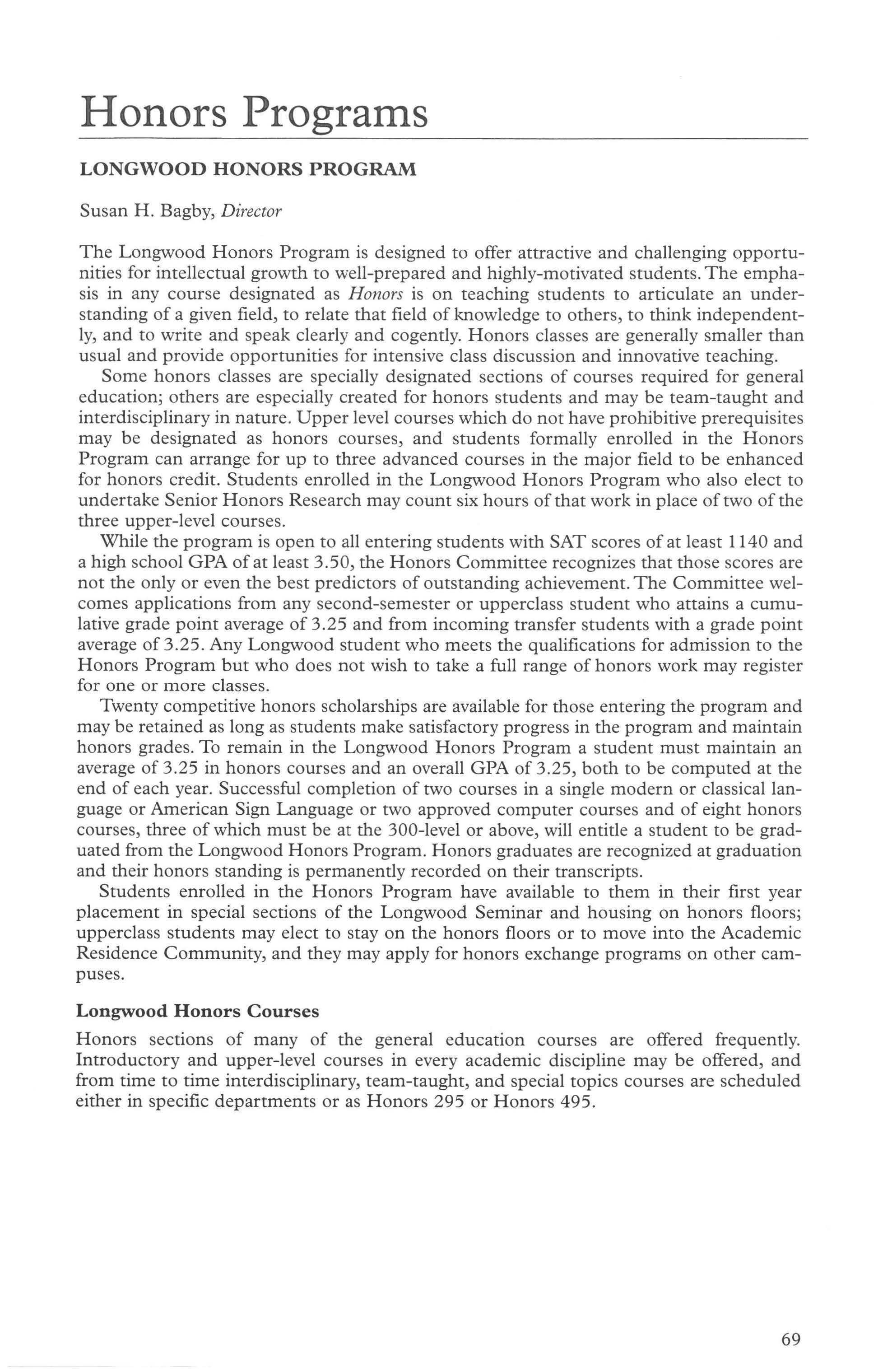 Honor Courses .. .. . .. . ...... 69, 71 Honor & Professional Societies .40 Honors Program, Longwood 69-71 Honors Research Program 70 Hours Required For Graduation . . . . 59