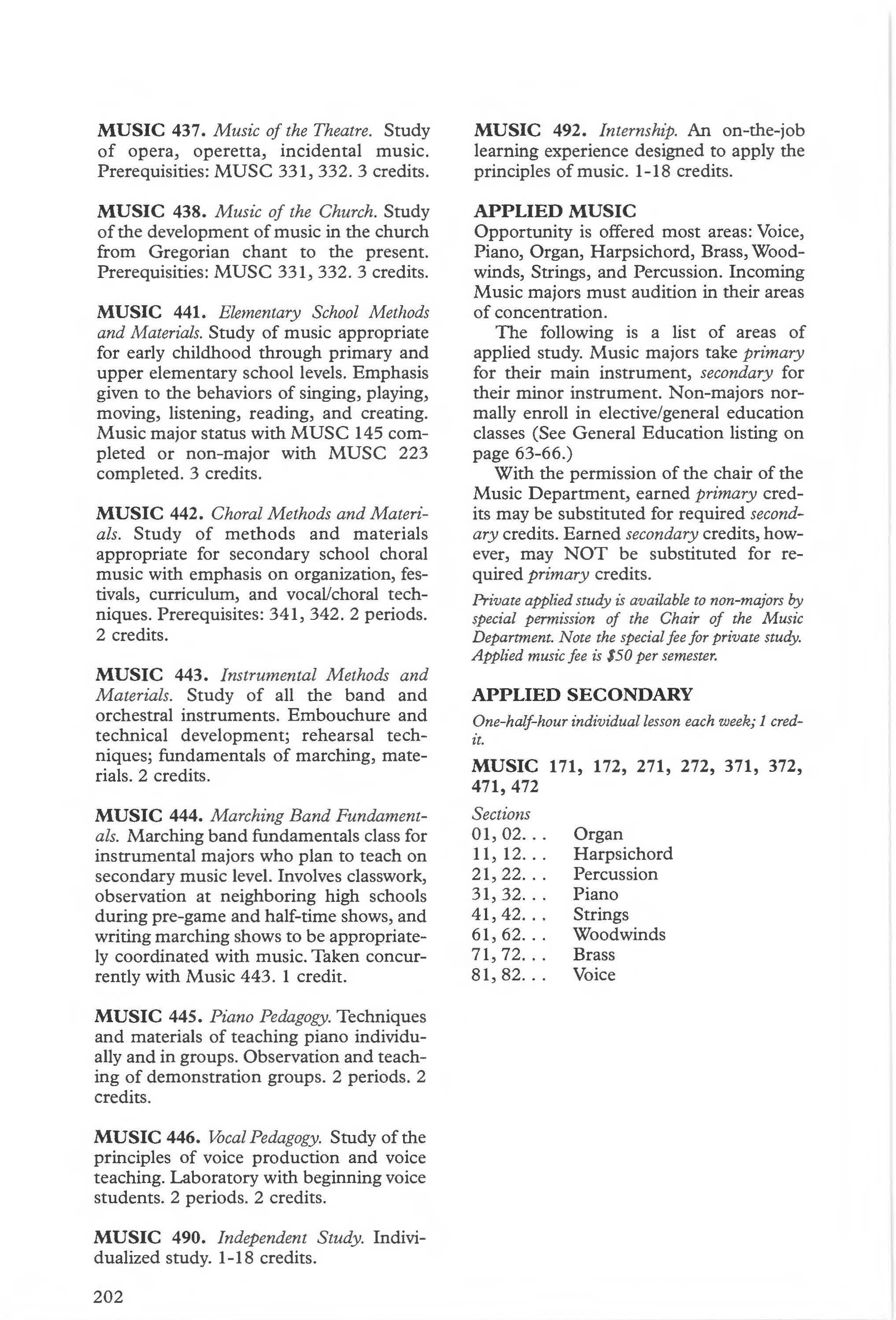 Mission Statement . ... . .. . ....... 7 Modern Languages Courses 164-170 Modern Languages Major, B.A. Degree . .... . ... . ... 162-163 Minor in French, German or Spanish 164 Modern Languages Program 161 Mortar Board .40 Music, Bachelor of Music Concentration in Composition ... 198 Music, Bachelor of Music Concentration in Education 195-196 Music, B.A . in Visual and Performing Arts Concentration in Music .... 195 Music, Bachelor of Music Concentration in Performance 197-198 Music Courses . .. .. .. .. .... 199-204 Music, Department of 194 Music Minor ... .. ... .... . . . 199 Natural Sciences, Dept of 205 New Student Center 32-33 Overload Fee 17 Non-traditional Students . . ....... . 13 Orientation ... ........ . . . . .. 32-33 Part-Time Students 19 Pass/Fail Courses .47-48 Payment of Fees Plan . ... ... ..... 20 Philosophy Courses . ... . . ... 15 8-160