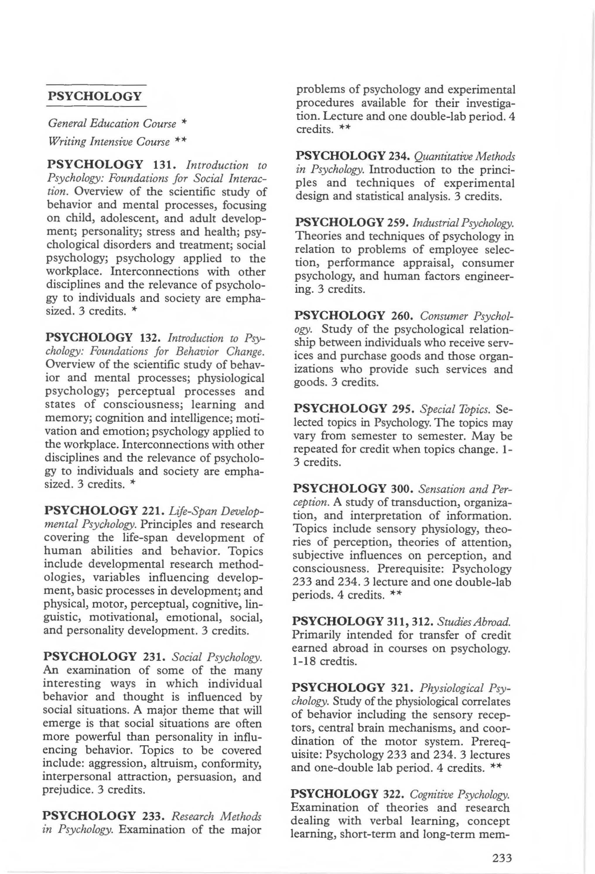 Pre-Veterinary Medicine ......... 228 Student Activities ............... 35 Probation 50 Student Affairs 31-32 Probation and Suspension Policy 50 Student Affairs, Programs of Study 56 Vice President for 31-32 Psychology Courses 233-235 Students, Dean of ............ 31-32 Psychology, Dept. of ..... . ...... 231 Student Assessment 1 Psychology Major, B.S. Degree 231 Student Employment 38 Psychology Minor 232 Student Goals 31 Psychology Program ............ 231 Student Government Association .... 39 Purpose Statement ............... 7 Student Health Services .......... 37