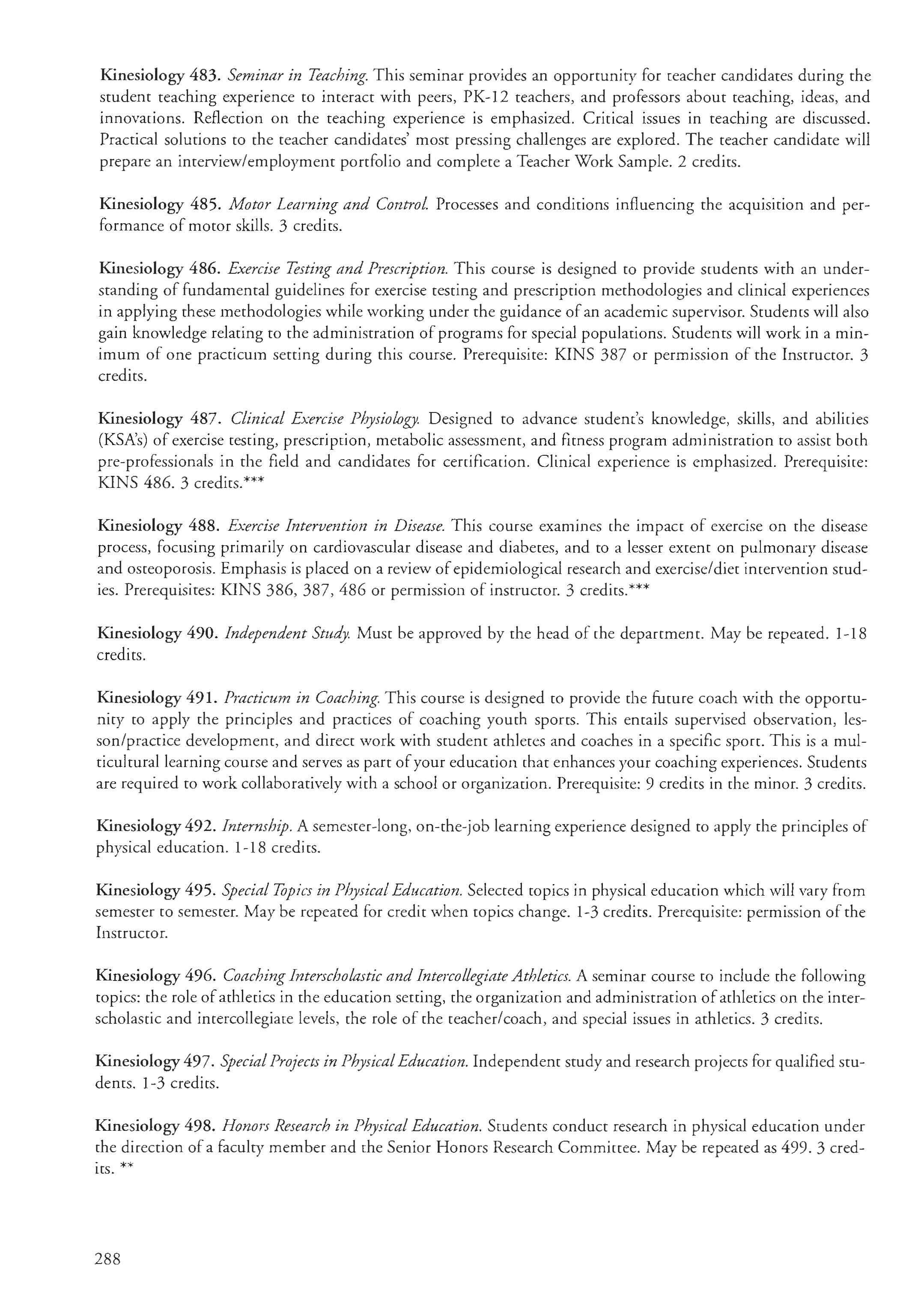 Kinesiology 495. Special Topics in Physical Education. Se lected topics in physical education which will vary from semester to semester. May be repeated for credit when topics change. 1-3 credits. Prerequisite: permission of the Instructor